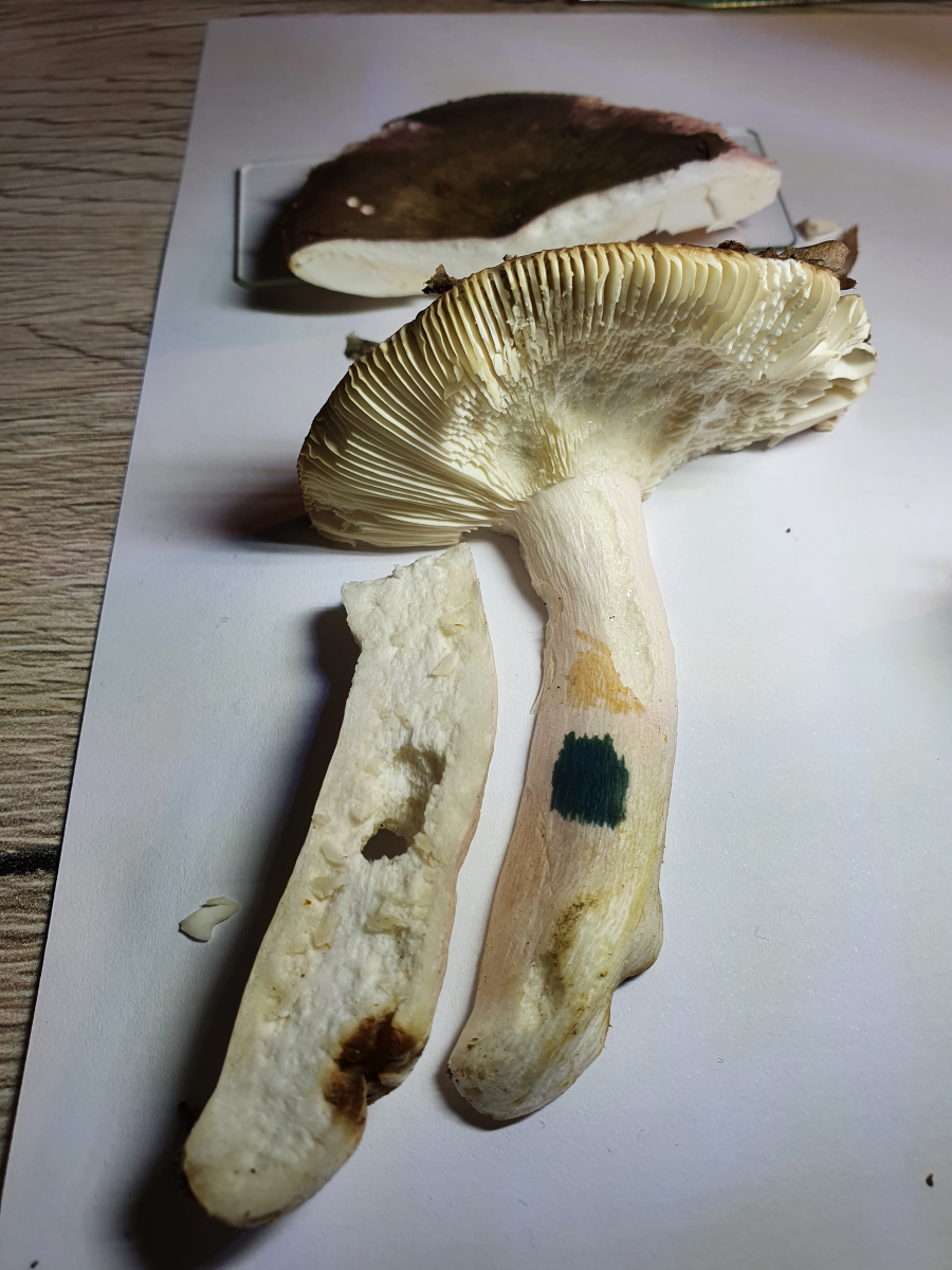 Hier landete ich bereits durch die makroskopischen Merkmale und den milden Geschmack schnell bei R. integra. Auch das Sporenpulver sollte mit IVc wie die Faust aufs sprichwörtliche Auge passen, genau wie die chemischen Reaktionen: Guajak sehr schnell (direkt) tief türkis-grün, FeSO4 dezent bräunlich-gelblich.