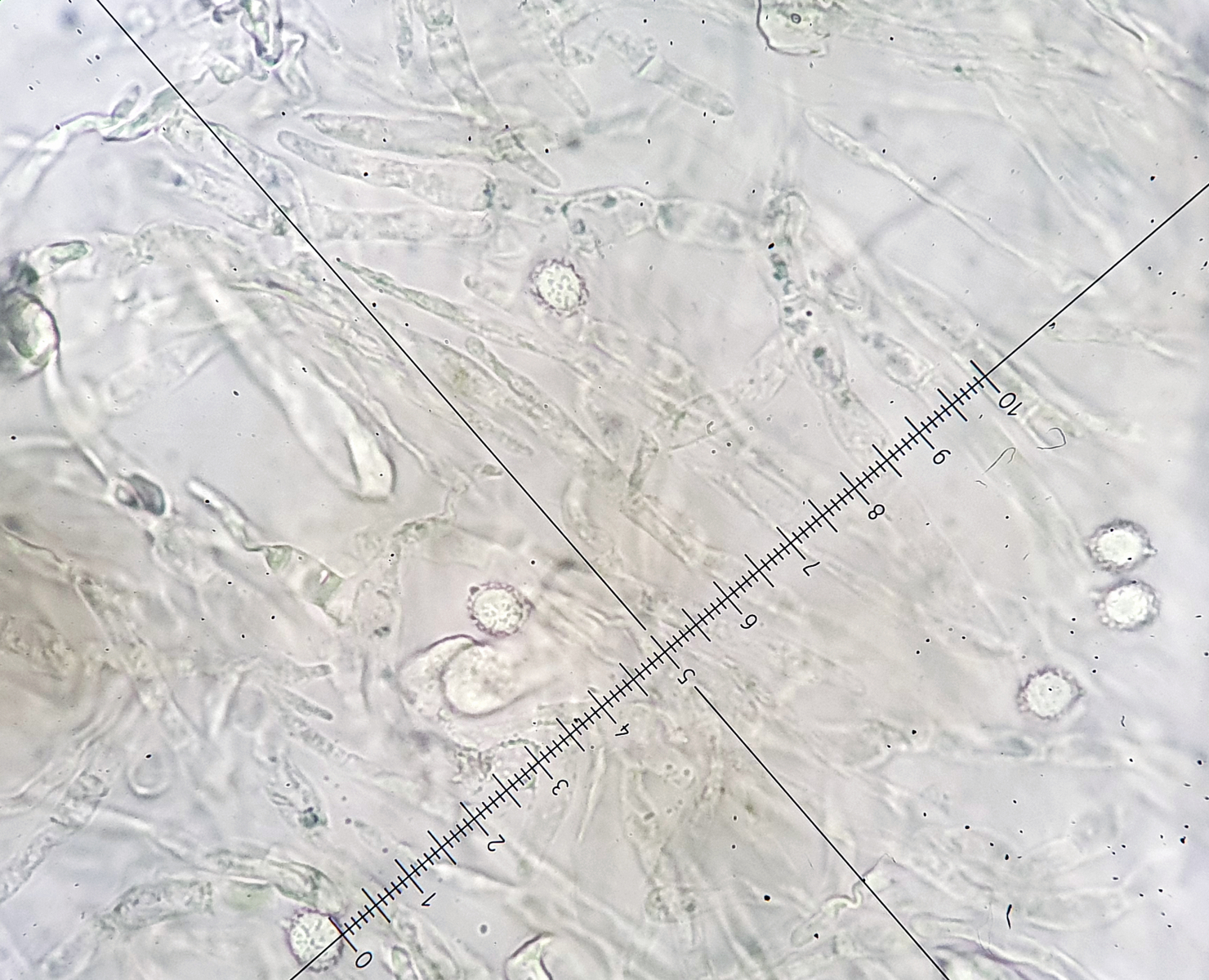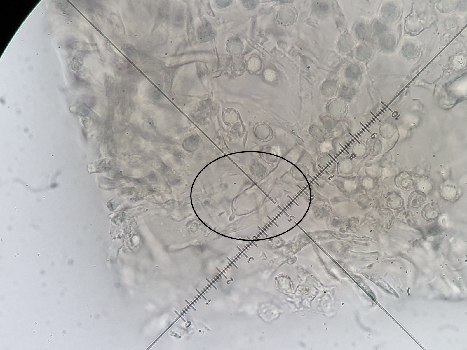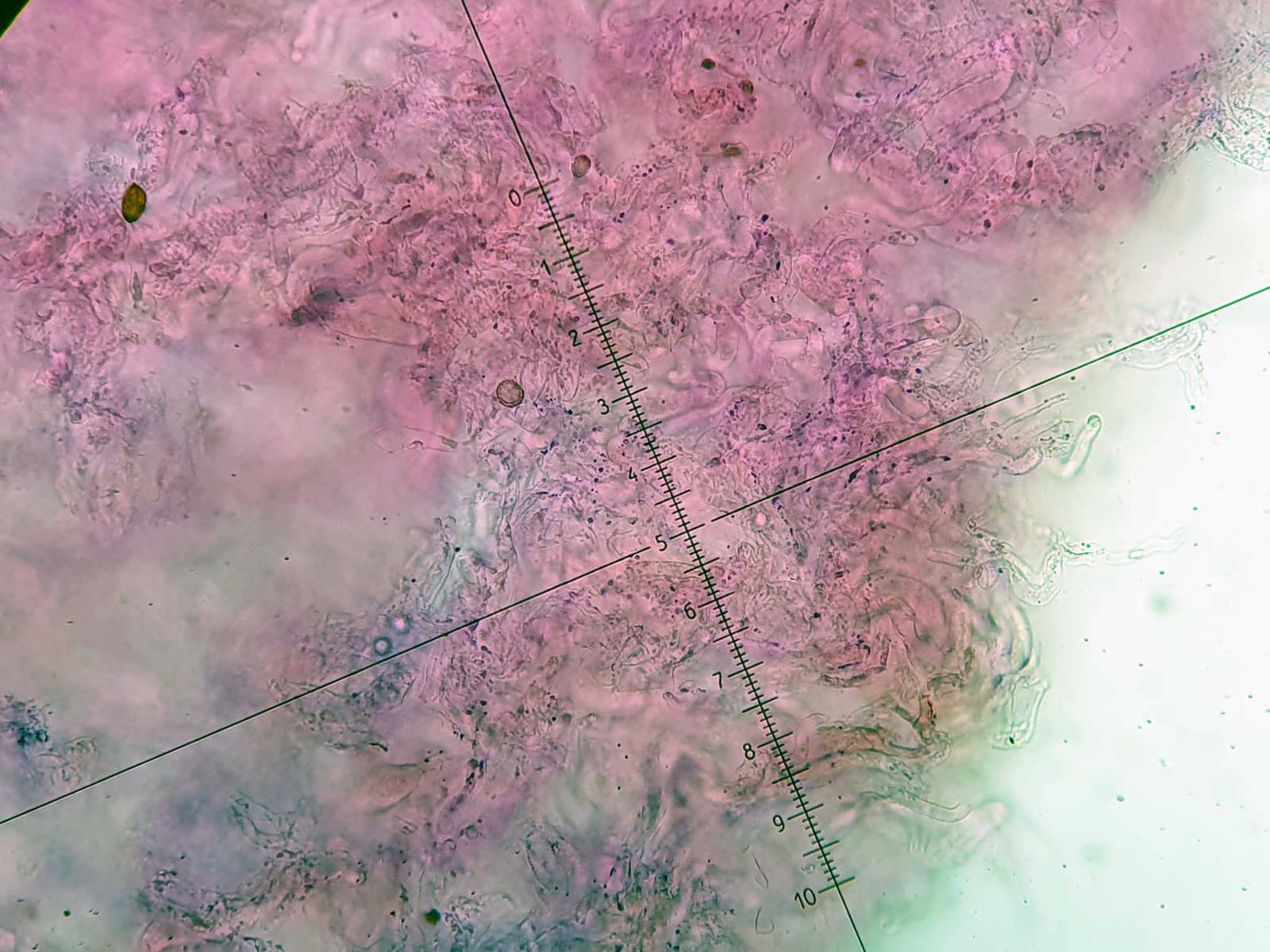 Die Hutdeckschicht zeigte in Wasser (Kongorot habe ich derzeit leider immer noch nicht zur Verfügung) am ehesten keulige Elemente. Interessant waren zahlreiche rötliche Einschlüsse in den Hyphen und bei genauem Hinsehen auch in Zystidenköpfchen (ich habe das mal eingekreist, man muss gut auf die umgebende Struktur achten, im Mikroskop war das deutlicher).
