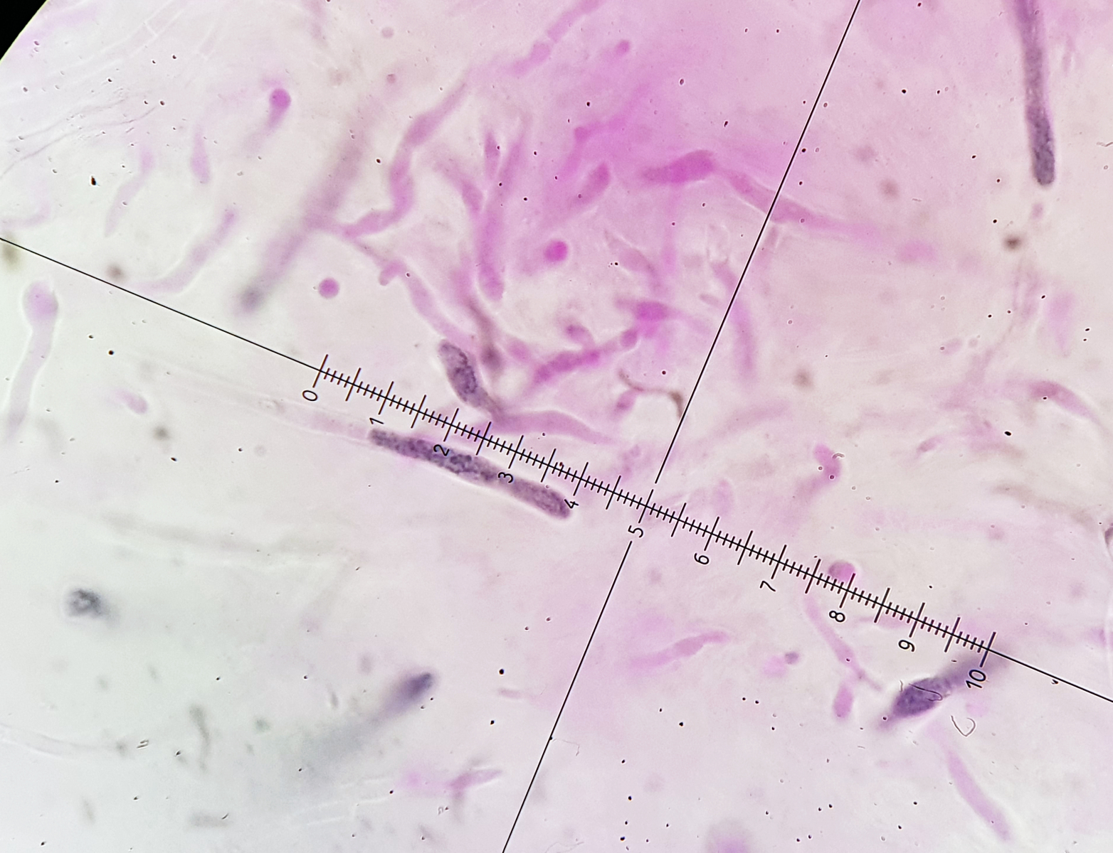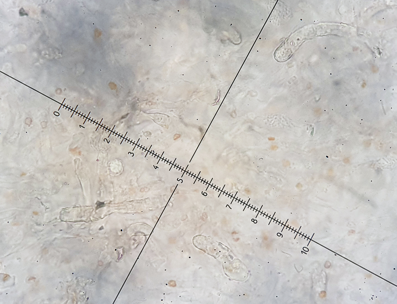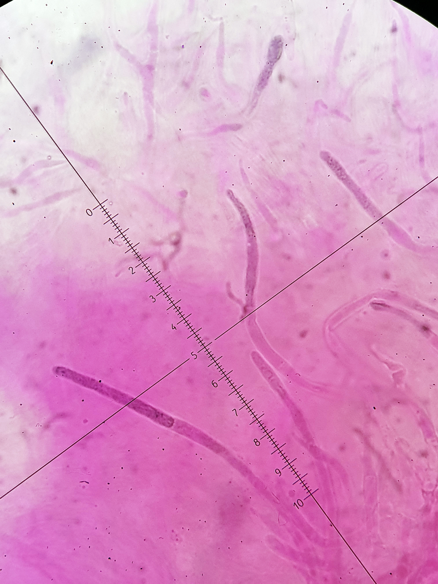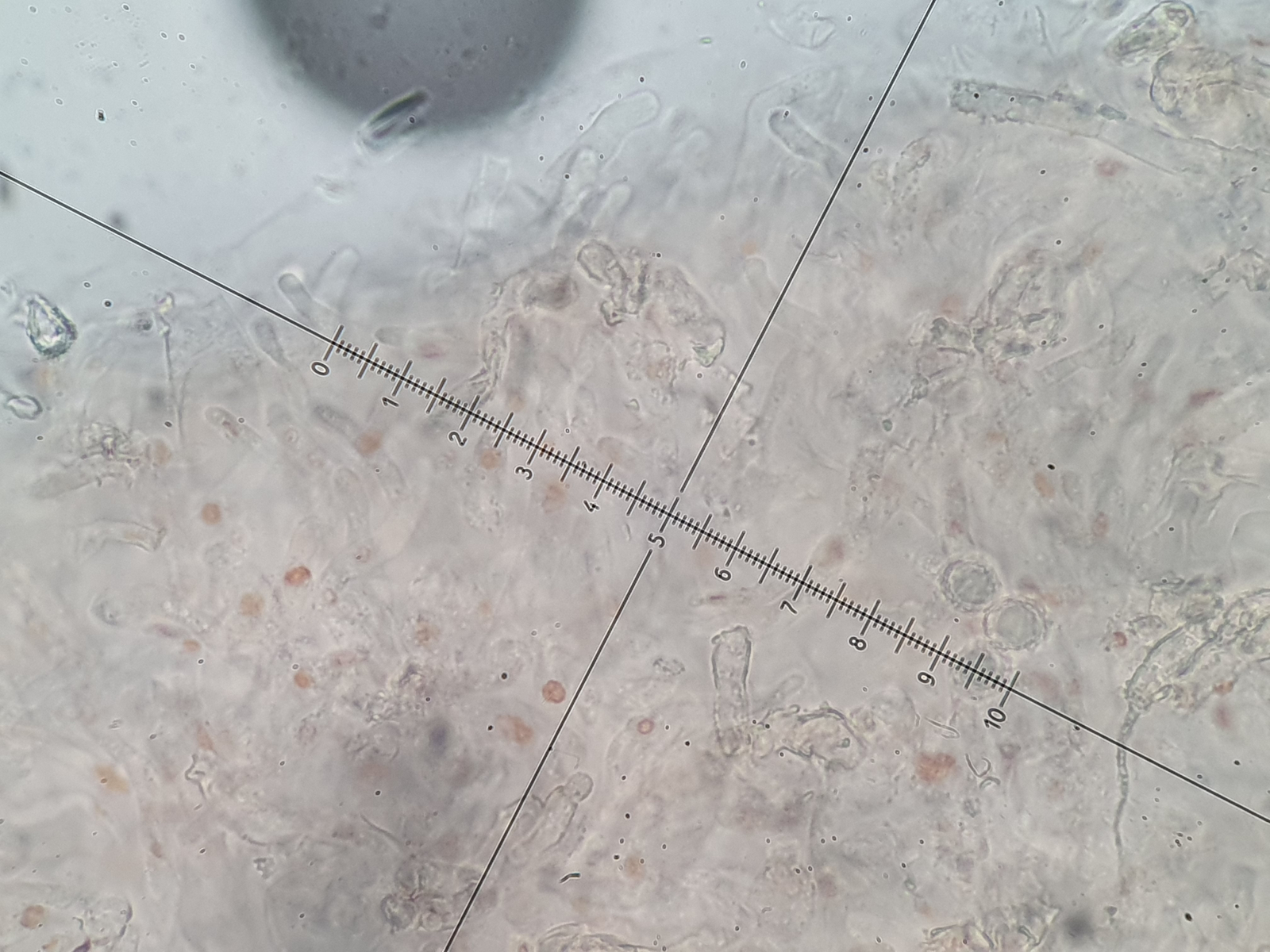 Die Hutdeckschicht zeigte in Wasser (Kongorot habe ich derzeit leider immer noch nicht zur Verfügung) am ehesten keulige Elemente. Interessant waren zahlreiche rötliche Einschlüsse in den Hyphen und bei genauem Hinsehen auch in Zystidenköpfchen (ich habe das mal eingekreist, man muss gut auf die umgebende Struktur achten, im Mikroskop war das deutlicher).