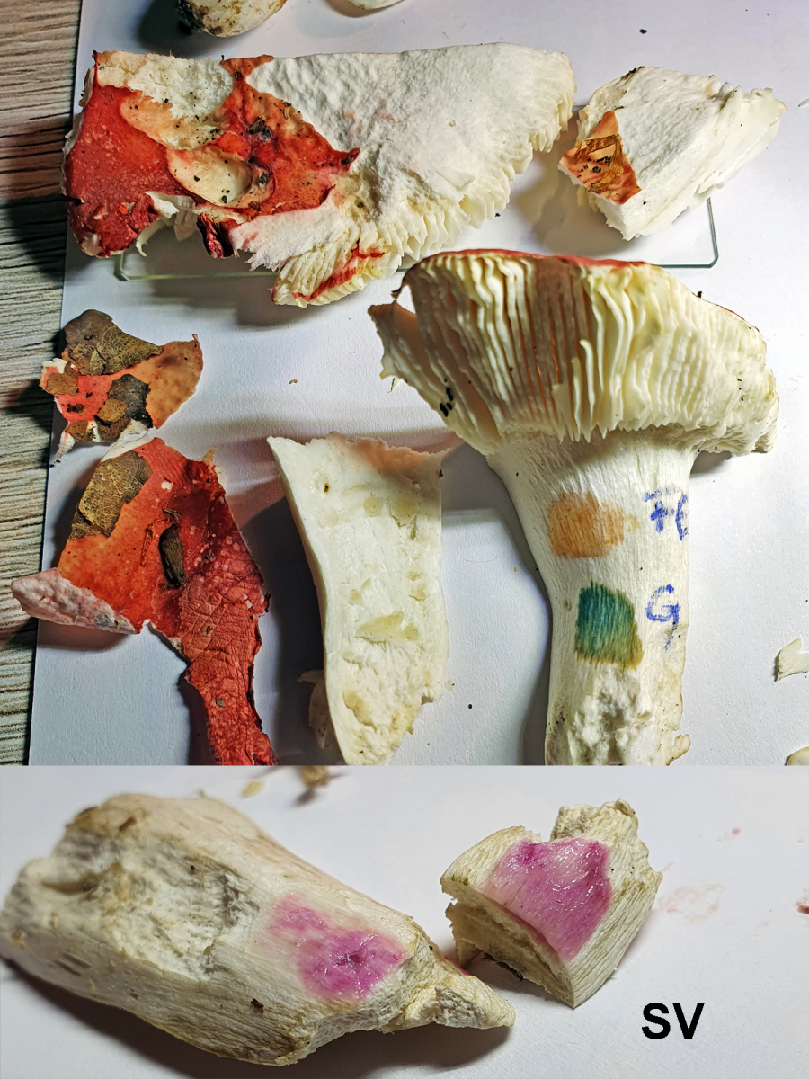 Ich probierte am ein Tage alten Exsikkat SV aus und siehe da, eine prompte Reaktion ... also doch zumindest irgendwas aus der Gruppe Roseinae. Aber was? Velutipes? Den hatte ich neulich und er war mir anders erinnerlich (auch wenn von den Sporen und den IPH her durchaus passend). Aber das letzte Mal zeigte sich eine knallig eosinrote Verfärbung am Stiel. Die Reaktion des Exsikkats hier zeigte sich pink (!?!?), definitiv nicht rot (siehe Bilder). Ich bleibe schlussendlich ratlos. Vielleicht habt Ihr noch einen Tipp: