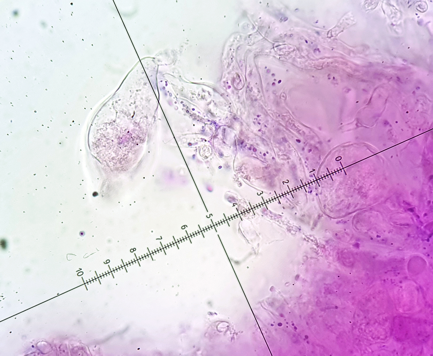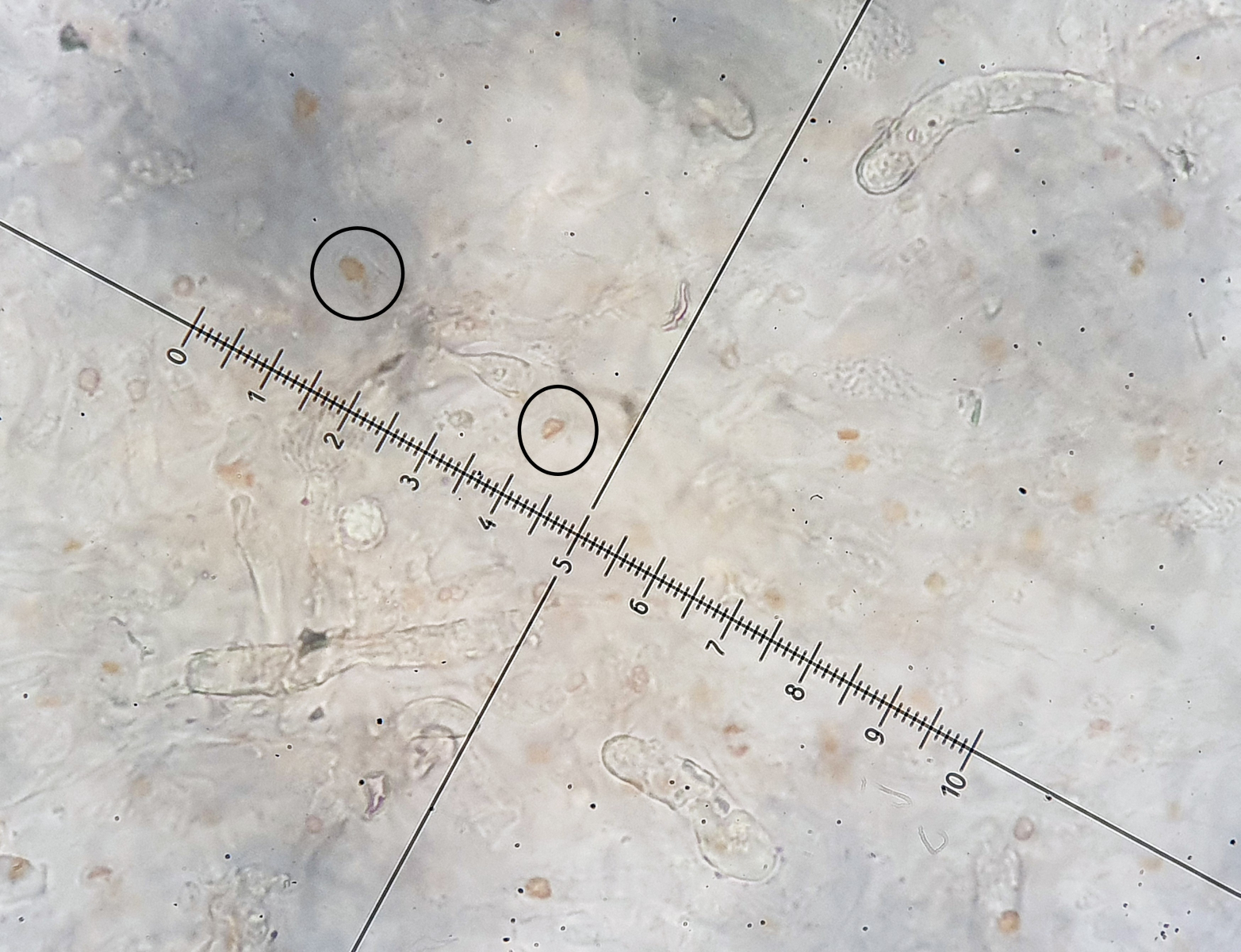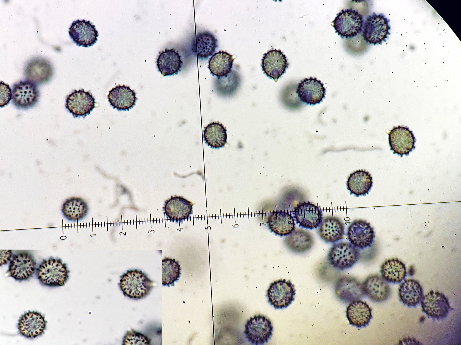 Leider sollte die mikroskopische Bestimmung später auch sehr mühsam werden. Das Sporenpulver landete bei IIa. Die Sporen zeigten sich amyloid, 7-8x6µm mit ca. 0,5µm hohen Warzen, welche deutliche Verbindungslinien aufwiesen. Auch der Apiculus zeigte sich deutlich.