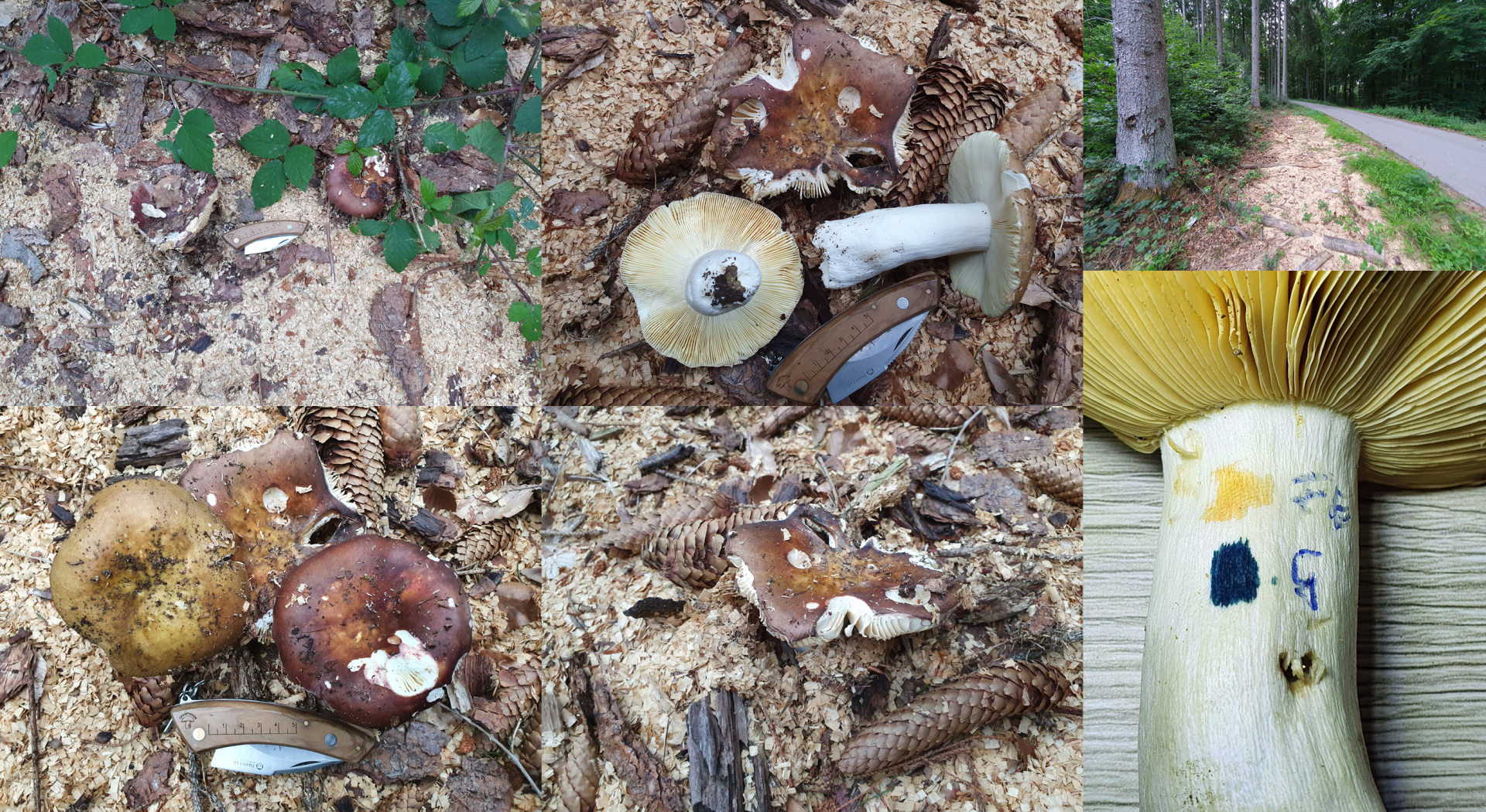 Zu guter letzt dann noch ein für mich neuer Fund. Bereits auf dem Rückweg Richtung Parkplatz entdeckte ich auf einem abgeräumten Holzlagerplatz unter Fichten vier sehr stattliche Russula (bis 17cm Hüte und Stielen teilweise um die 10cm). Interessanterweise zwei Paare, die etwas entfernt voneinander standen, mit hoher Wahrscheinlichkeit doch die selbe Art waren und dennoch (durch die etwas versetzten Standorte?) unterschiedliche Huttöne zeigten. Die Grundfarbe war deutlich braun, aber das zweite Pärchen zeigte nochmals deutlich weinrote Einschläge (vergleiche Bild). Die Lamellen zeigten sich ockergelb, dicht beieinander, gegabelt und angewachsen: