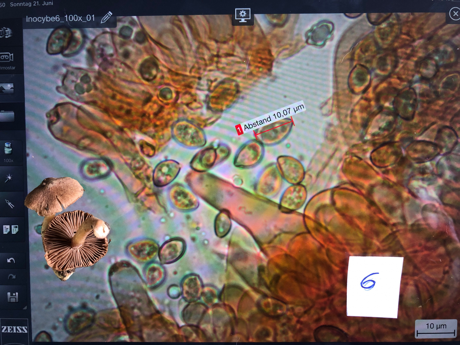 4 Unter Fichten. Mein Tipp ist der Inocybe nitidiuscula - Frühlings-Risspilz. Leider ist das Foto von unter dem Röckchen vor Ort misslungen. Deshalb am Schluss ein Foto auf dem IPad mit den zugehörigen Mikromerkmalen. Geruch schwach spermatisch.