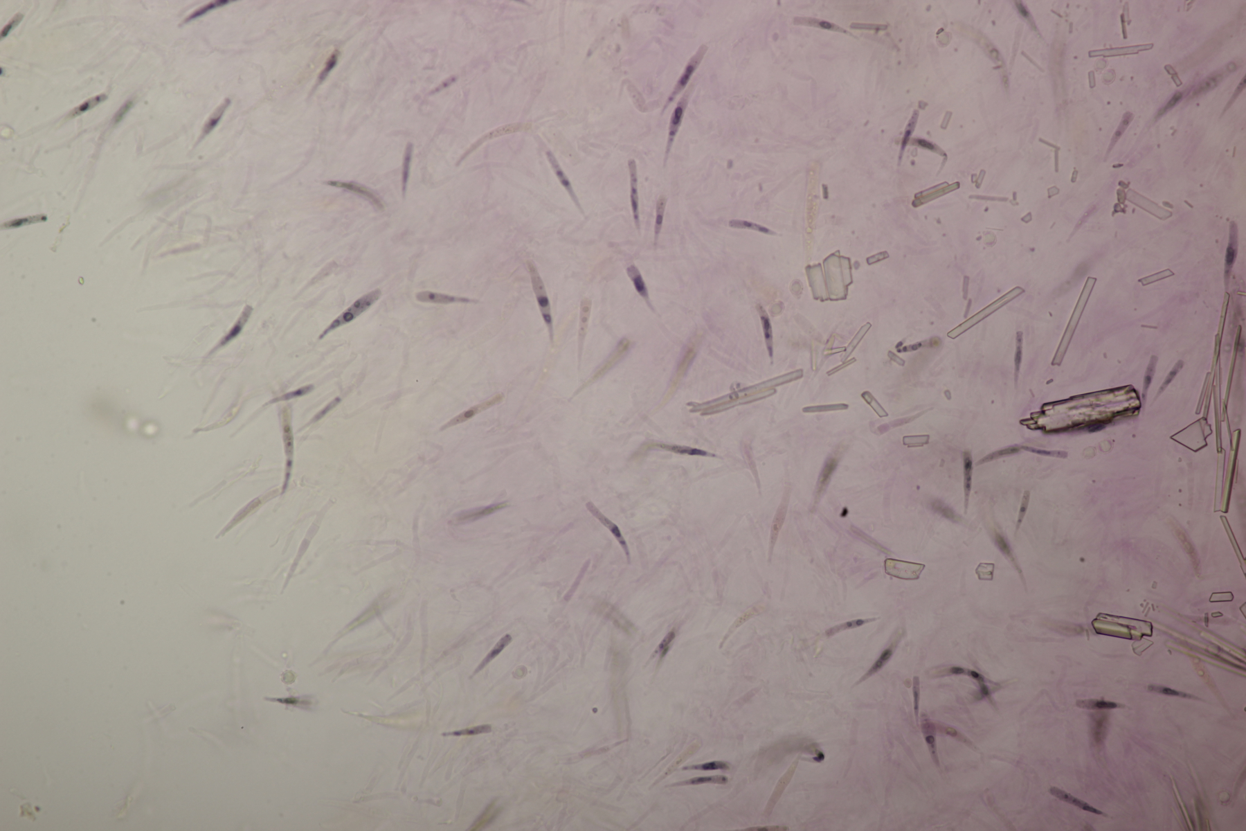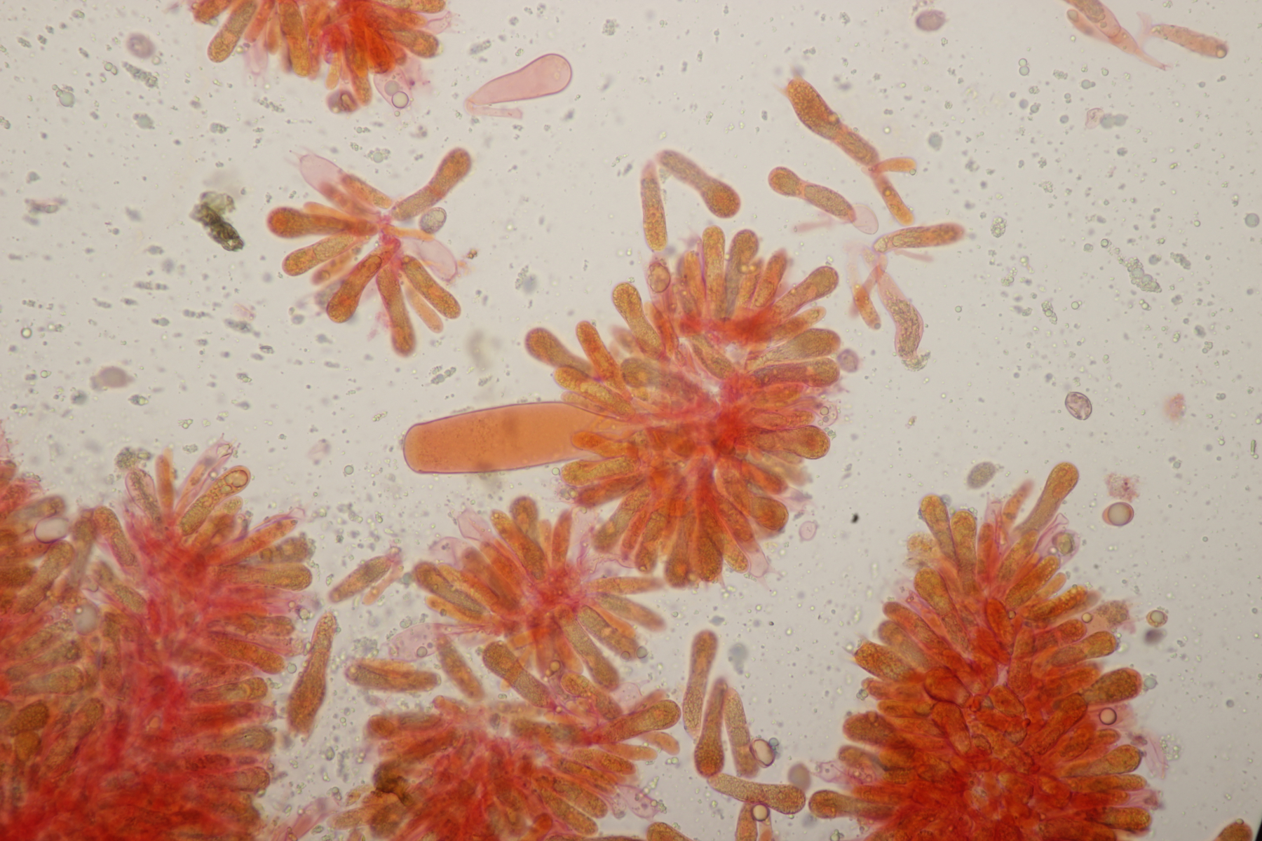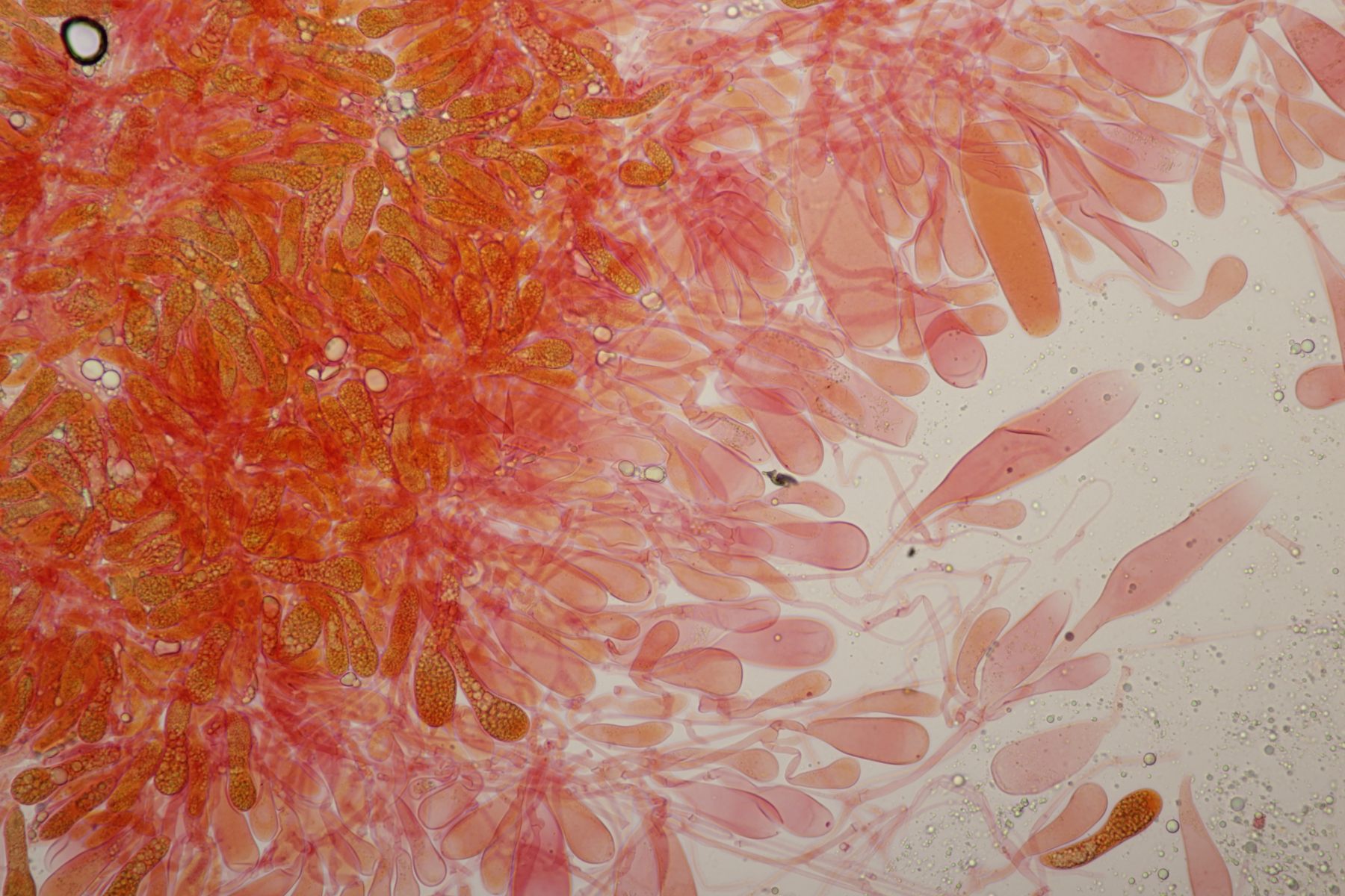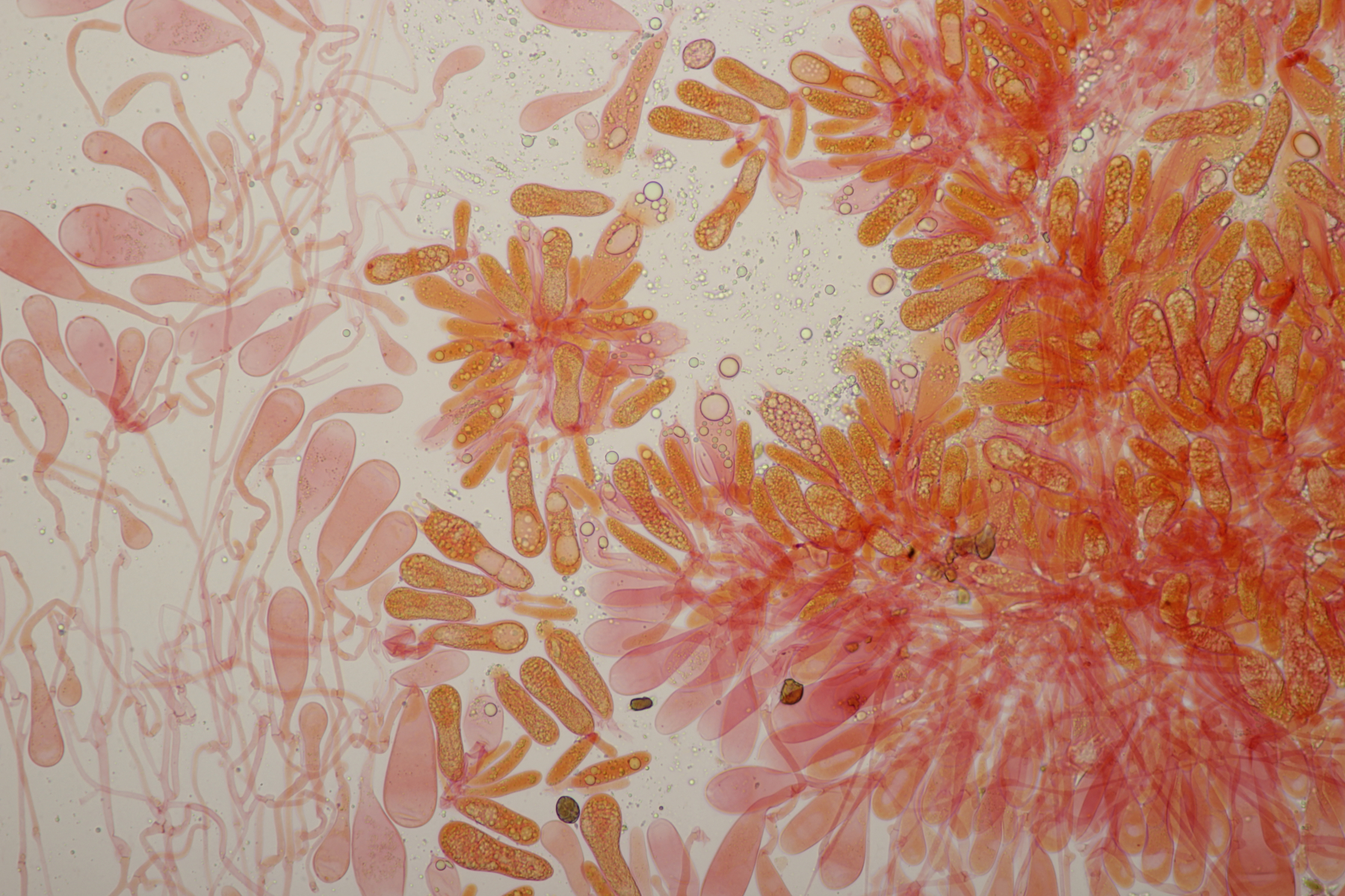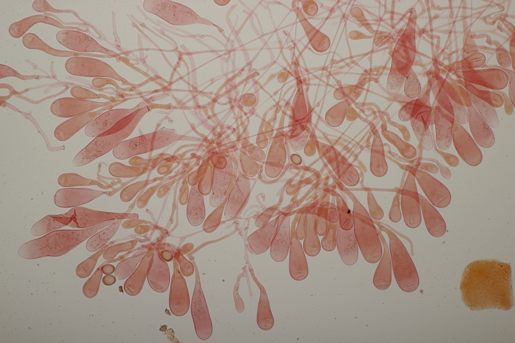 1. Hier hatte ich bis jetzt nur mal schnell reingeschaut. Vielleicht etwas Richtung Peniophorella? Schnallen vorhanden, Basidien mit Basalschnalle, Zystiden vorhanden. Teilweise wirkten die wie Gloeozystiden (allerdings ohne SV-Reaktion), teilweise waren sie unten bauchig verdickt und nach oben lang ausgezogen, teilweise saß oben ein Kristallschopf drauf.