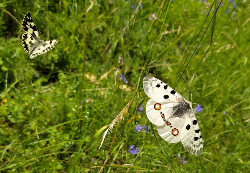 Von Arthur ein einmaliger Schnappschuss Parnassius apollo und Schachbrettfalter Melanargia galathea