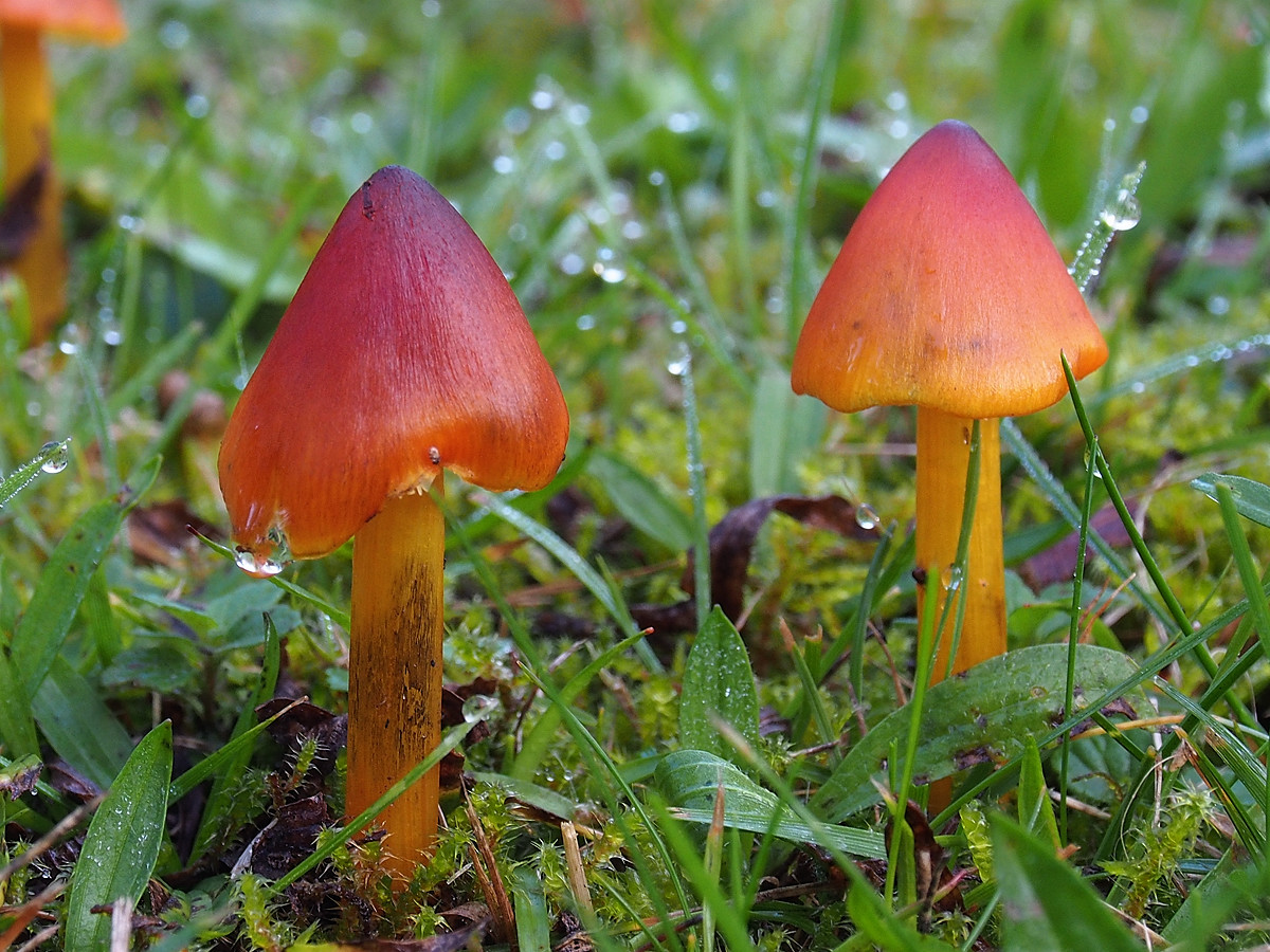 und zum Vergleich eine typische H. conica. Man beachte den linken Pilz, hier wurde der Stiel beim Wegzupfen störender Grashalme nur minimal touchiert und schon zeigt sich eine beginnende Schwärzung.