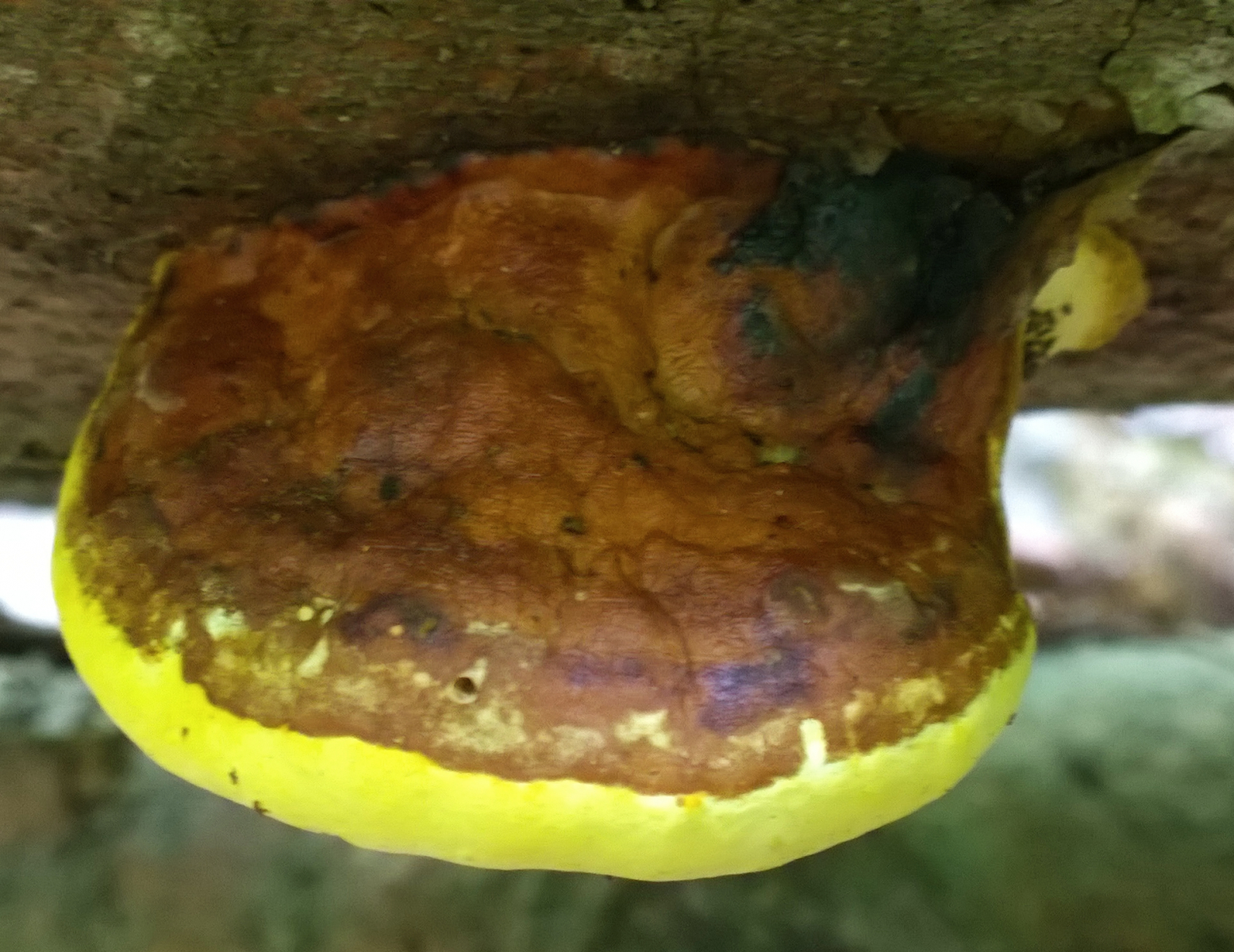 das Substrat ist m.E. mit hoher Wahrscheinlichkeit Buche (die Rinde sieht sehr danach aus). Der Rotrandporling wächst aber eh fast an allem. Der Gelbton sieht auf dem Foto irgendwie nach "zu kräftig" aus (Weißabgleich?), irgendwie etwas unnatürlich. Der Rotrandporling ist aber gerne gelblich an der Unterseite und ich kann die Bestimmung der Vorschreiber auch nur (nochmal) bestätigen.