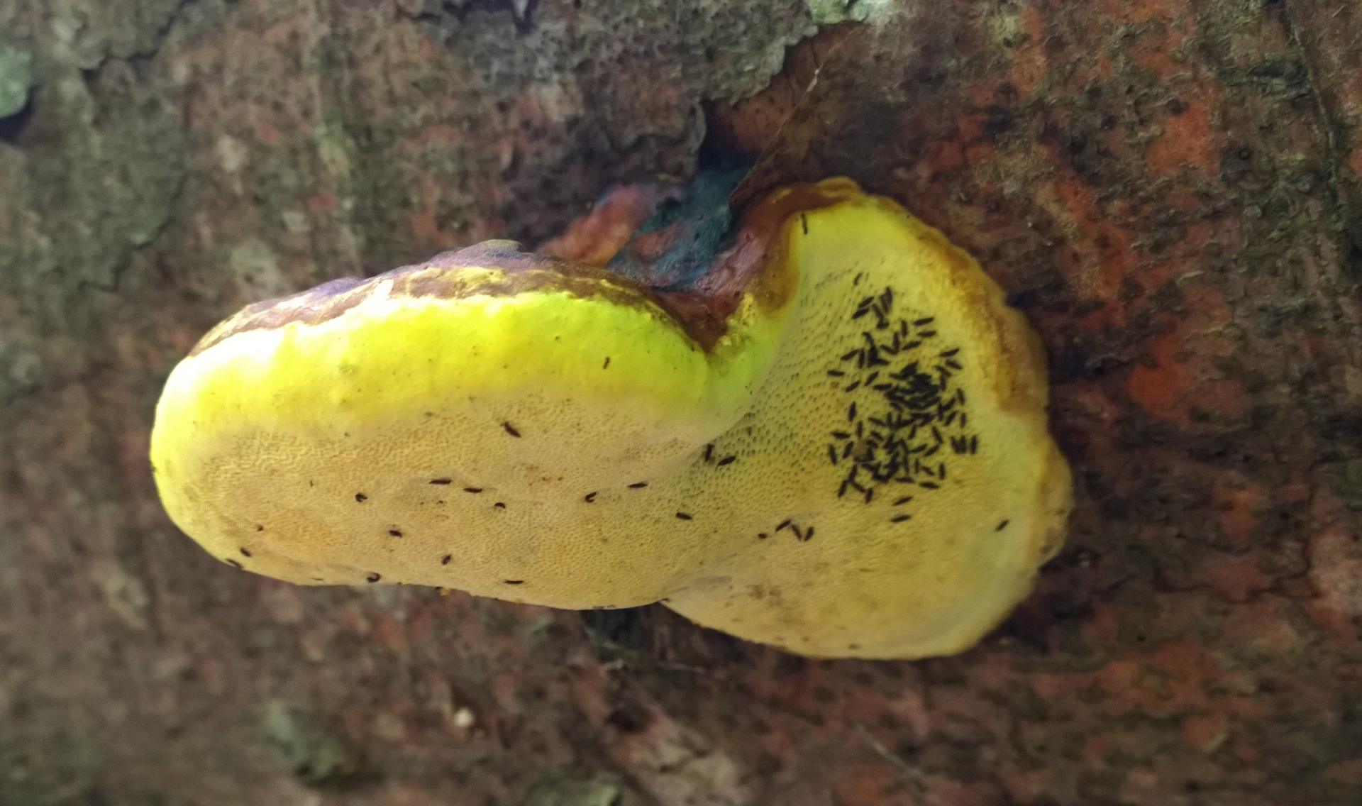 Das würde ich auch für einen FomPini (Rotrandigen Baumschwamm, Fomitopsis pinicola) halten. Die Fruchtkörper sind farblich schon sehr variabel, auch an den Poren und Röhren. Diesen Gelbton habe ich zwar selten beobachtet, aber möglich ist das.