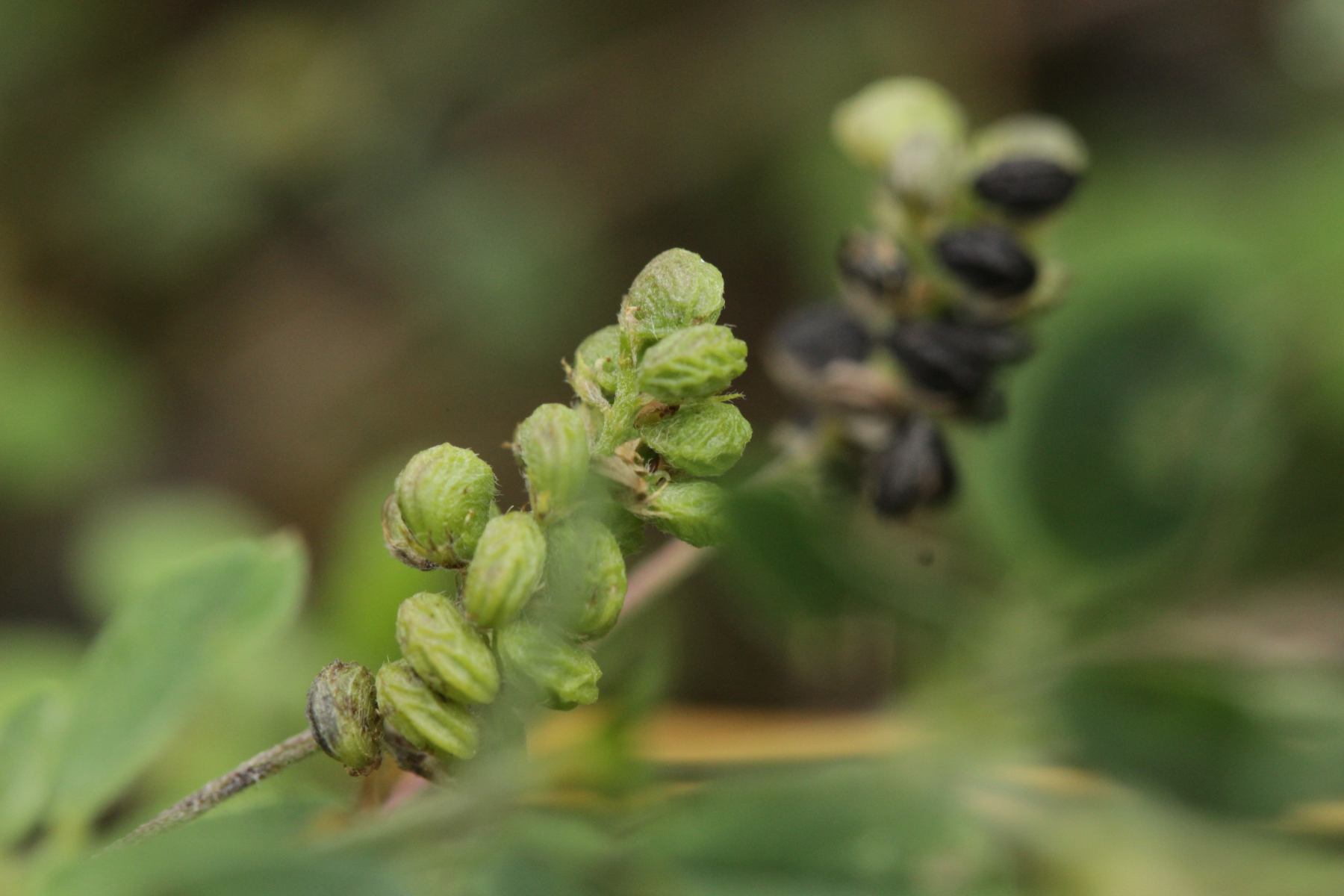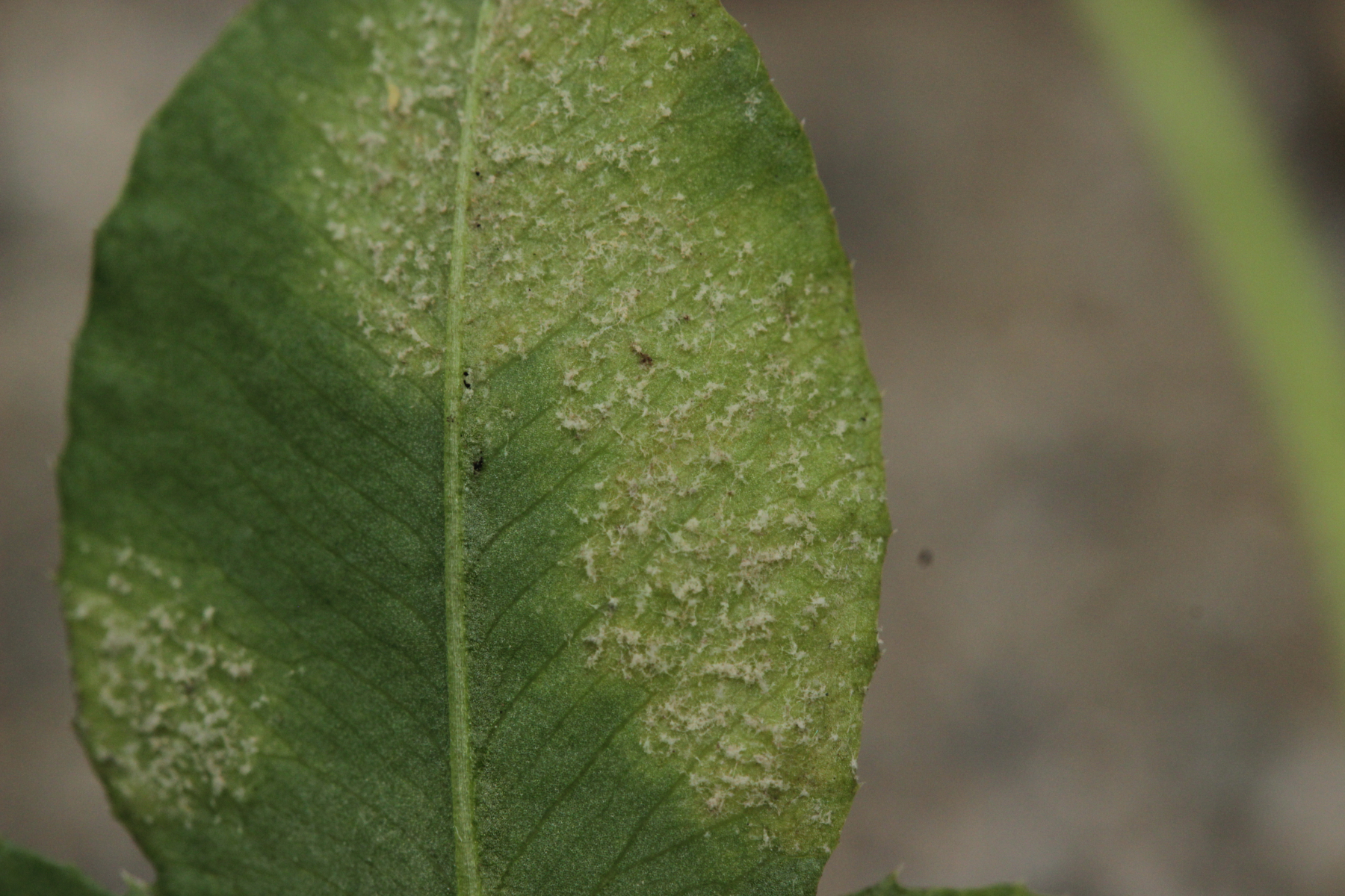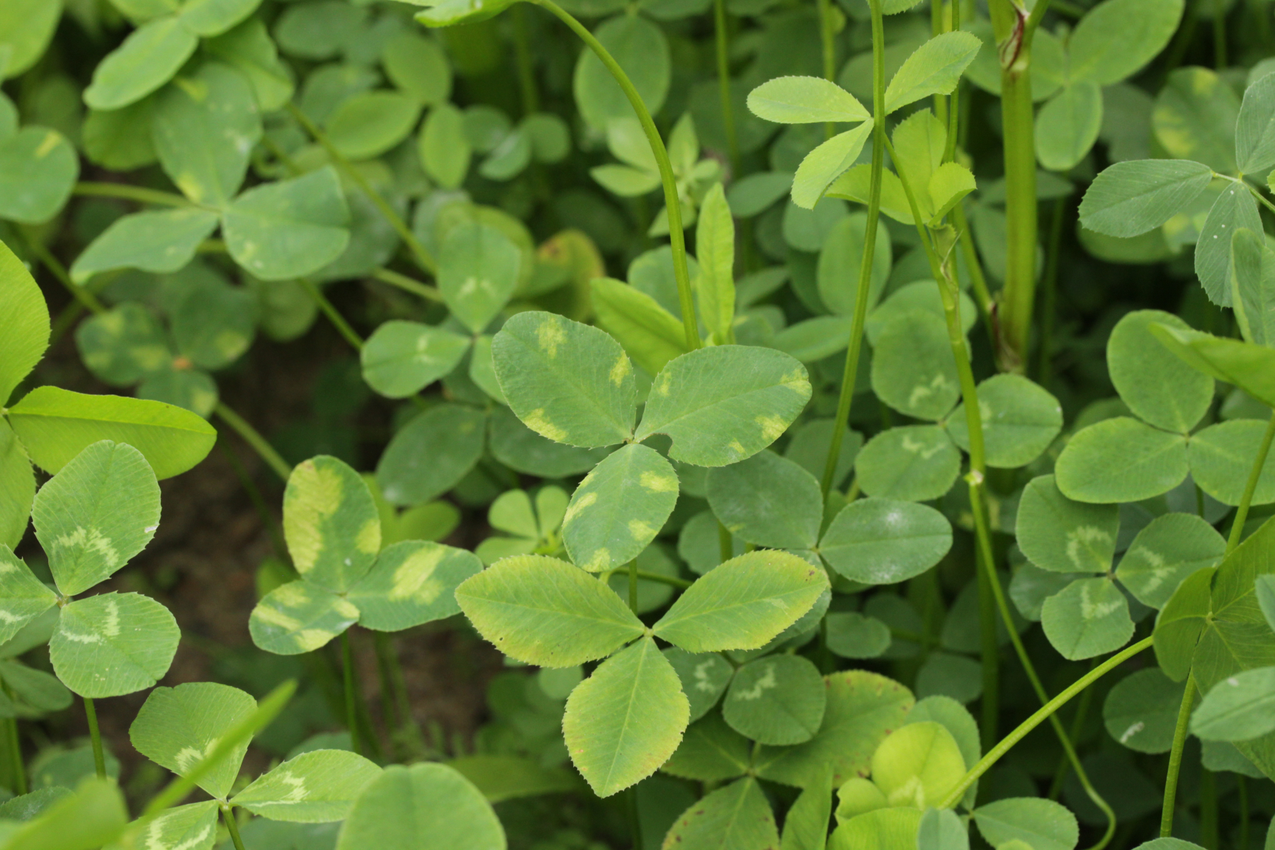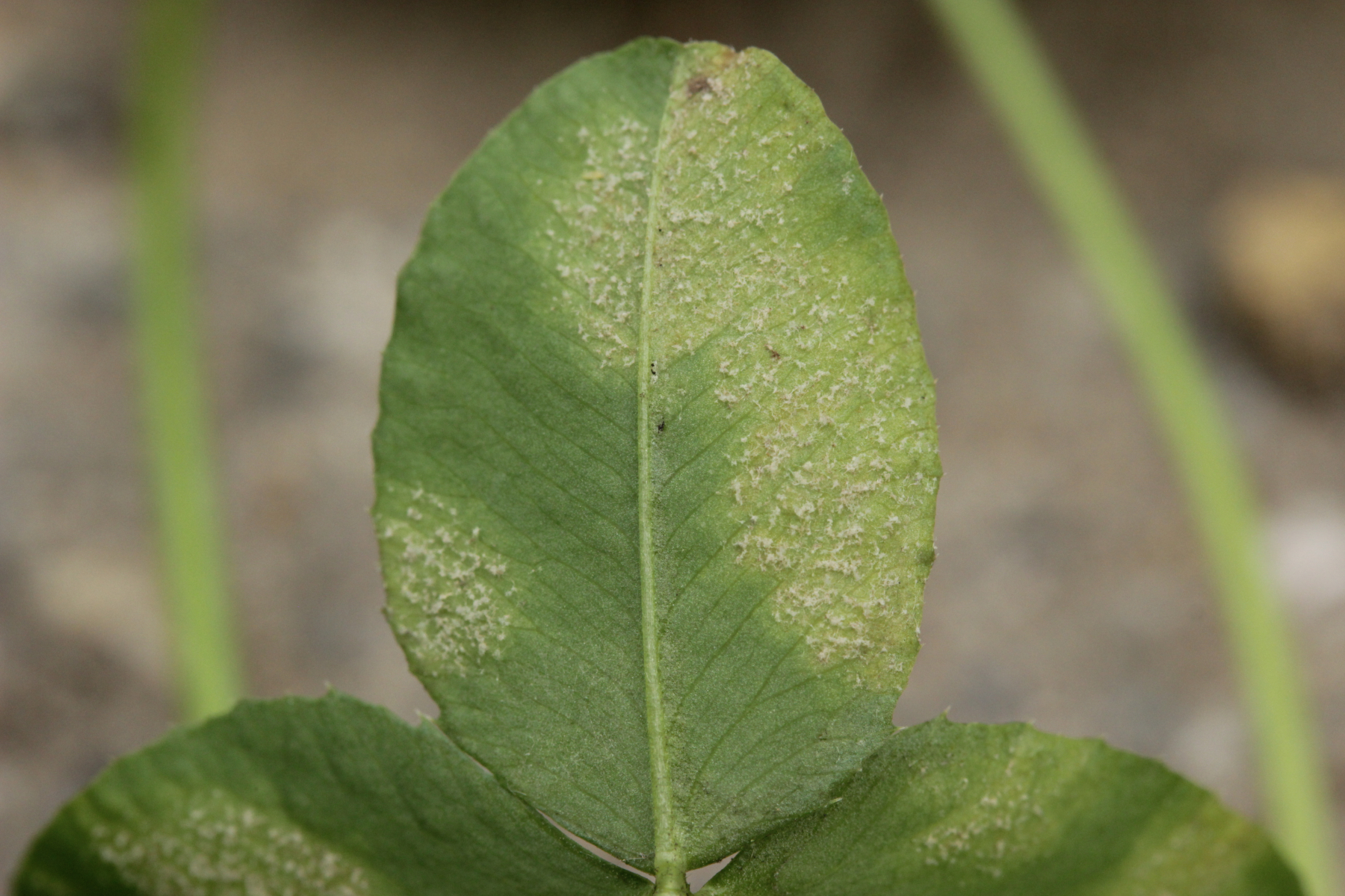 5. Ein falscher Mehltau auf Klee. Aber welcher? Dummerweise waren da keine Blüten dran. Daneben wuchs Inkarnatklee mit Blüten, der hat aber haarige Blätter.