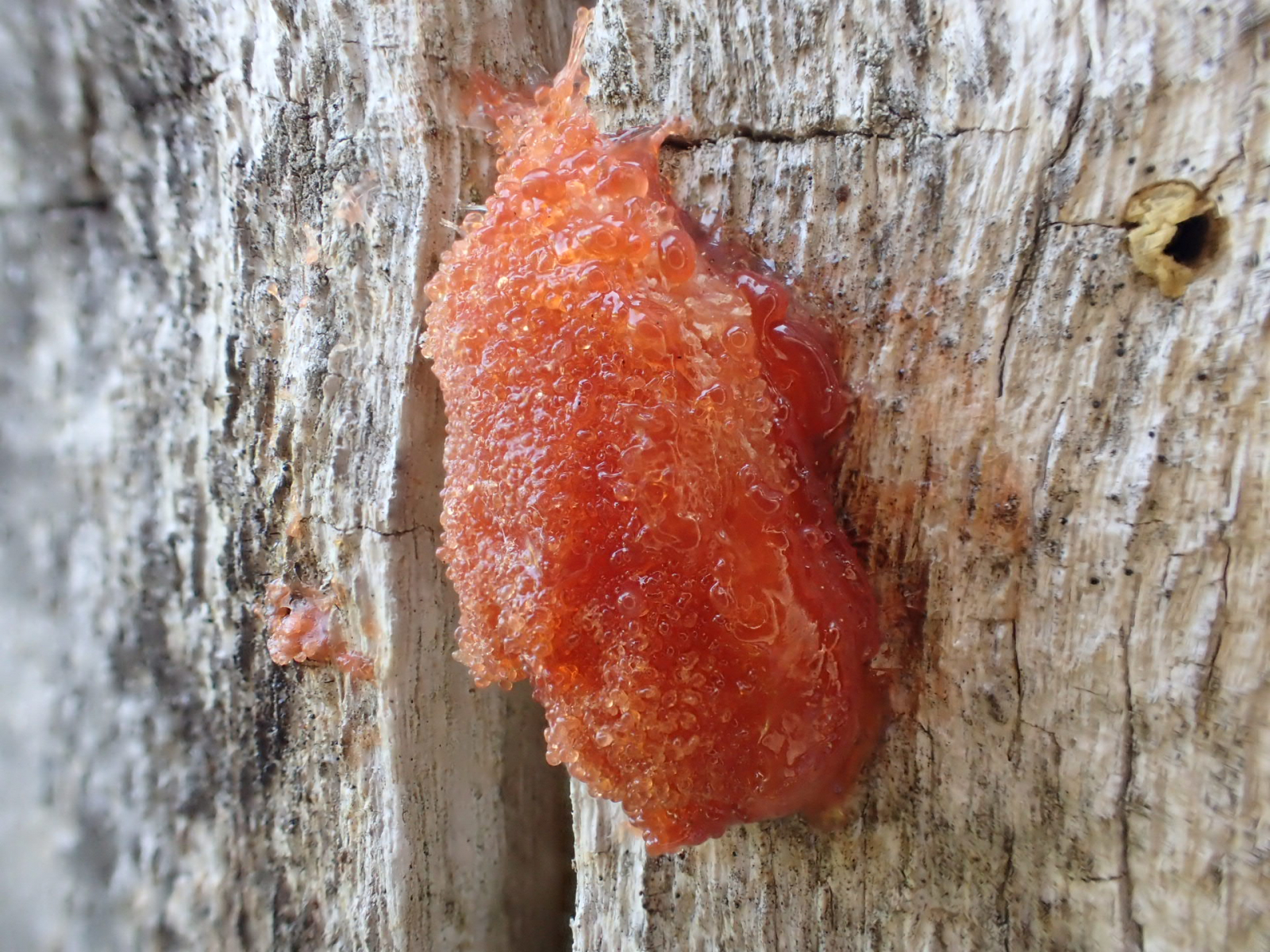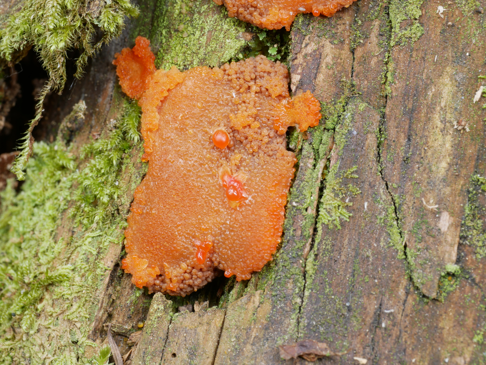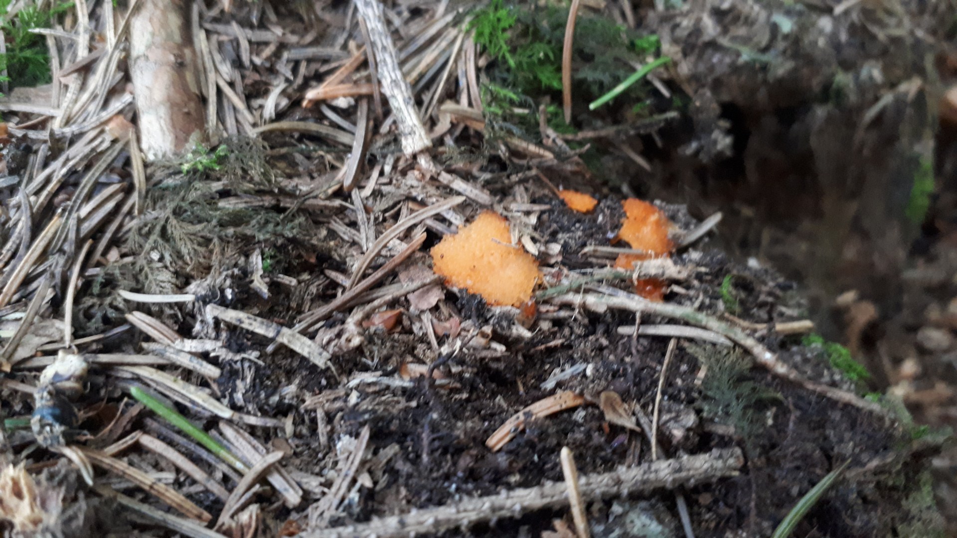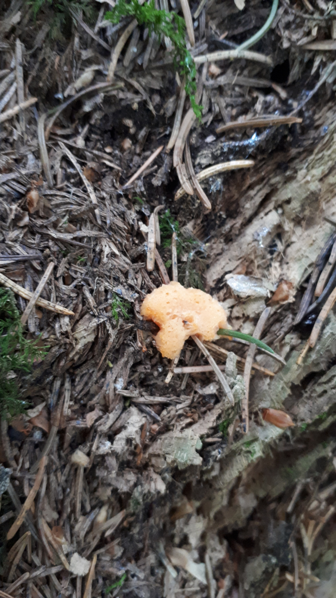 auf einem Fichtenstumpf hab ich auch was oranges leuchten sehen... ist das ein Schleimpilz? Lg