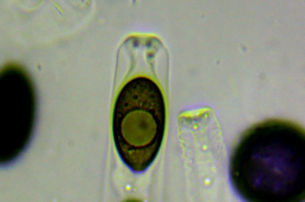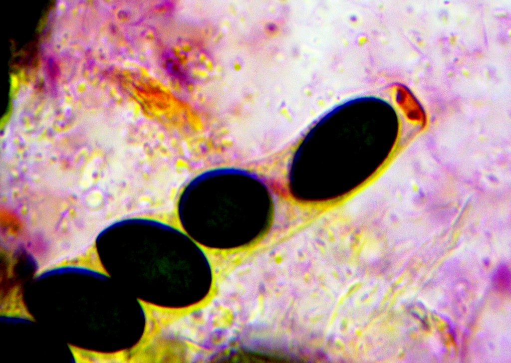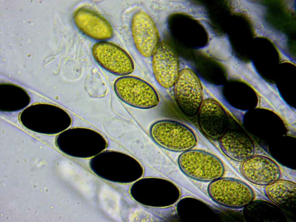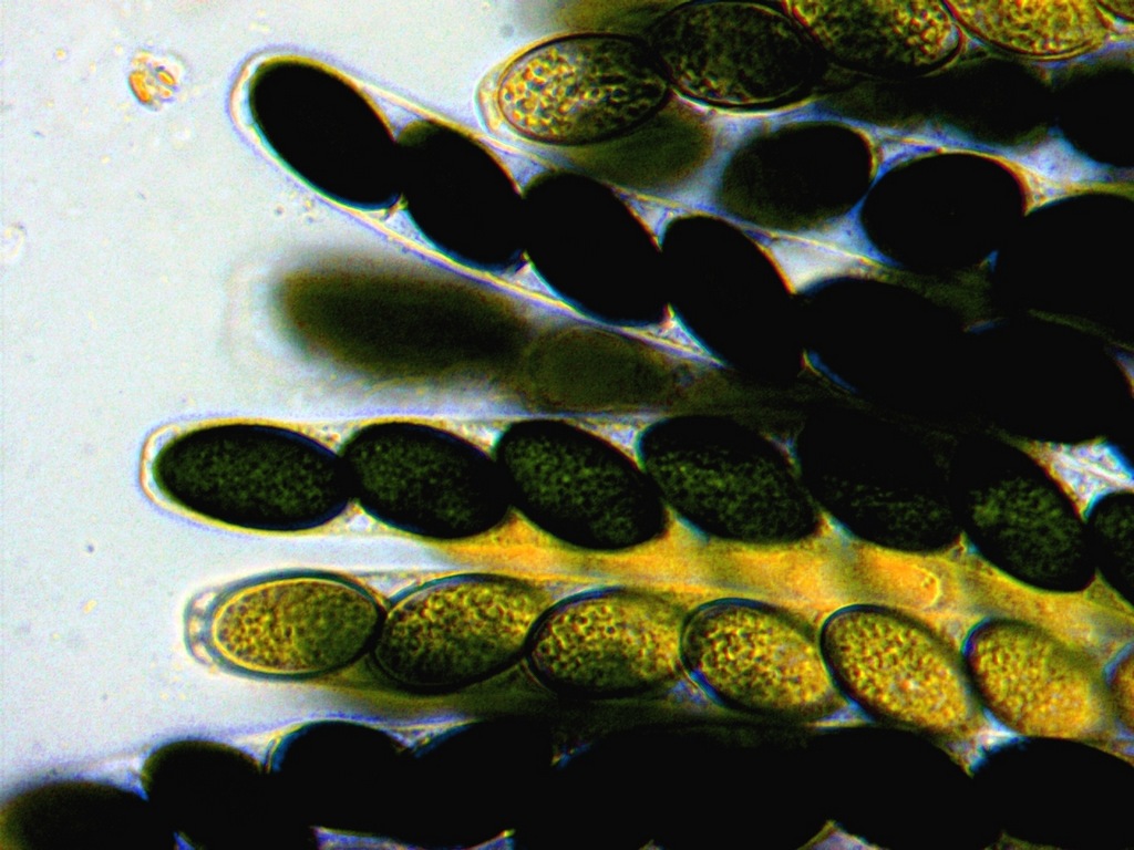 keine Jodreaktion, Asci oben abgeplattet, Sporen uniseriat, elliptisch, dunkel schwarzbraun bis heller braugrün, unseptiert, Maße 17-20 x 11-12 µ.