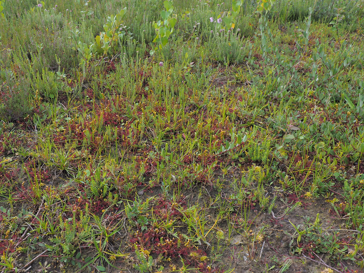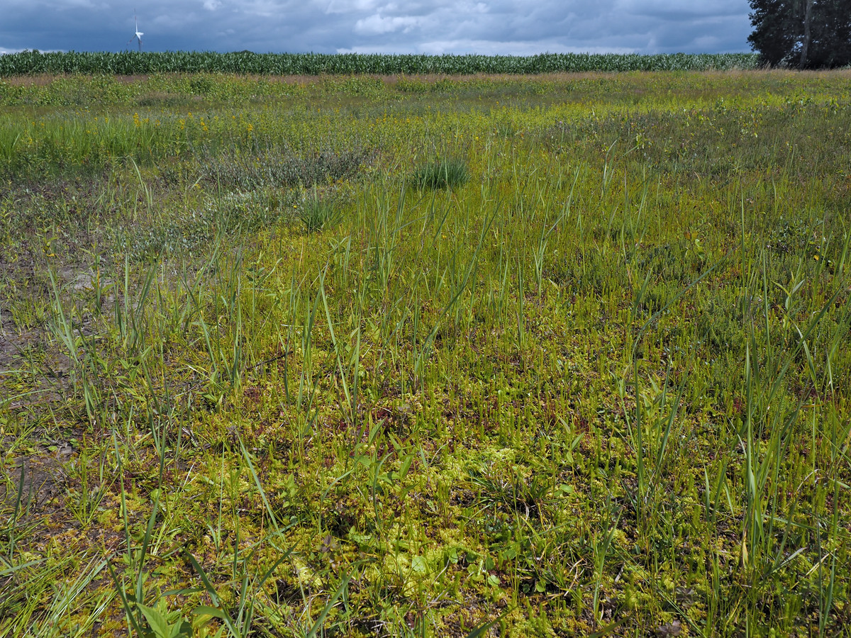 Die Vegetation im Randbereich besteht u.a. aus Kriechweide (Salix repens), Glockenheide (Erica tetralix), Mittlerem Sonnentau (Drosera intermedia), Wassernabel (Hydrocotyle vulgaris), Sumpf-Bärlapp (Lycopodiella inundata) und Braunem Schnabelried (Rhynchospora fusca). Es gibt noch viel offenen Boden, aber auch schon größere Bereiche, wo sich zwischen den Pflanzen Torfmoose angesiedelt haben.