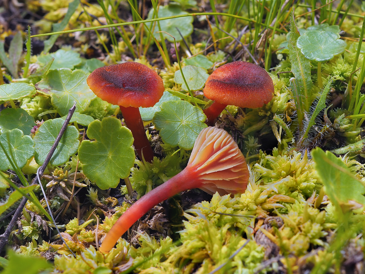 Schuppiger Torfmoos-Safling (Hygrocybe coccineocreanta) zwischen Torfmoos und den Blättern des Wassernabels