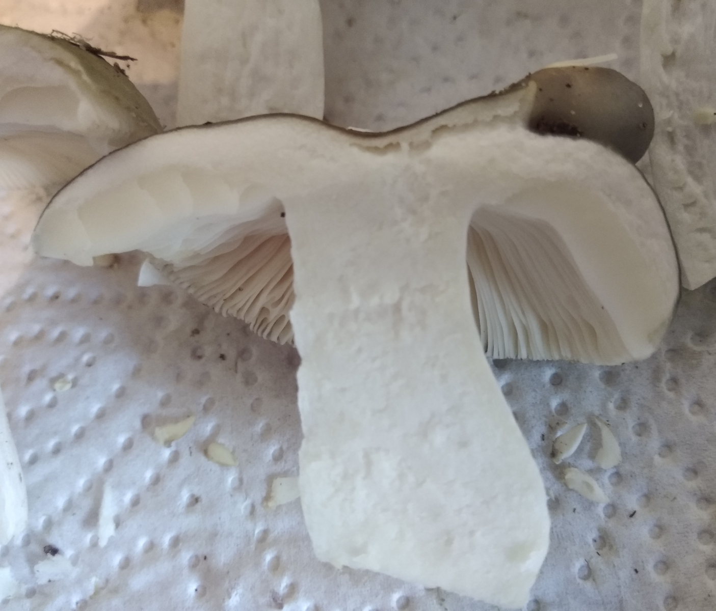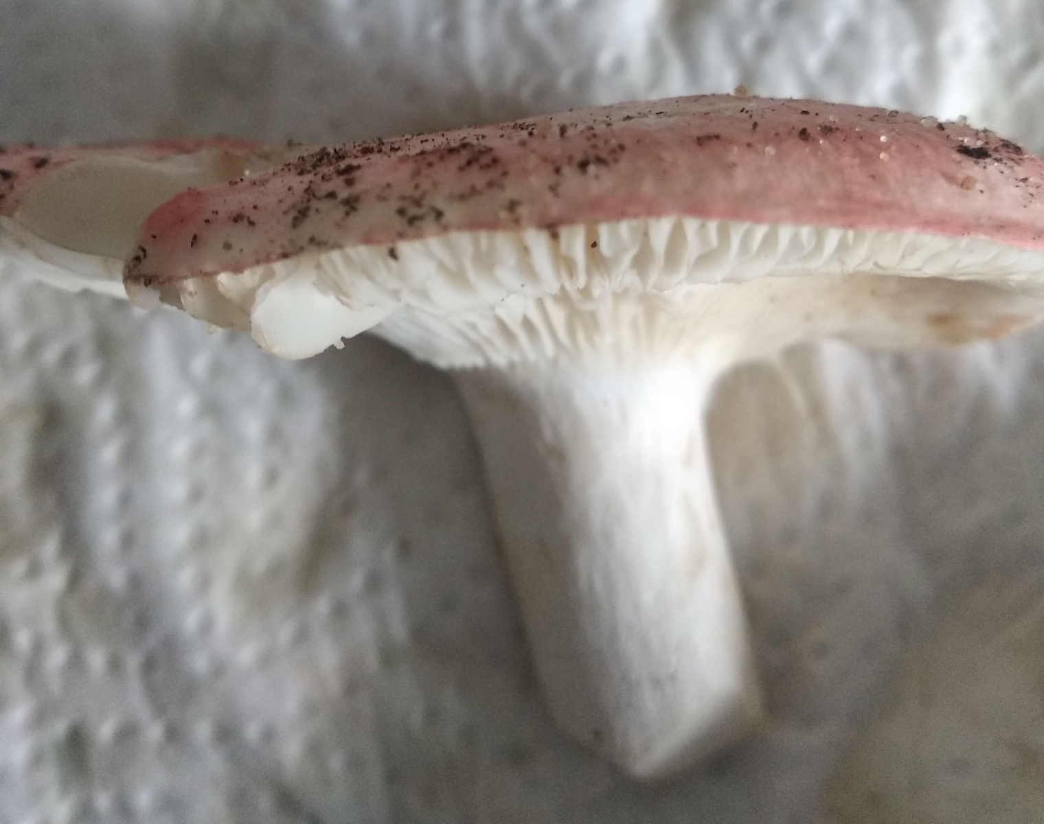 Als Nächstes habe ich vermutlich ein paar Speise-Täublinge gefunden? Die vom Rand zurück gezogenen Huthaut, hmmm ja zum Teil. Lamellen splittern leicht, Fleisch wieder fest, riecht aber süßlich/obstig finde ich, also vielleicht doch ein Kirschroter Spei-Täubling?