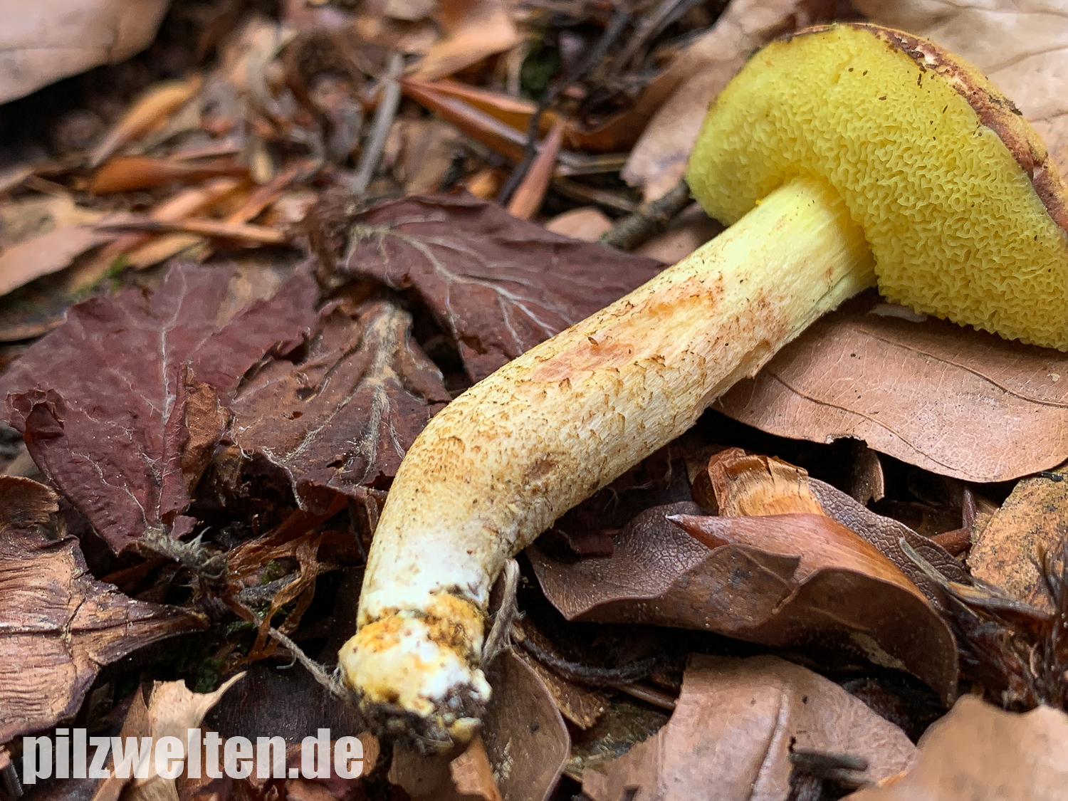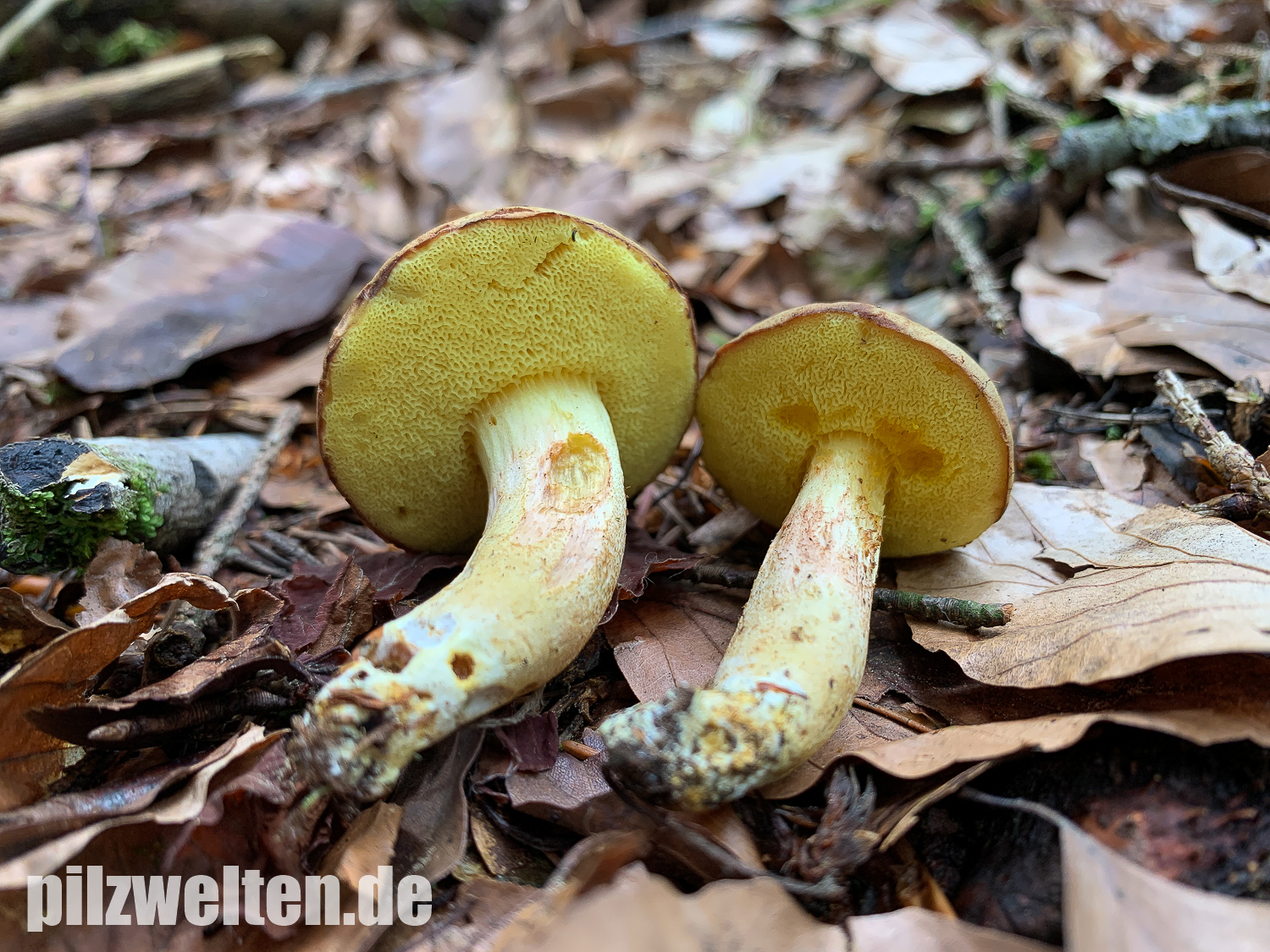 Xerocomus ferrugineus schlossen wir u. a. wegen des fehlenden Stielnetzs & der fehlenden gelben Basismyzelfäden aus. Xerocomus lanatus hätte ebefalls ein Netz am Stiel und passt auch farblich überhaupt nicht.