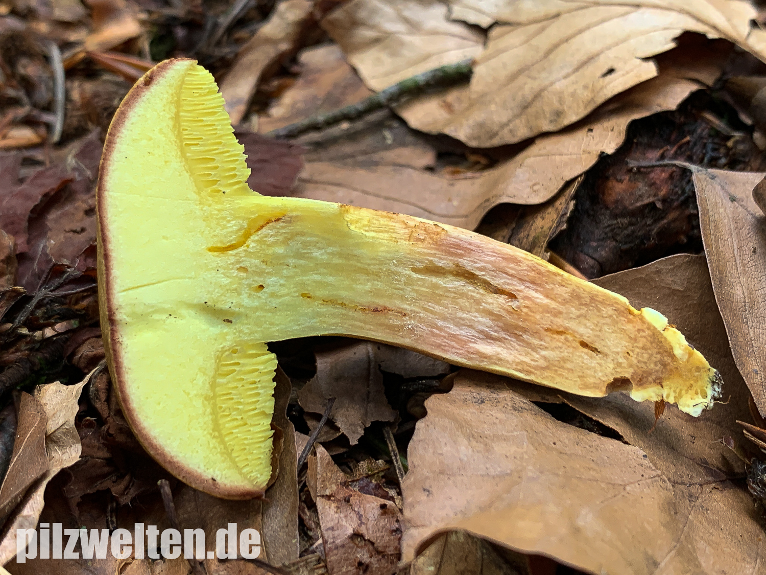 - Das Schnittbild mit dem hellgelbichen / weißgelblich Hutfleisch und dem Farbübergang ins braunrötliche im Stiel