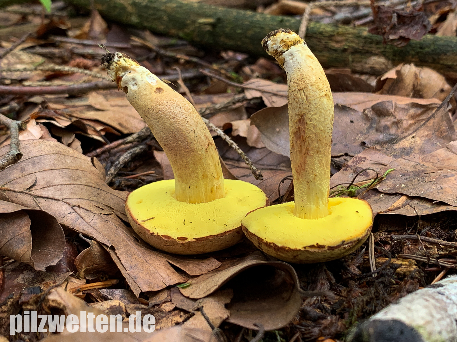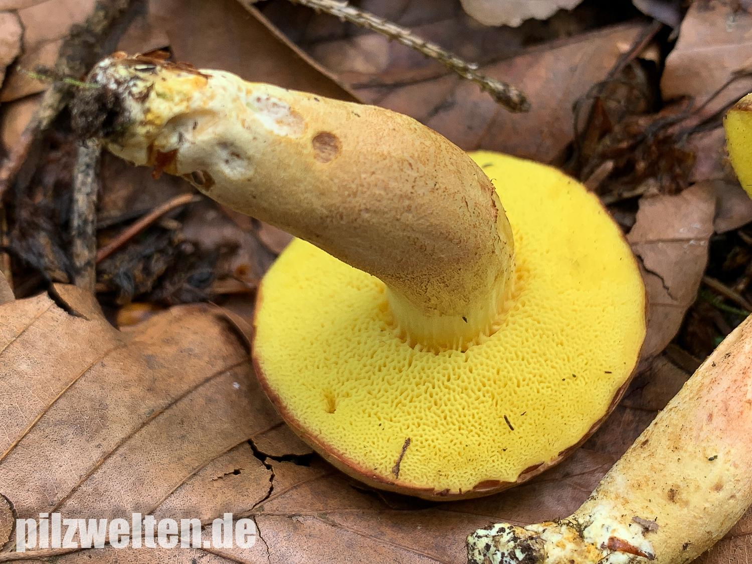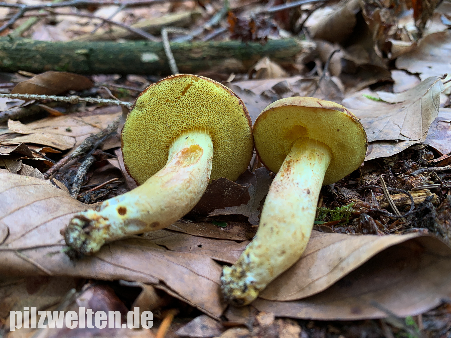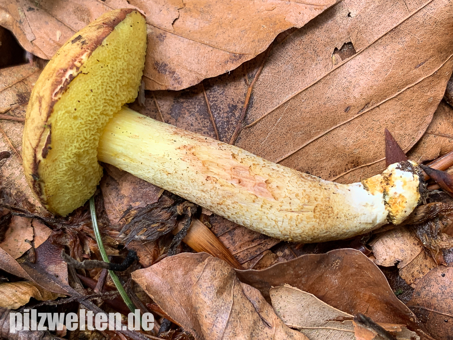 Xerocomus ferrugineus schlossen wir u. a. wegen des fehlenden Stielnetzs & der fehlenden gelben Basismyzelfäden aus. Xerocomus lanatus hätte ebefalls ein Netz am Stiel und passt auch farblich überhaupt nicht.