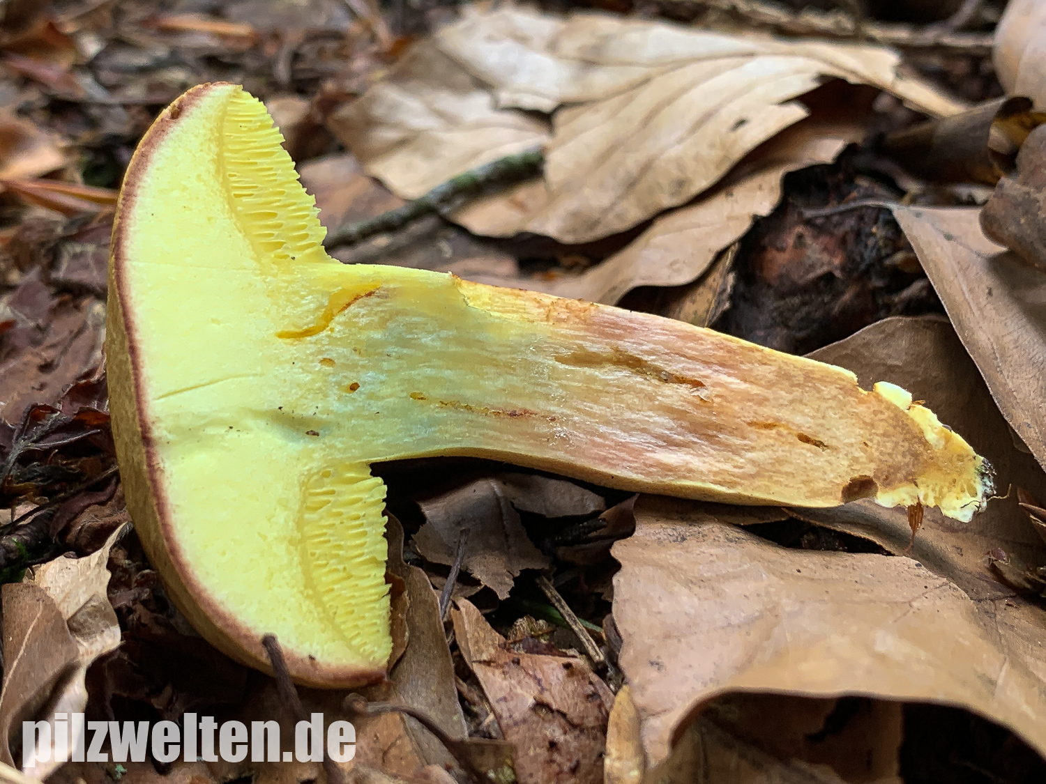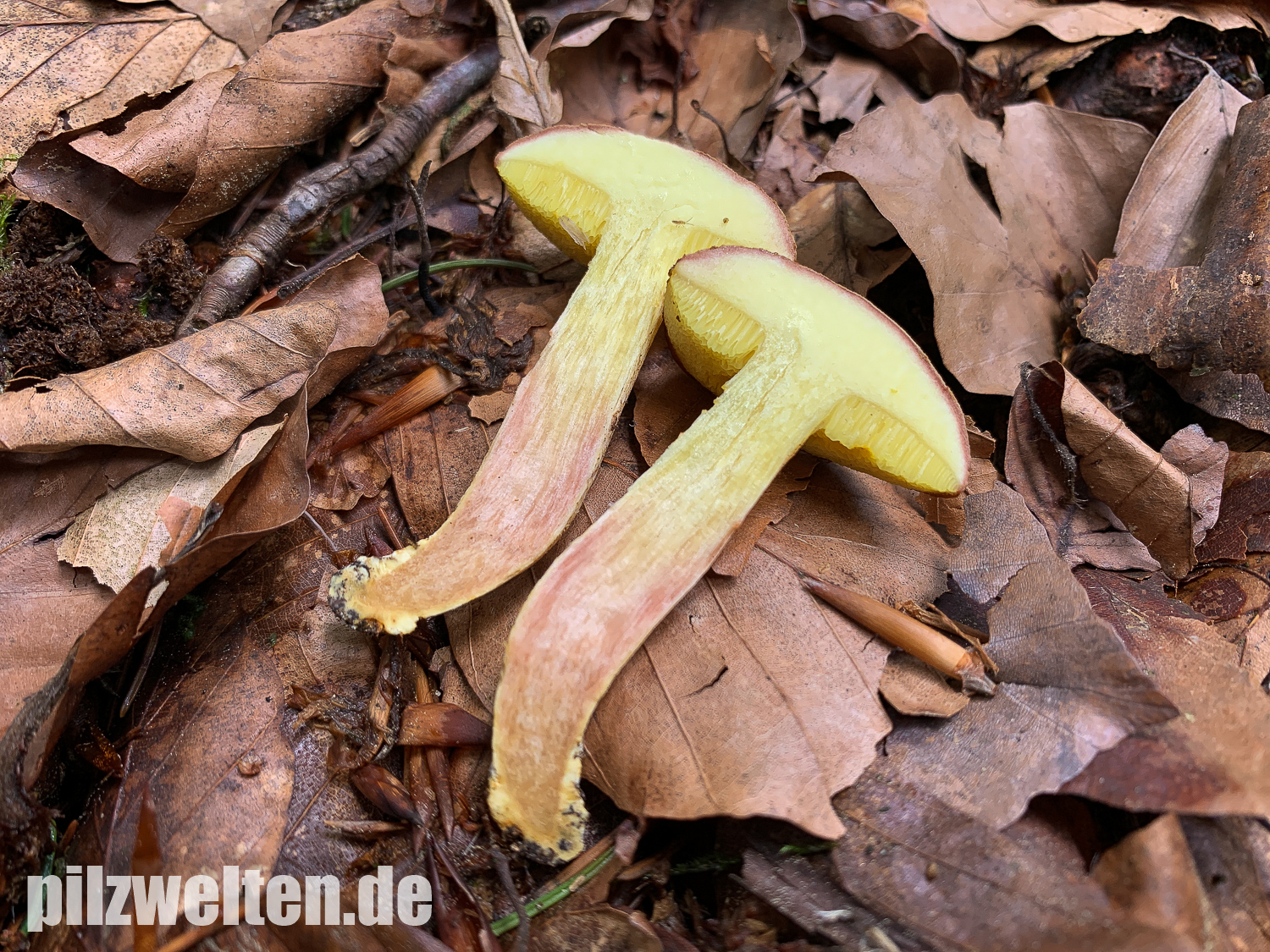 - Das Schnittbild mit dem hellgelbichen / weißgelblich Hutfleisch und dem Farbübergang ins braunrötliche im Stiel