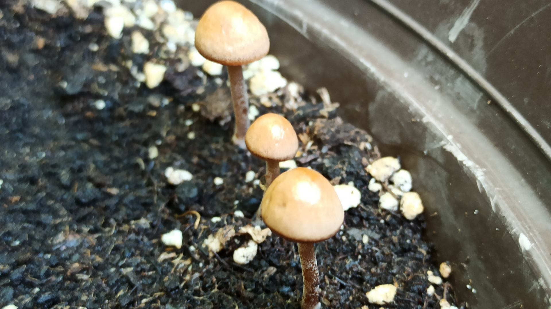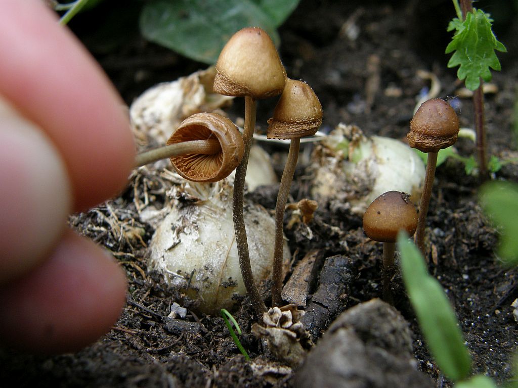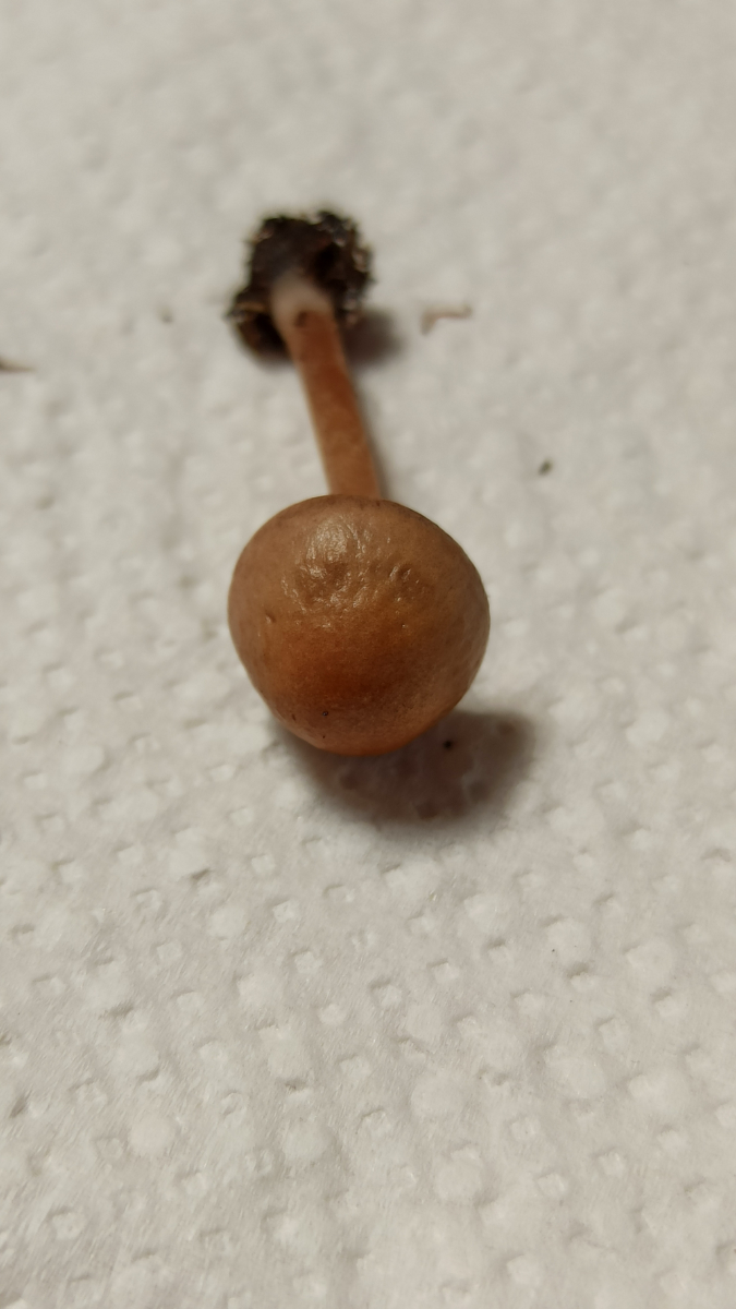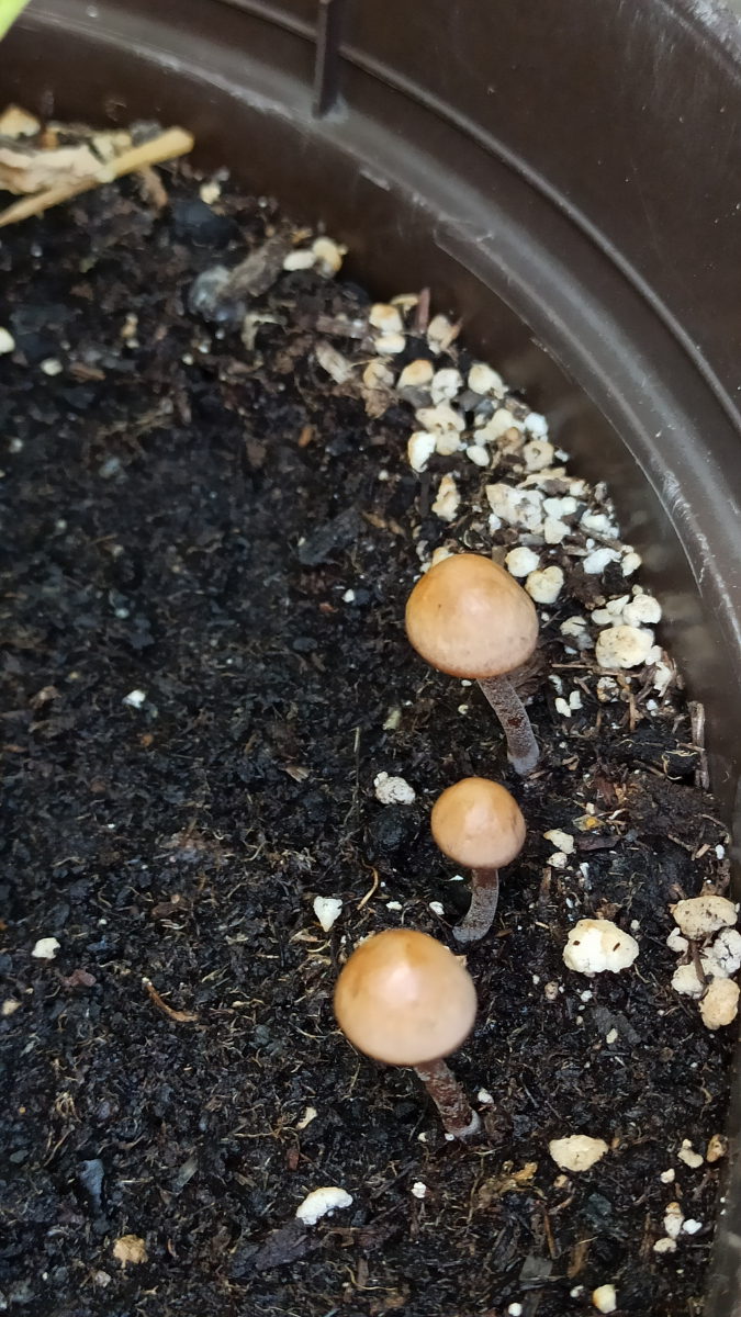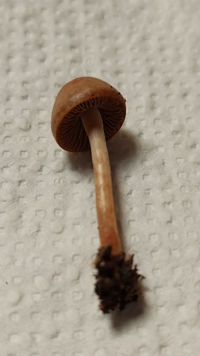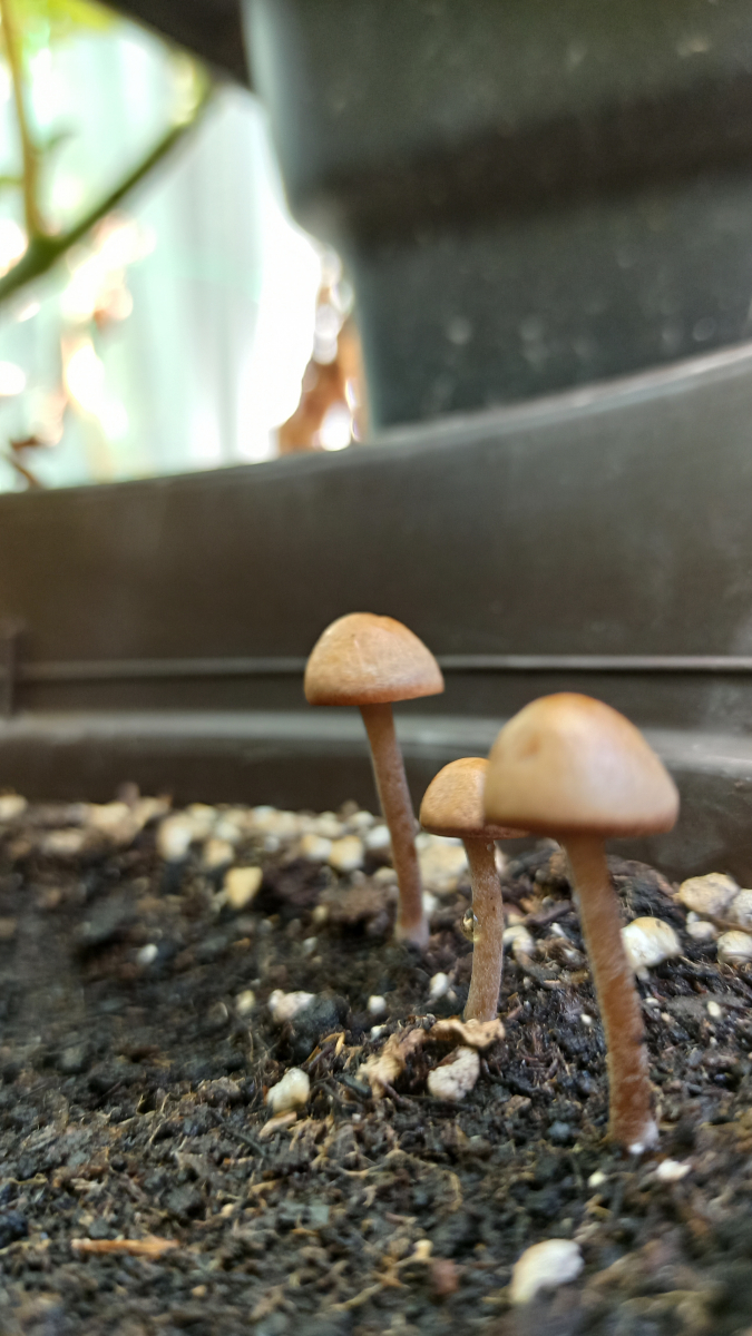 Makroskopisch kann das schon auch eine Conocybe (Samthäubchen) sein. Auch wenn der Hutrand ungerieft erscheint und die Farben recht blass, das passiert bei denen leicht beim Antrocknen. Viele Arten der Gattung sind zudem auch typische Blumentopf - Pilze, wogegen ja der Heudüngerling zB eine Wiese braucht: Der ernährt sich von Grasresten usw, nicht aber vom organischen Material in Handelsüblicher Pflanzerde.Mit Samthäubchen kenne ich mich quasi gar nicht aus, aber einer meiner wenigen bestimmten Funde sieht dem hier doch ganz schön ähnlich: