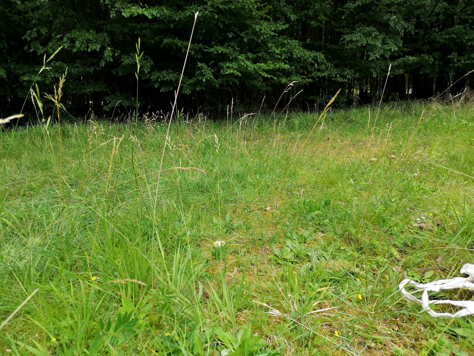 1) Schwache Senke einer Waldwiese vor überwiegend Buchenwald, rechts hinten R. subfoetens (auch Sommersteinpilzecke)