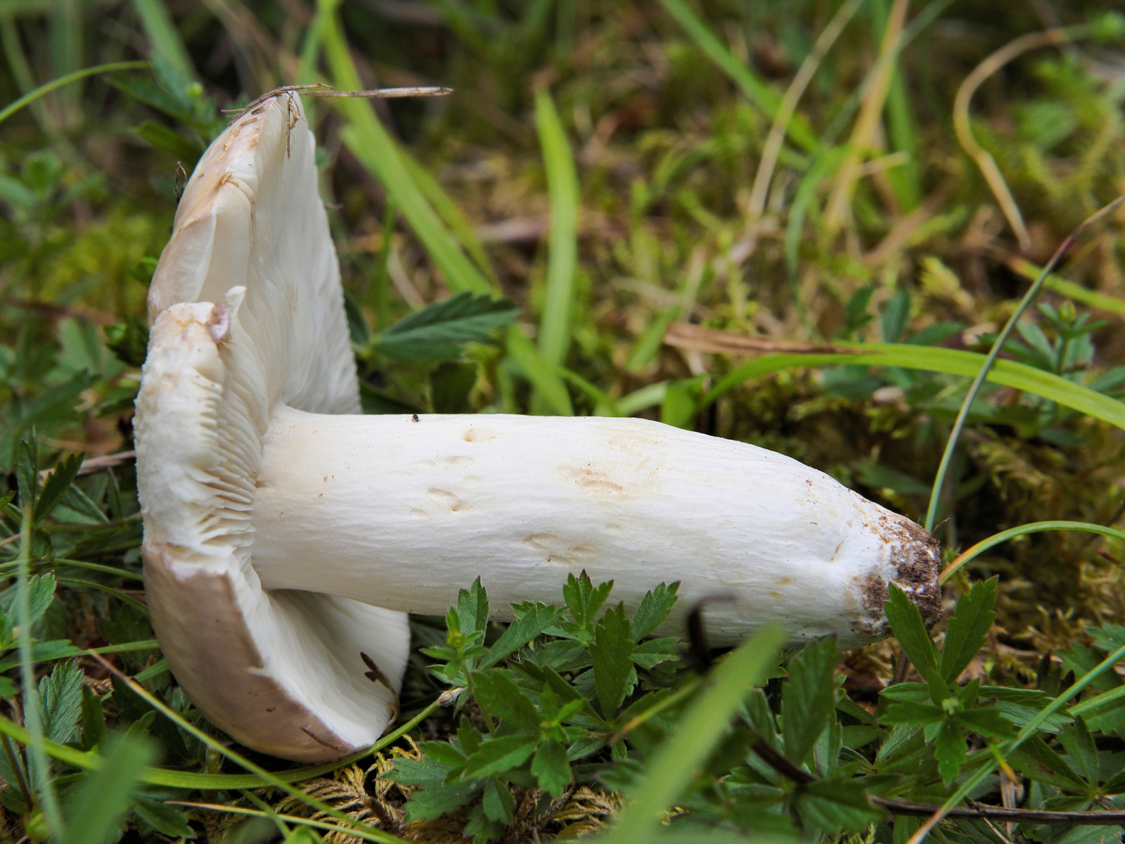 8) Stiel weisslich, fest, voll, ohne Farbe, Basis zugespitzt, Huthaut leicht überstehend