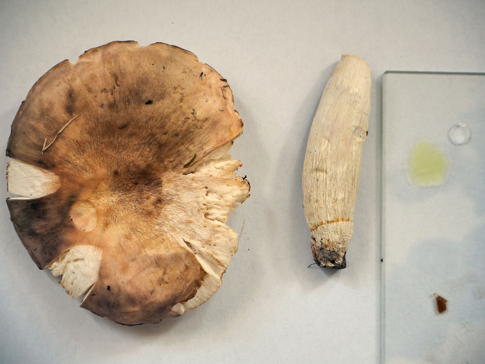 11) Guajakreaktion an Lamellen grün, Huthaut überstehend