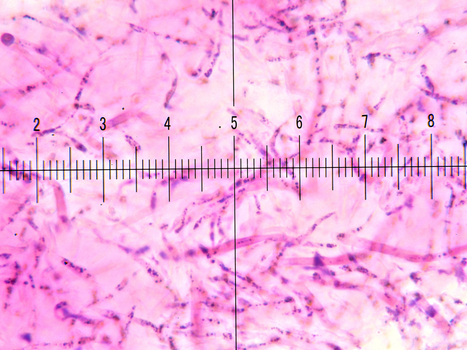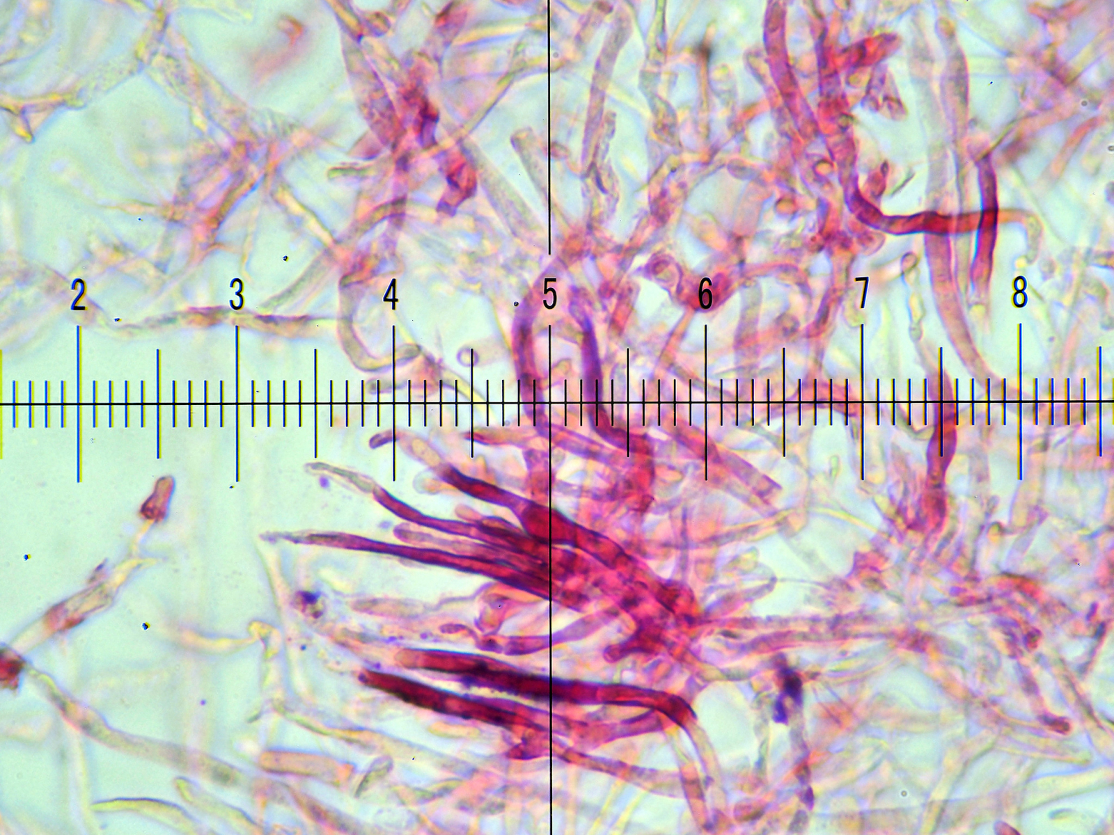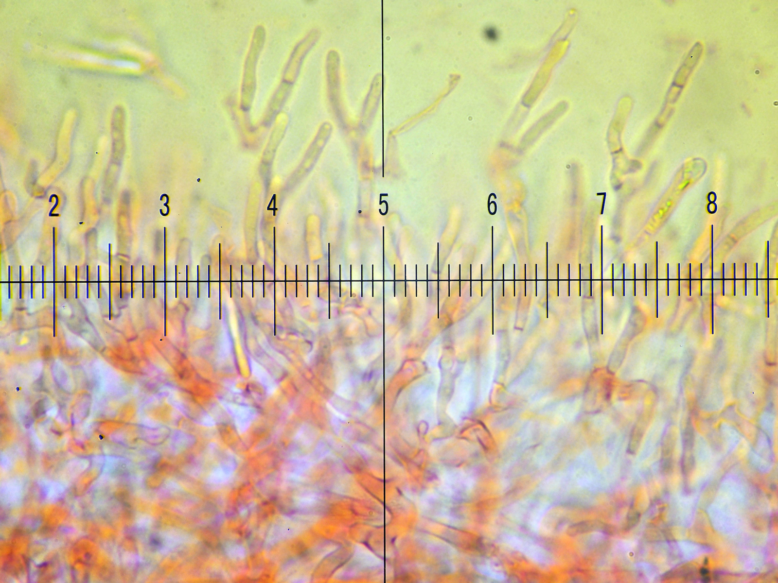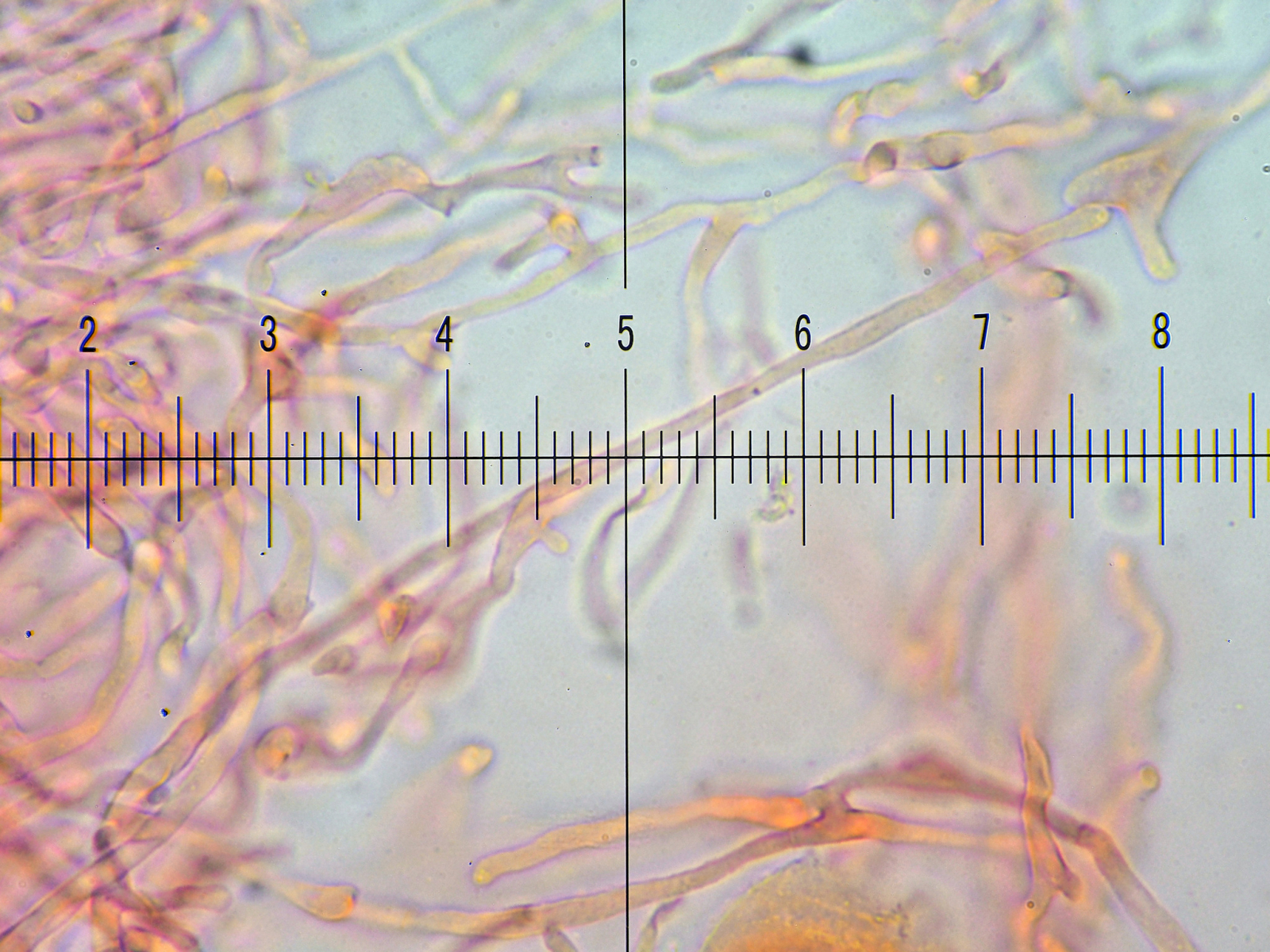 Die Huthaut zäh, die Darstellung im Mikro ohne viel Kontrast, ein Wirr-warr der Haare, keine Auffälligkeiten von Zystiden und zu guter letzt schwer auffindbare, mini Inkrustationen und Primordialhyphen die in Kf + Lactoglycerol gar nicht, sondern erst in Kf + Salzsäure nur schwach sichtbar wurden.