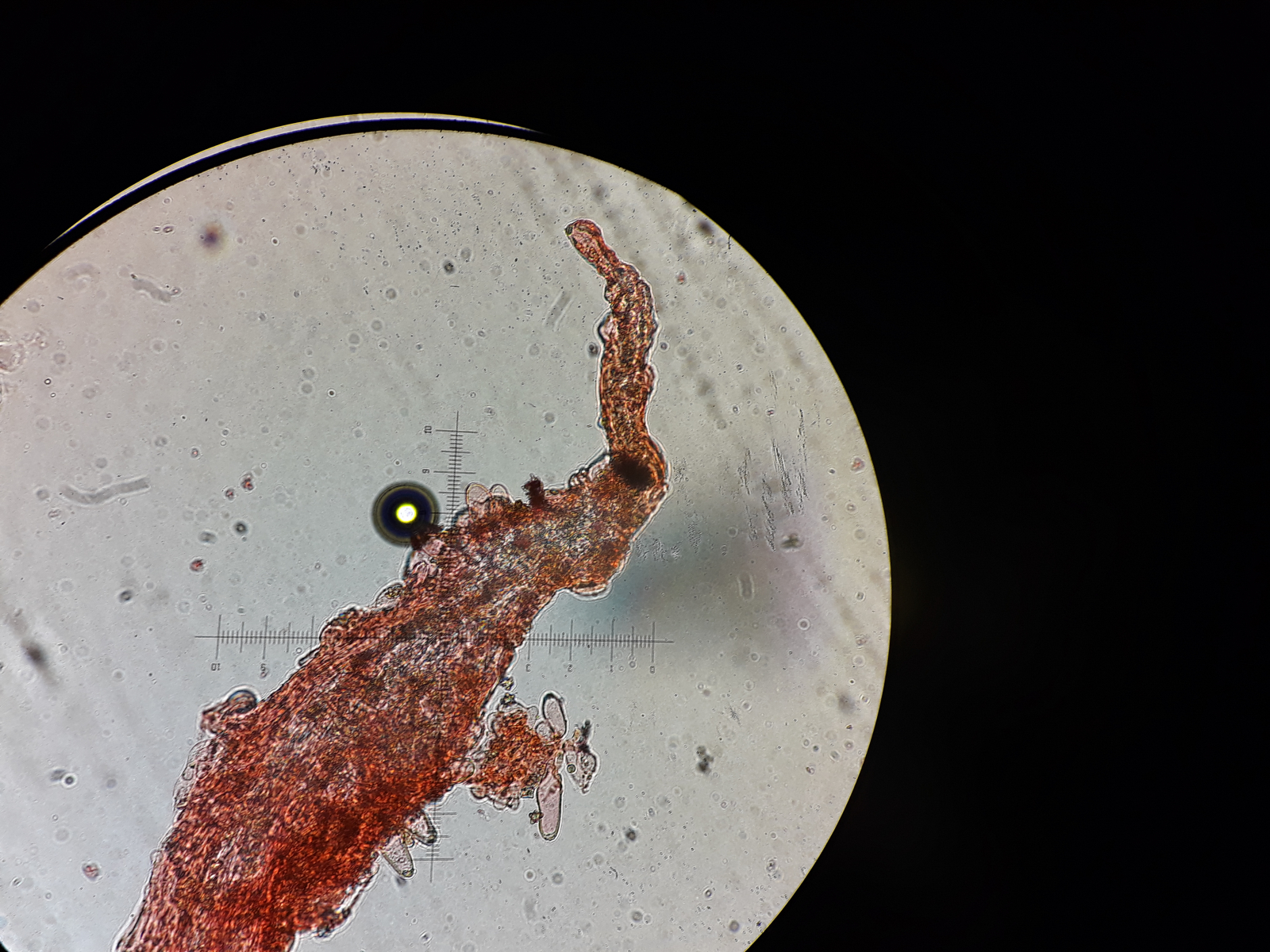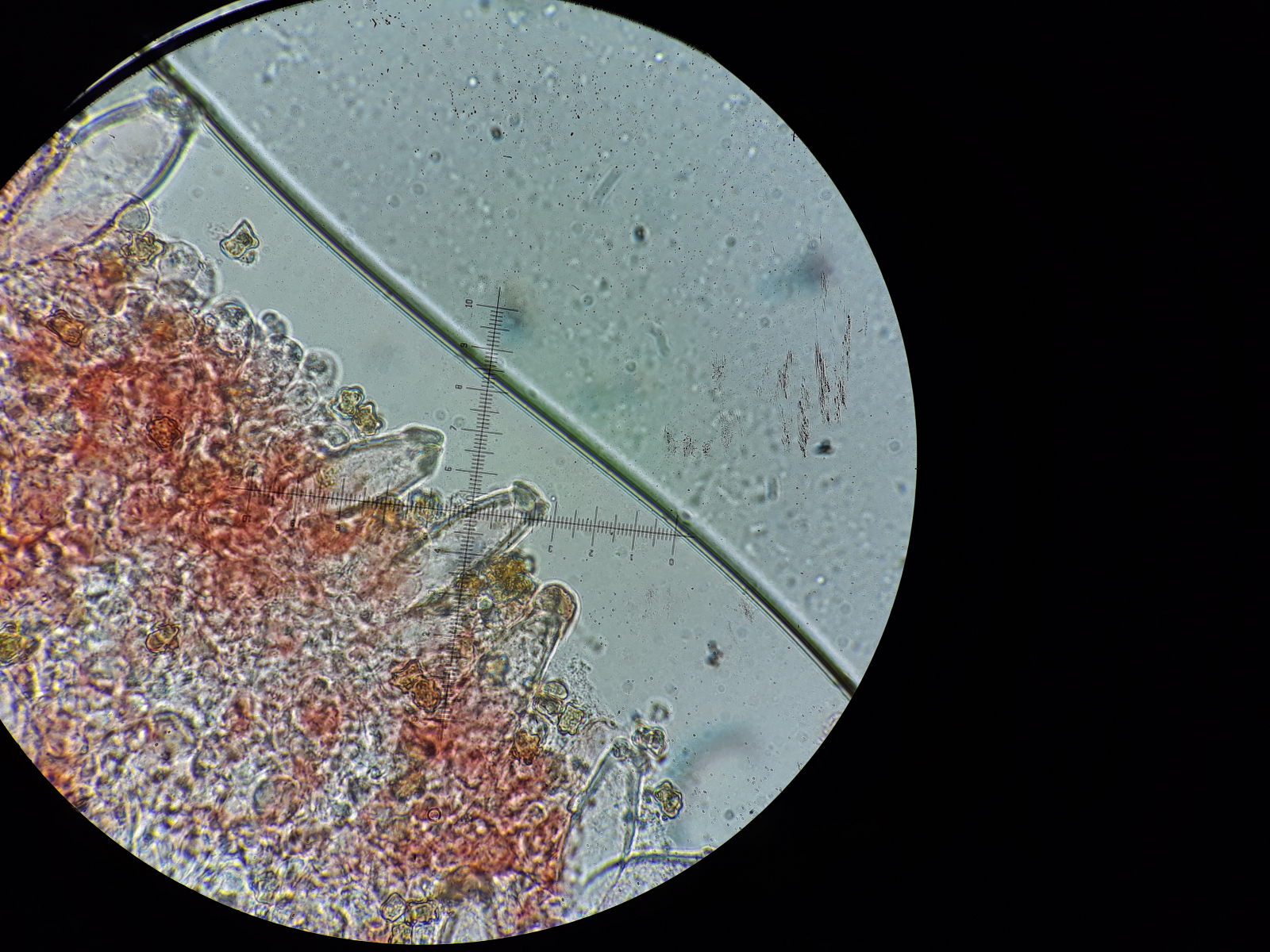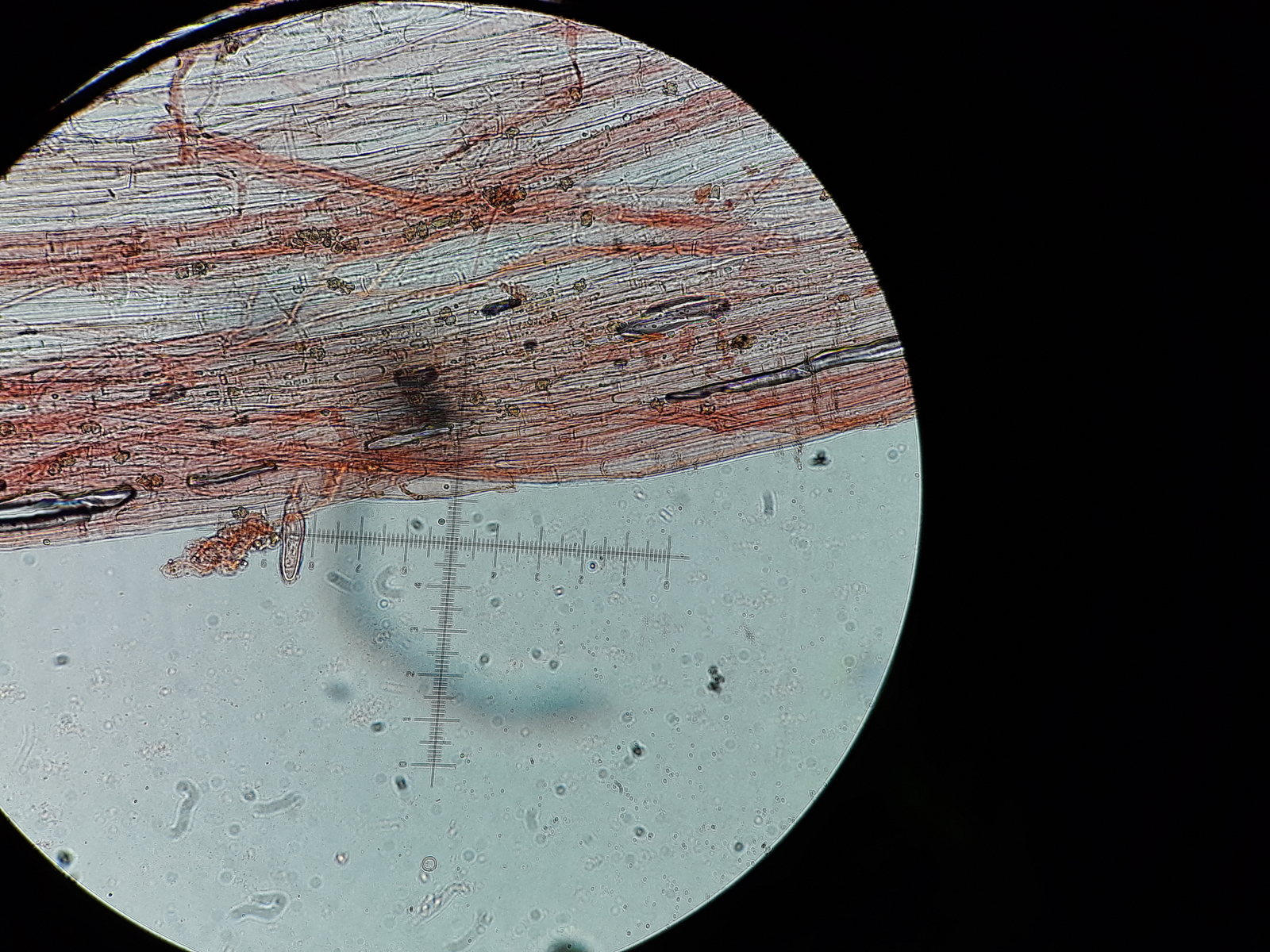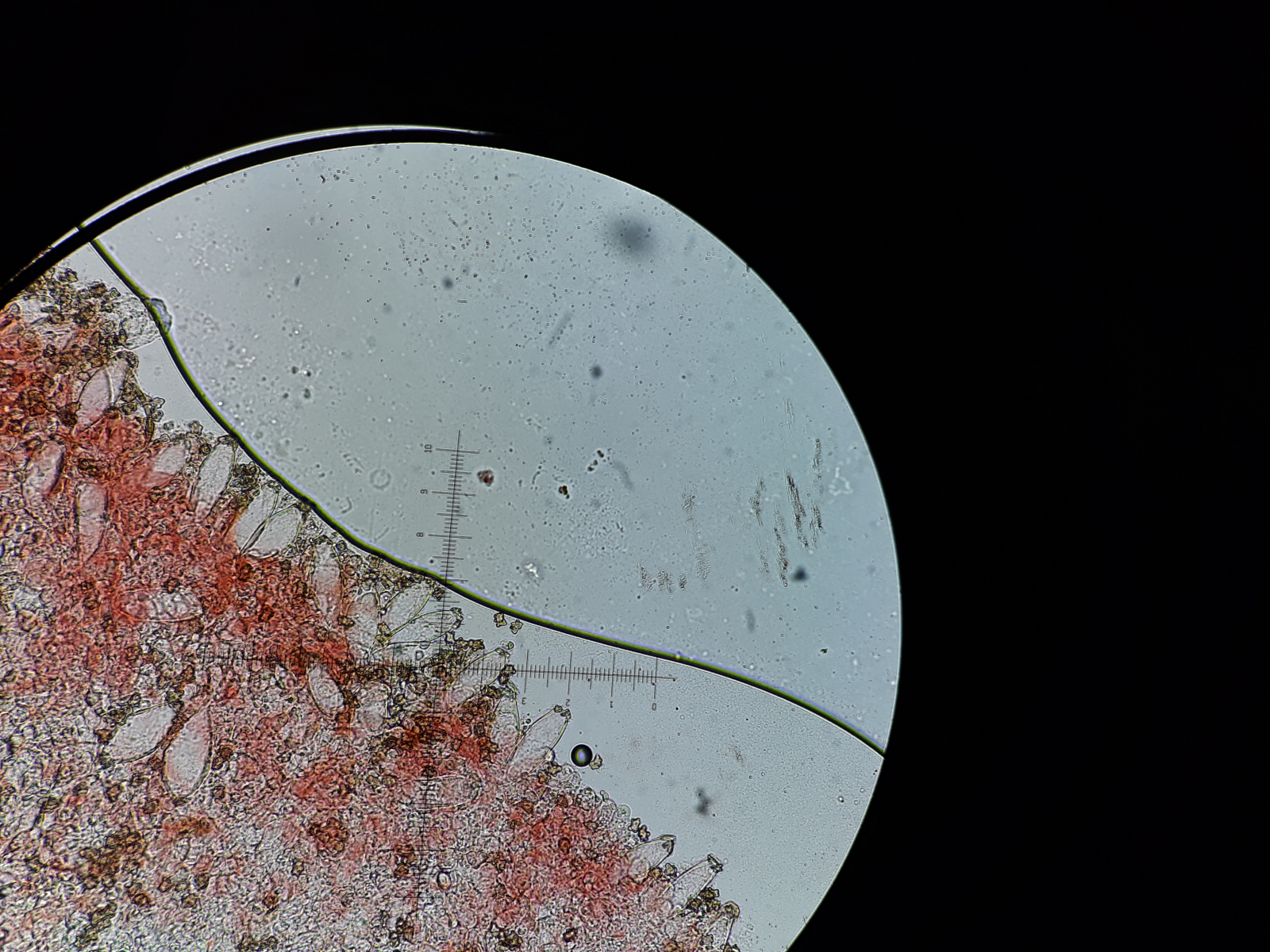 An der Stielspitze war die Bereifung sehr gut sichtbar, danach kaum noch. Trotzdem war der Stiel ganz bereift. (Ich habe im unteren Bereich Kaulozystiden gefunden.)