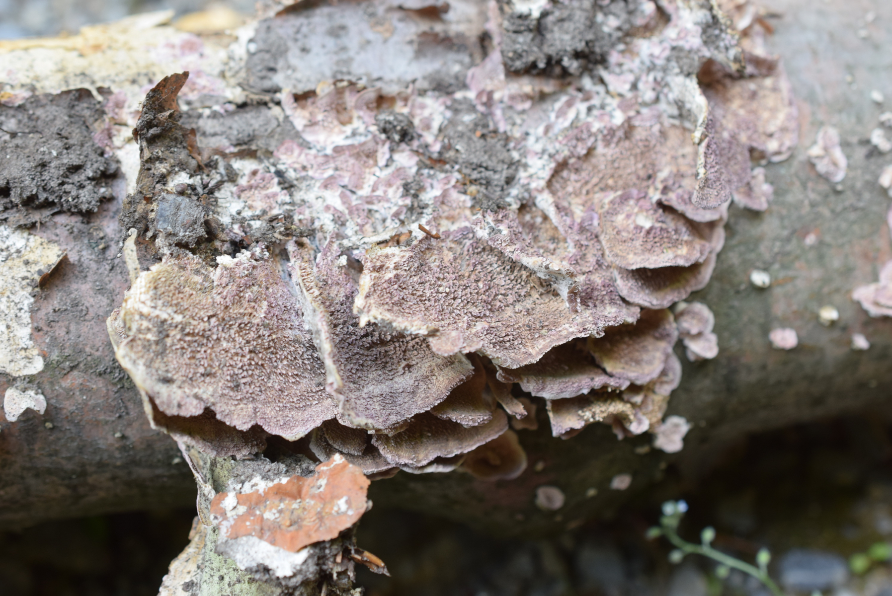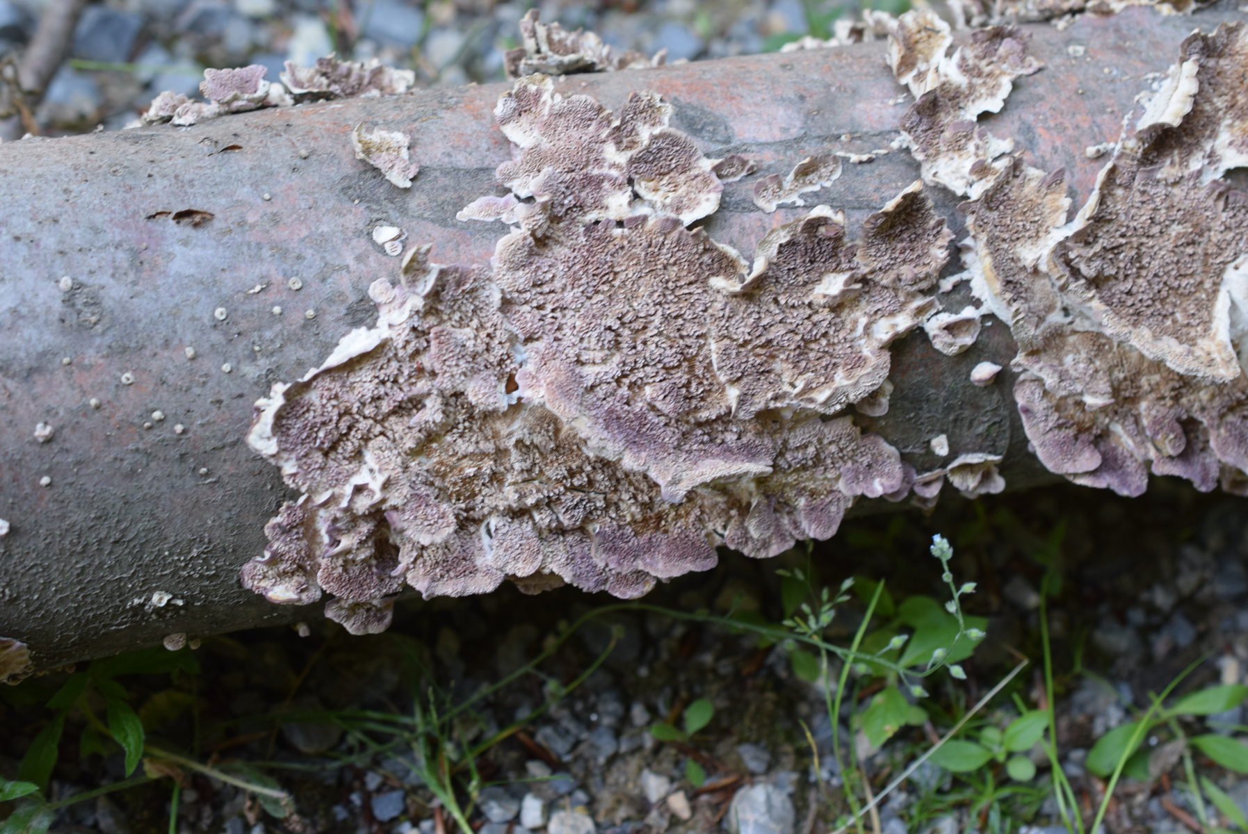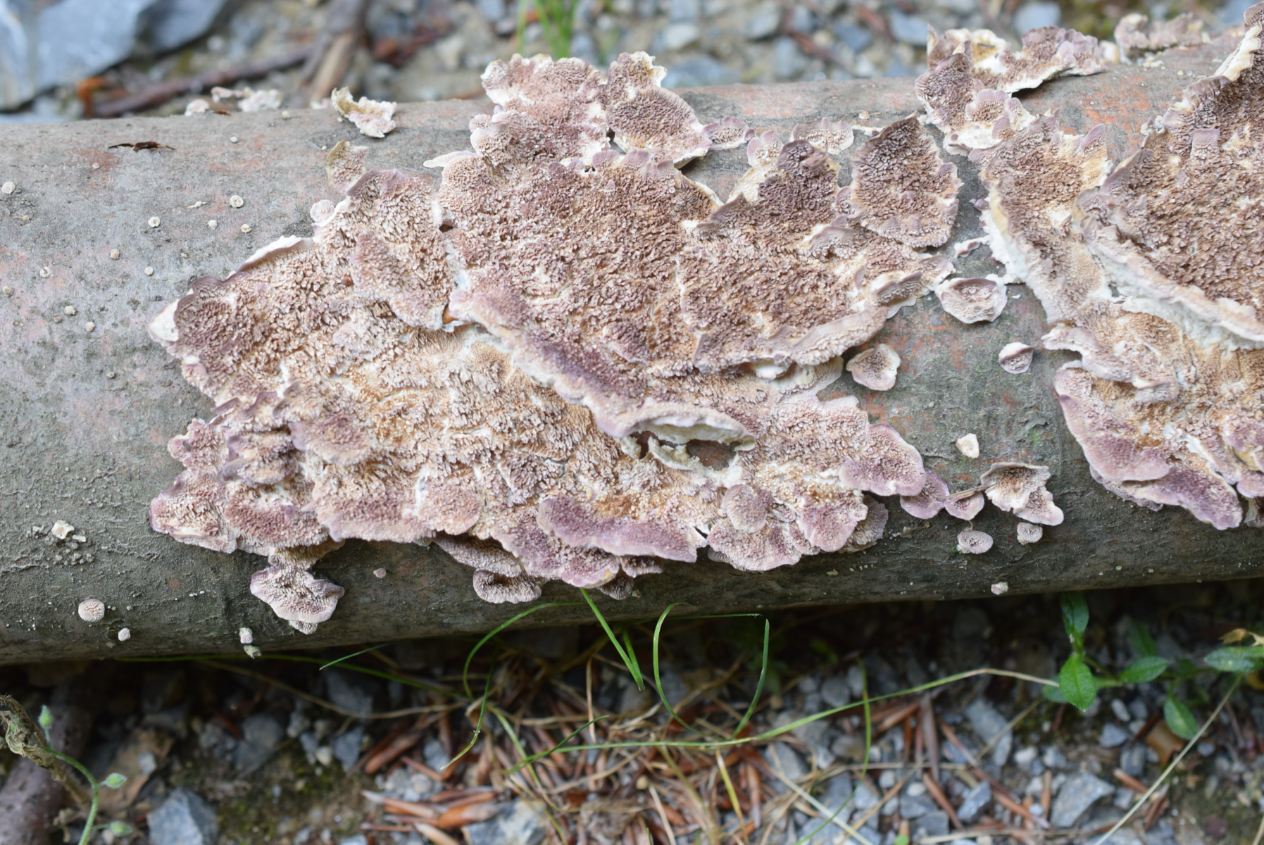 Frk. mit starke trockenschaden sehr Intensive Blautöne aber kaum zu erkennen ( aus Hand gut zu sehen ) Für Chondrostereum purpureum viel zu ungewöhnlich weil hat bei manche Frk. stacheln usw. Auch für Trichaptum etwas ungewöhnlich , einfach hab keine Idee