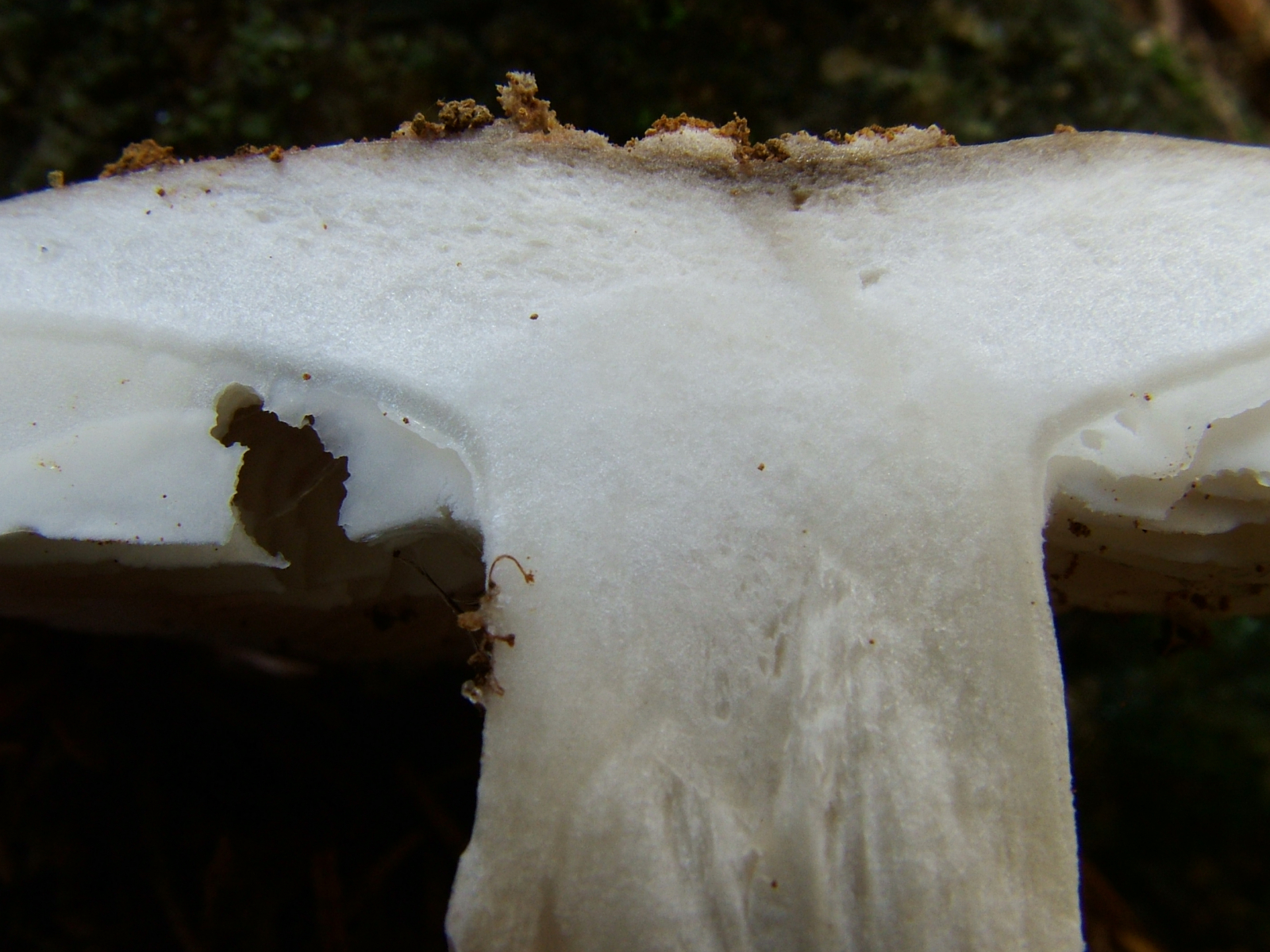 Das ist ein Grauer Wulstling, Amanita excelsa. Wo hat der freie Lamellen? Eben. Man sieht aber sehr schön die Sollbruchstelle, die halbkriesförmig das Stiel- vom Hutfleisch trennt (Fleischkonsistenz ist anders - im oberen Stiel sind Kugelzellen wie bei Täublingen, daher ist das Fleisch hier homogener als im Hut.