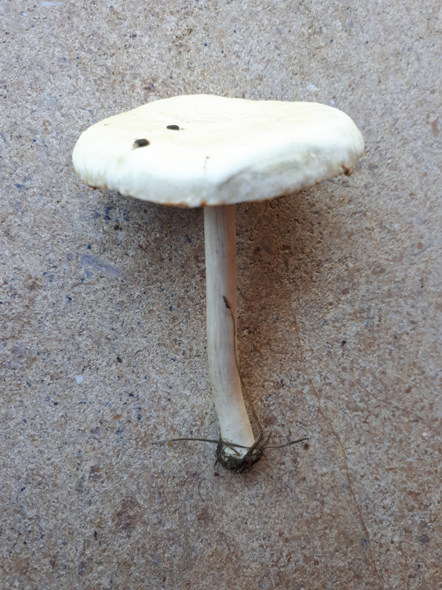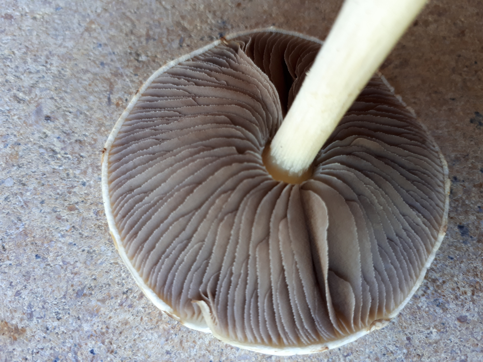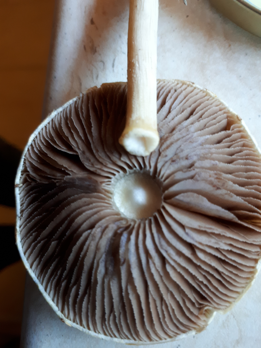 Gefunden auf einer Rasenfläche am Straßenrand. Es standen auch noch mehrere dort (ältere Exemplare hatten sich schon bräunlich verfärbt). Leider habe ich mir die nicht soo genau angeschaut, weil ich dachte, dass es ein "langweiliger" Ackerling ist. Zu Hause sind mir dann die frei stehenden Lamellen mit dem leicht ablösbaren Stiel (s. Foto) aufgefallen. Deshalb dachte ich zunächst an etwas aus der Zwerg-Champignon-Ecke, aber dann habe ich doch noch reingelinst und das sieht eher nach Ackerling aus. Gibt es also Ackerlinge mit so "frei stehenden" Lamellen?