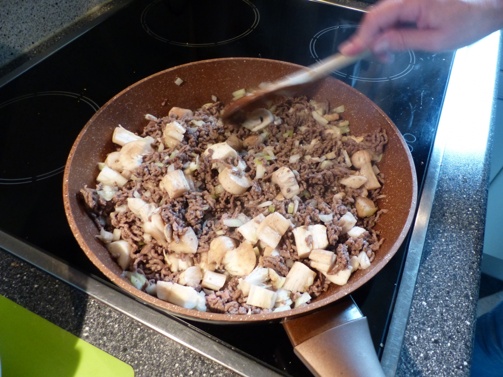 Für die Füllung die entnommenen Stiele zusammen mit Hackfleisch und Zwiebels anbraten.