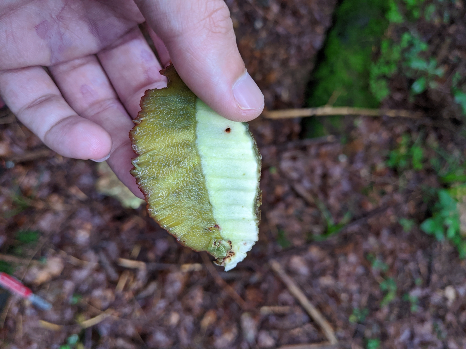 Da ich beiden möglichst in Ruhe ihr Leben geniessen lassen wollte, habe ich keine Fotos von der Unterseite des kleinen, bzw. nur ein Stück des Grossen abgeschnitten, um die Röhren und das Fruchtfleisch zu dokumentieren. Der Grosse hatte einen Hutdurchmesser von 21 cm, der kleine 5 cm.