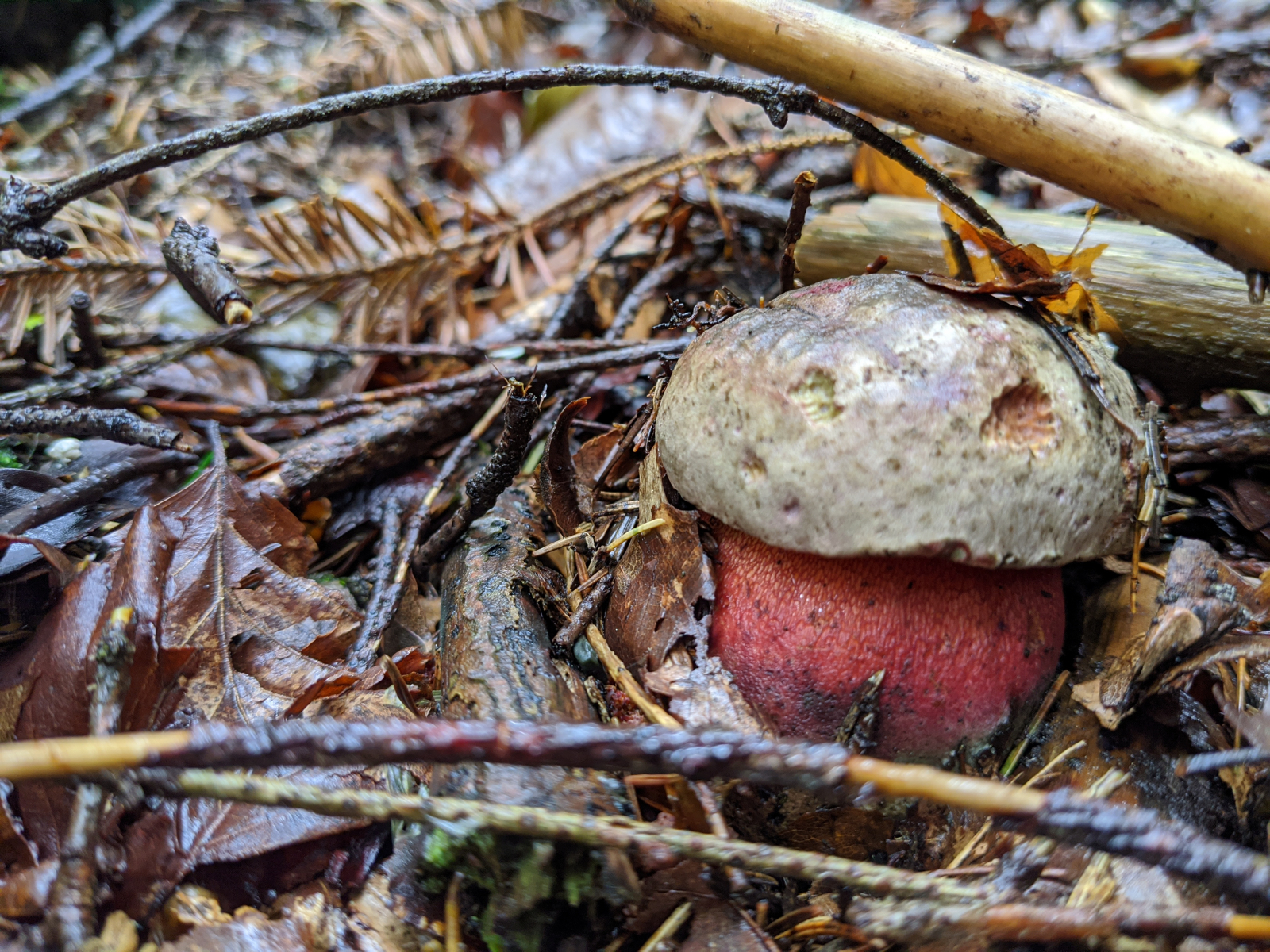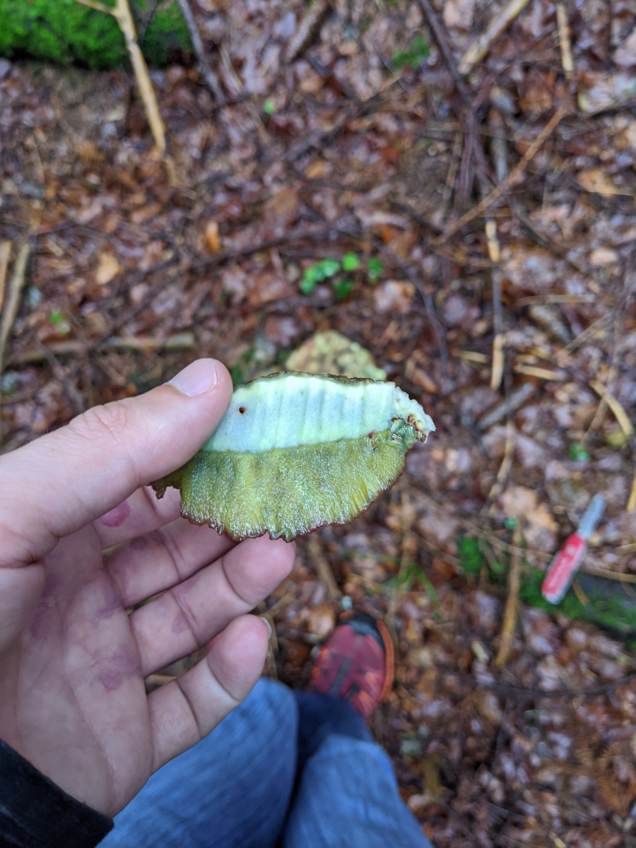 Rubroboletus rubrosanhuineus sollte in dem Zustand insgesamt dunkler weinrothütig sein. Der blaut recht deutlich, aber auch im ganzen Fleisch.