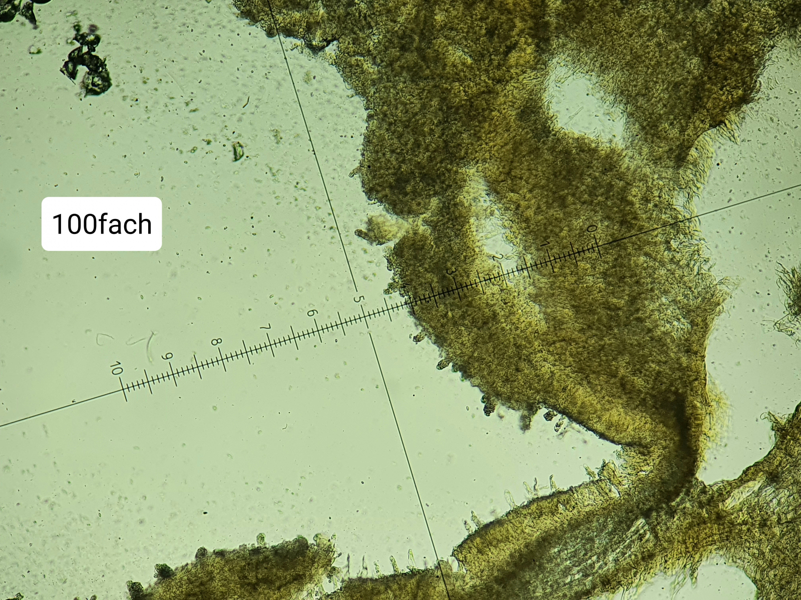 Etwas schwer einzuordnen finde ich die überstehenden Strukturen (ähnlich herausragend wie die Zystiden), welche etwa 15ym breit sind und von der Struktur an "Himbeeren" erinnern. Ich weiß nicht genau, ob es sich hier vielleicht um Zystiden handelt, an denen sich einfach Sporen abgelagert haben. Dafür finde ich sie jedoch aus meiner Sicht zu regelmäßig. In der hundertfachen Vergrößerung sieht man beide Strukturen (Zystiden unten am waagerechten Teil, "Himbeeren" rechts am senkrechten Teil)