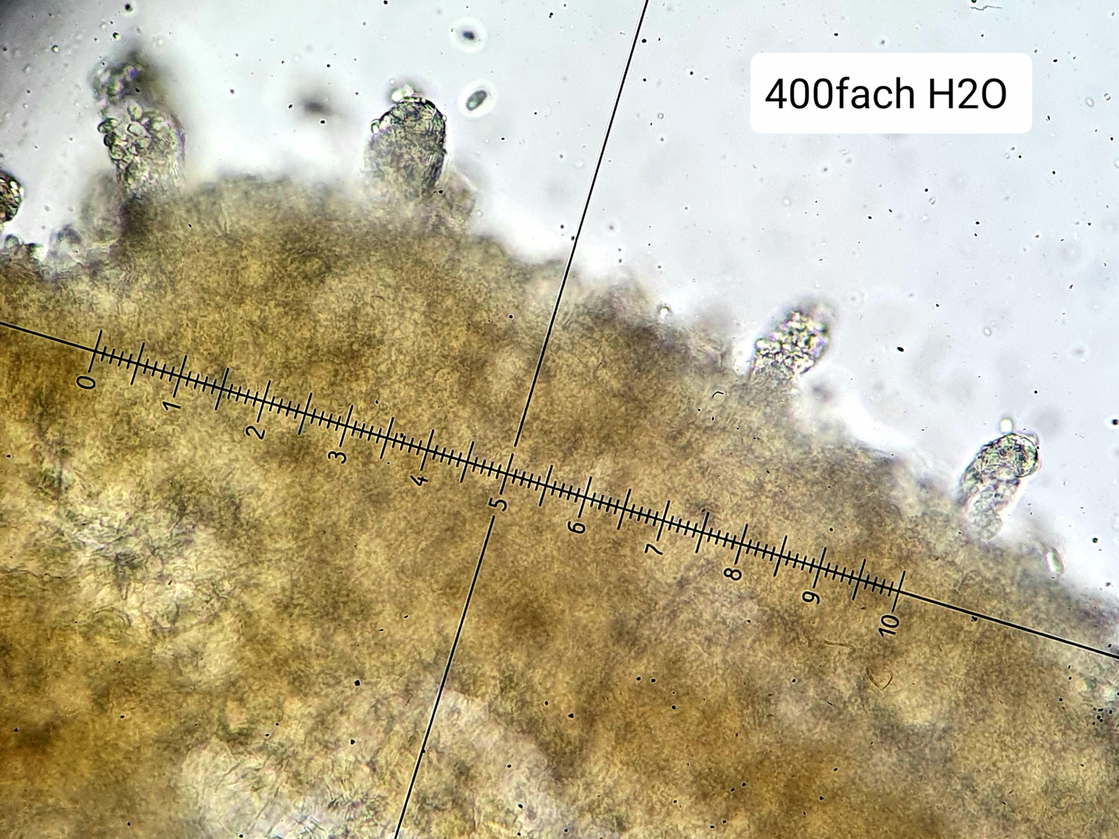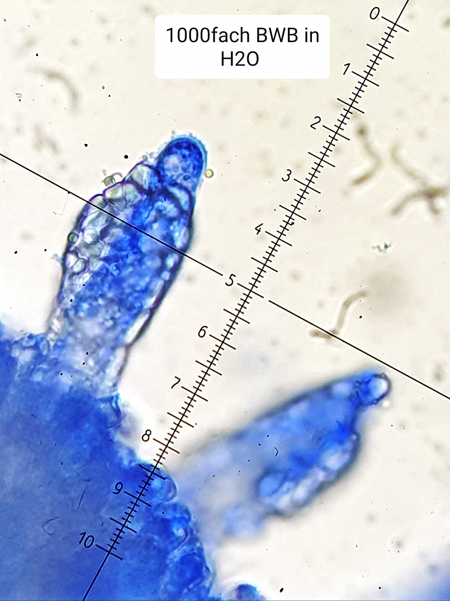 Also, ich habe das Ganze jetzt nochmals in etwas verdünntem BWB angefärbt und dann in H2O mikroskopiert. Für mich sieht es so aus, als wüchsen die Sporen an diesen Zystiden wie Trauben. Kann das sein?