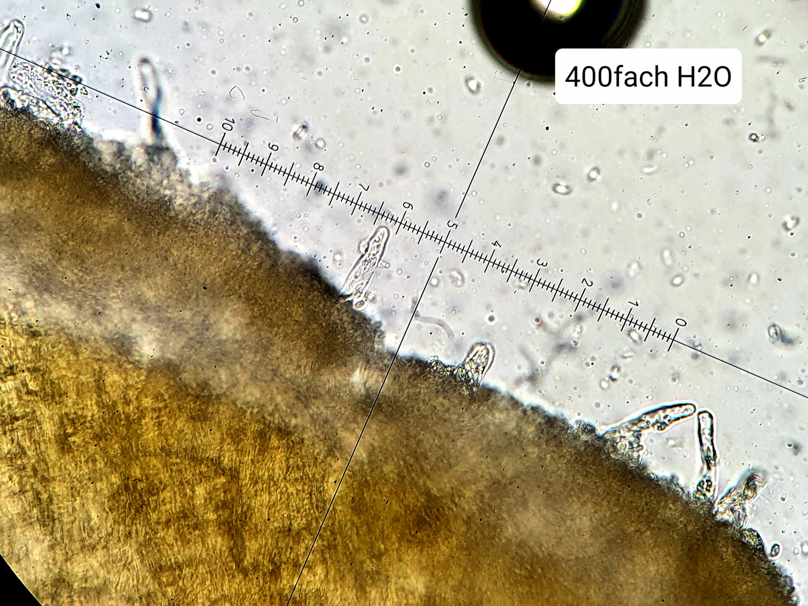 Geht man näher heran (400-fach) so erkennt man wie ich finde sehr gut, dass die Zystiden von diesen "Trauben" (Sporen?) "ummantelt" werden. An einigen haben diese sich bereits (teilweise) abgelöst.