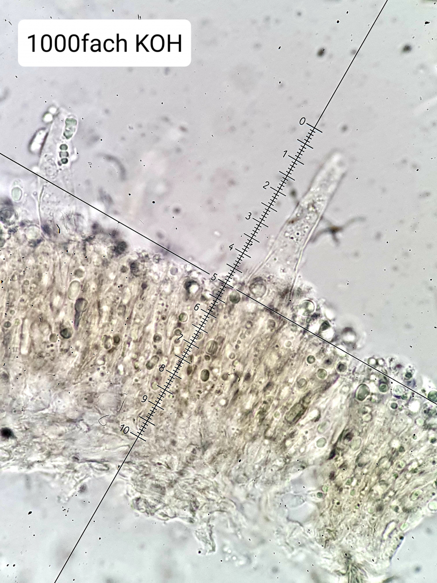 ).Es zeigen sich aber definitiv unregelmäßig angeordnet zahlreiche Zystiden in der entsprechenden Form und in der "Fläche".