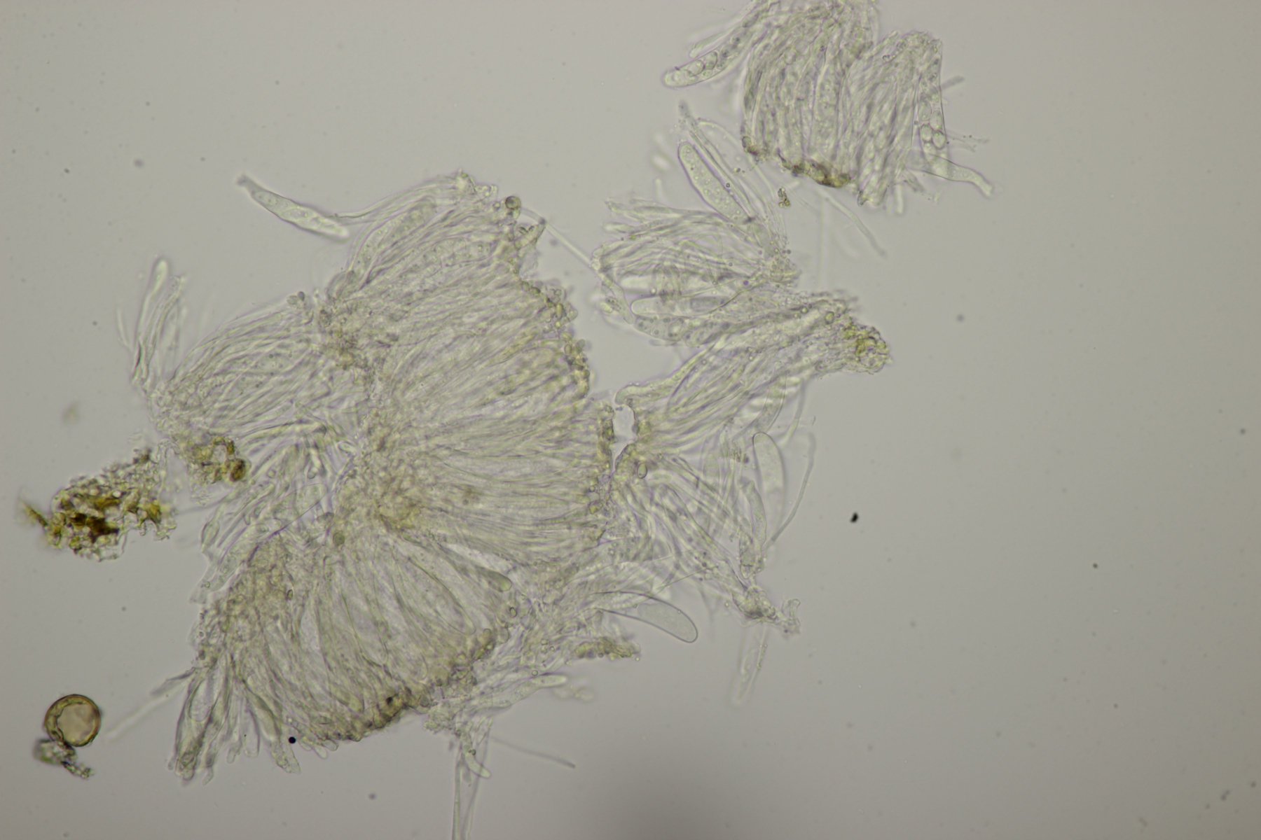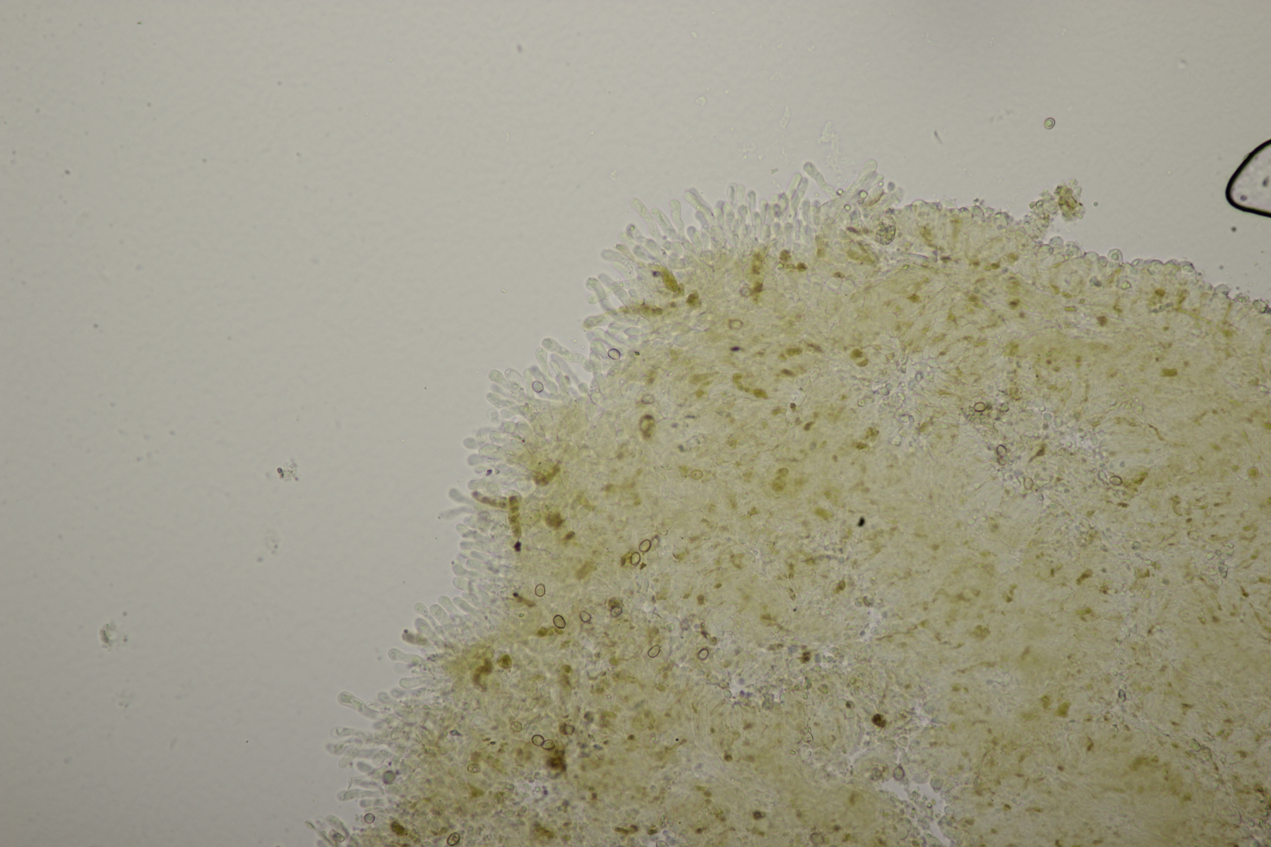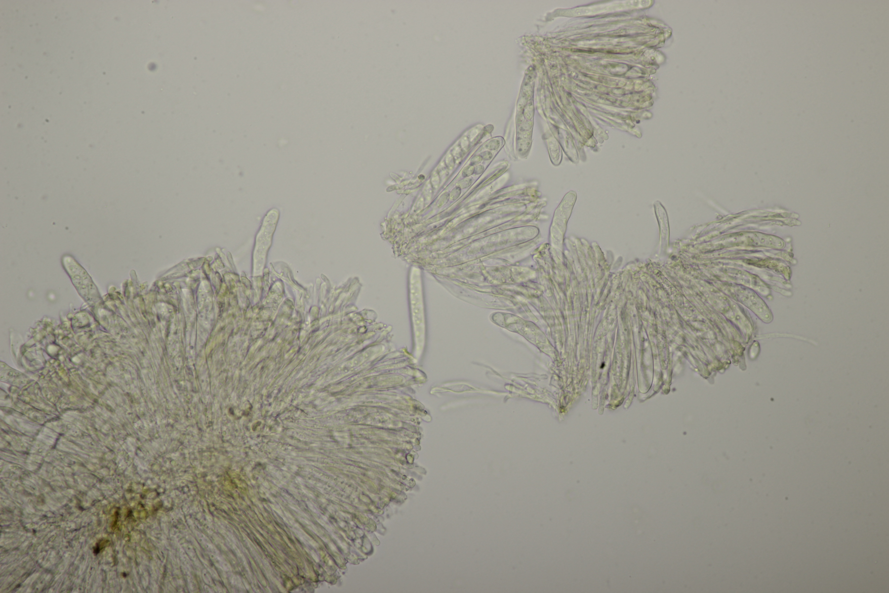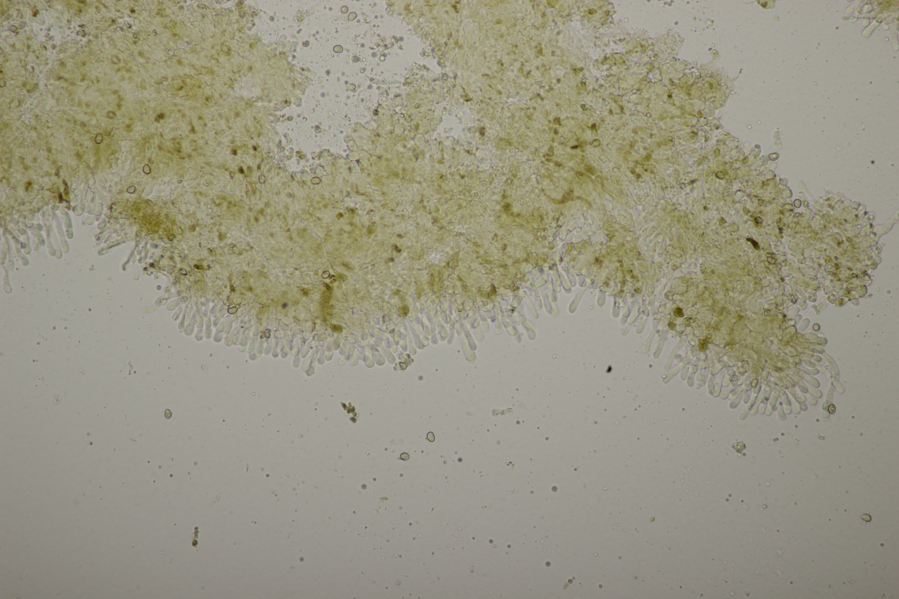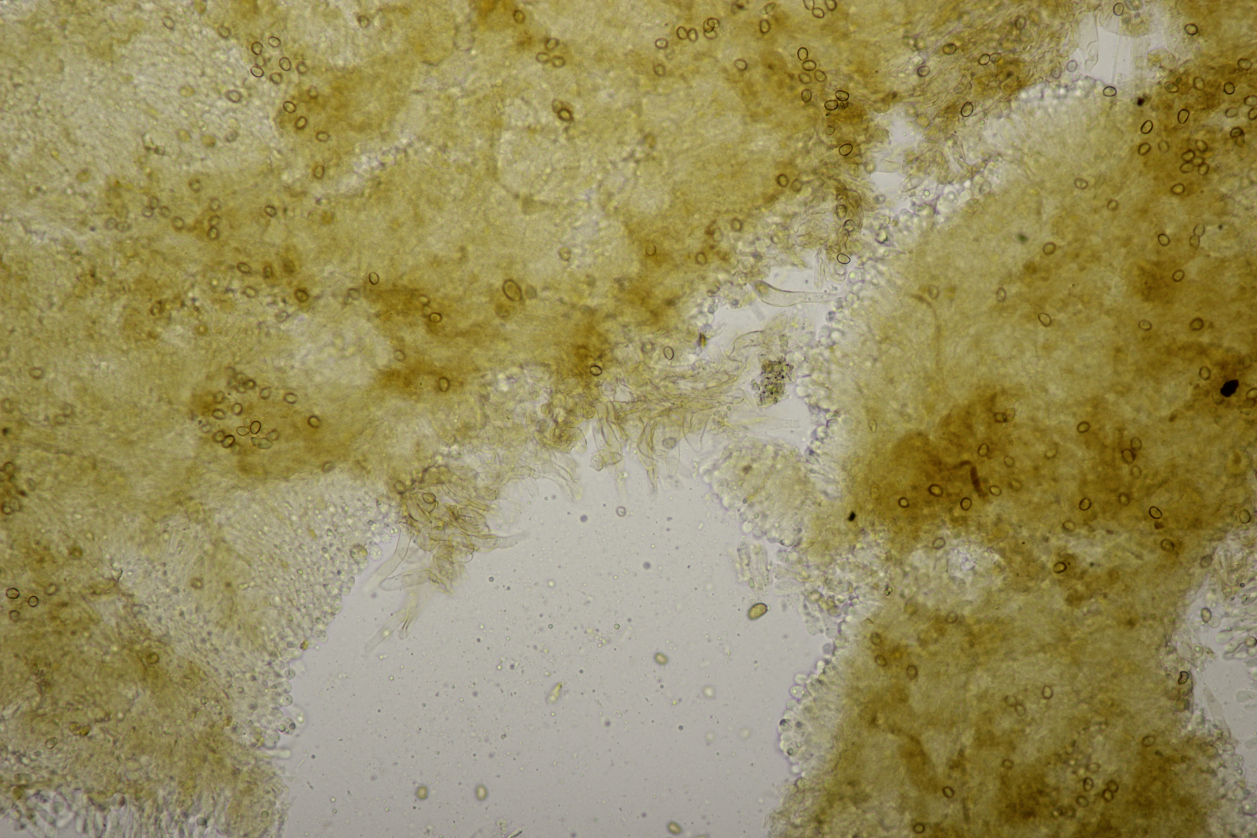 1. Simocybe sp. Leider unterwegs vertrocknet, so daß da im Mikroskop nicht mehr viel zu holen war. Außerdem stellt sich die Frage, womit schlüsseln. Gröger hat Simocybe nicht drin und verweist auf den Ludwig. Funga Nordica hat auf Holz nur 2 Arten...