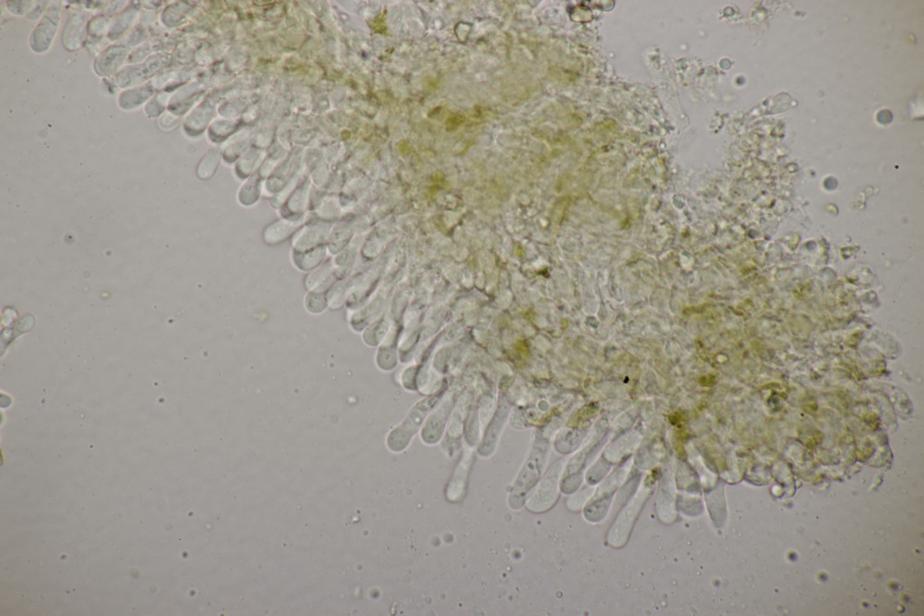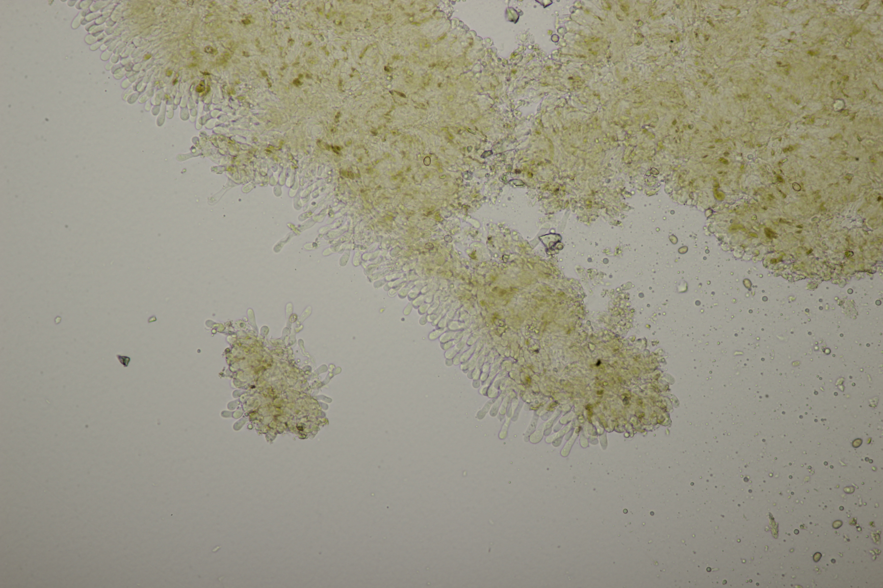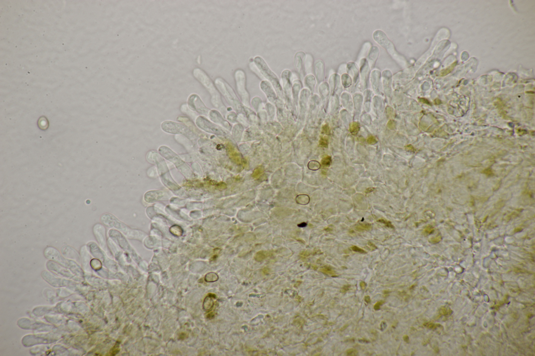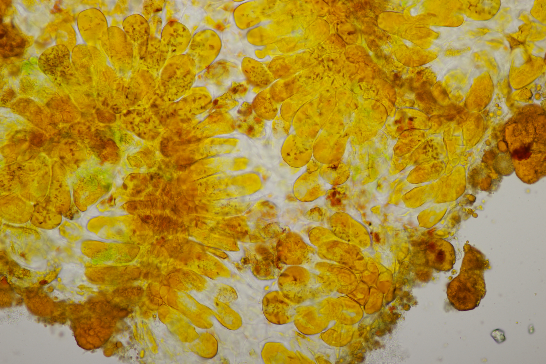 1. Simocybe sp. Leider unterwegs vertrocknet, so daß da im Mikroskop nicht mehr viel zu holen war. Außerdem stellt sich die Frage, womit schlüsseln. Gröger hat Simocybe nicht drin und verweist auf den Ludwig. Funga Nordica hat auf Holz nur 2 Arten...