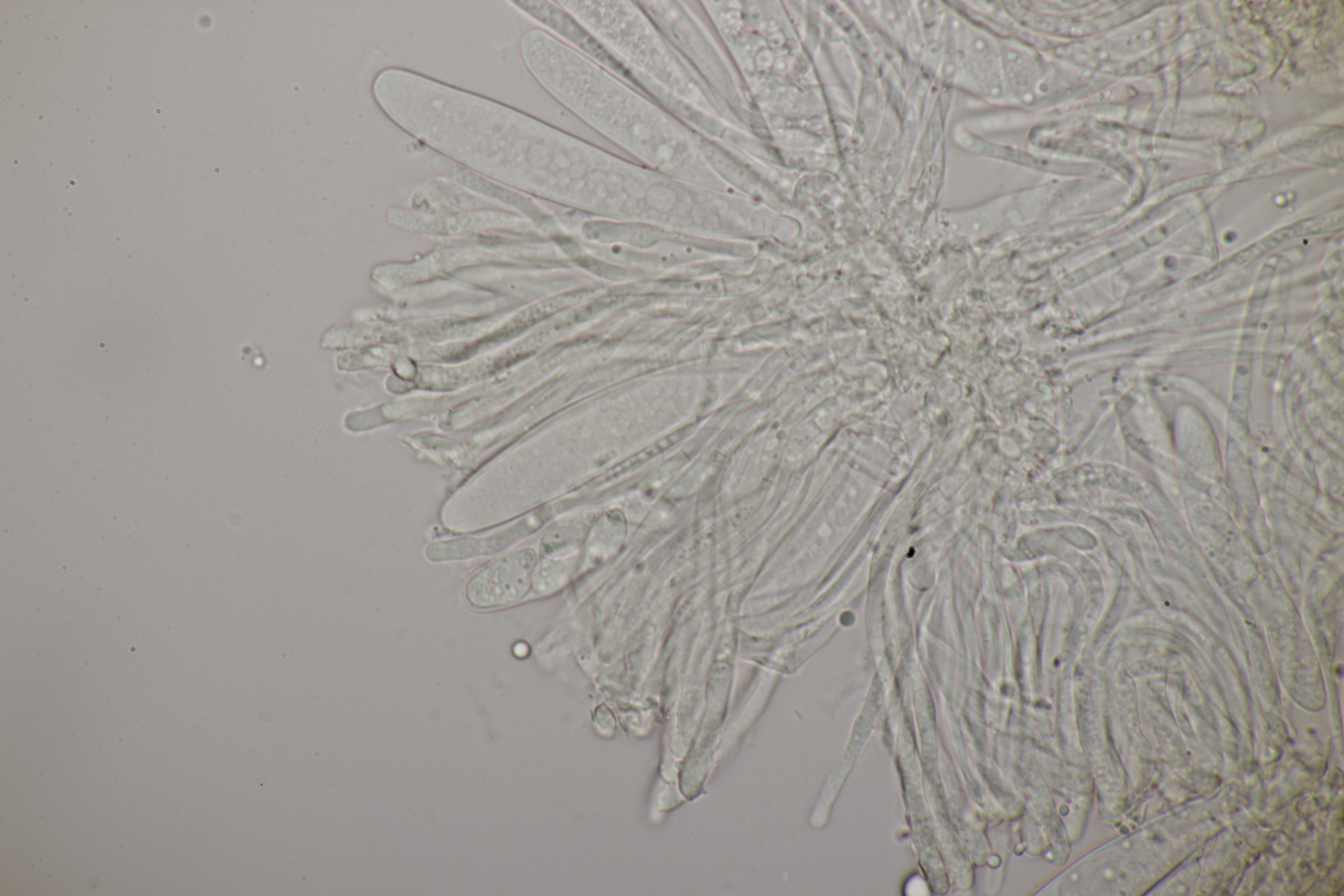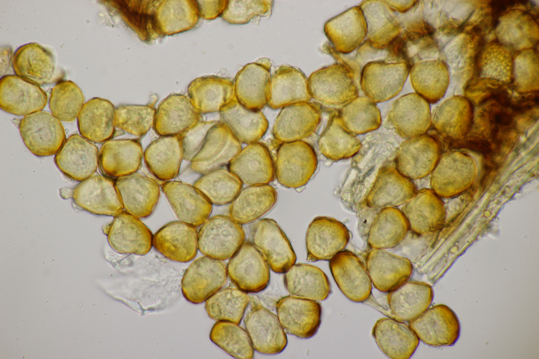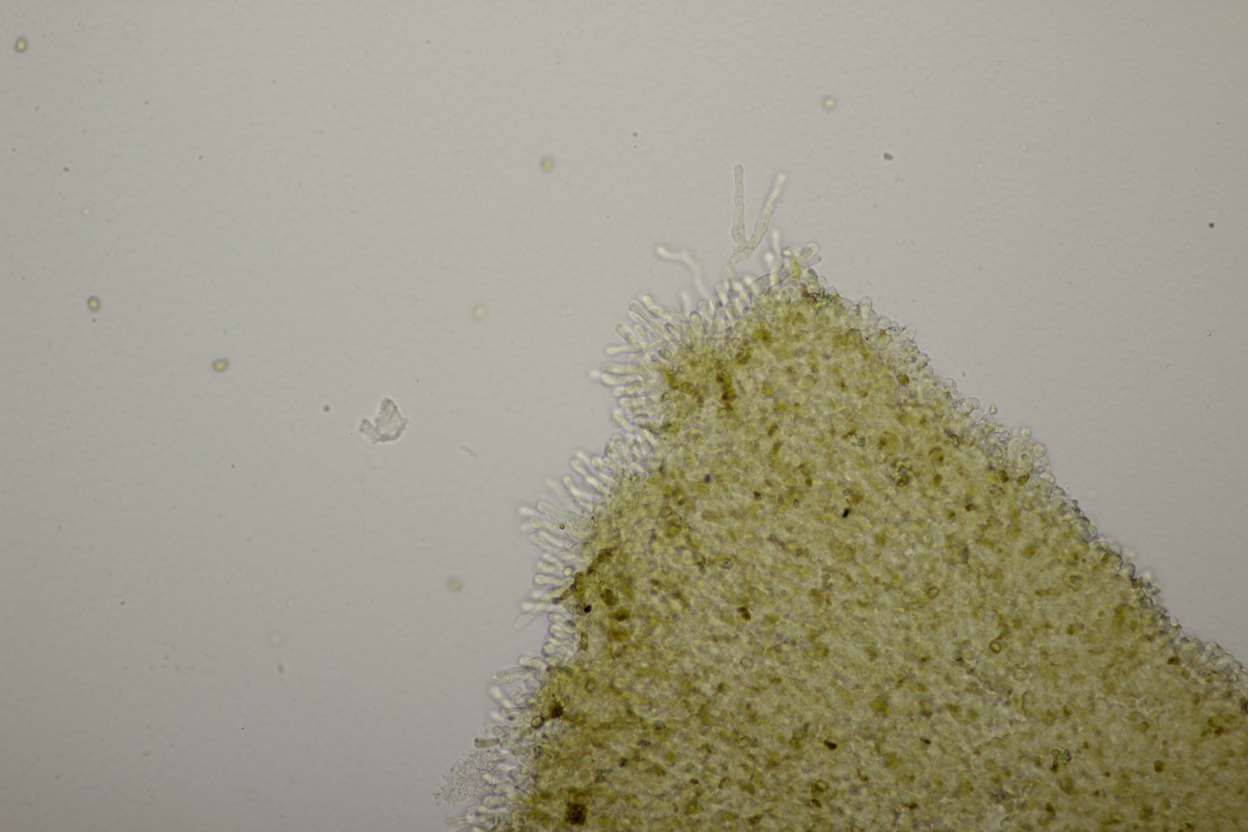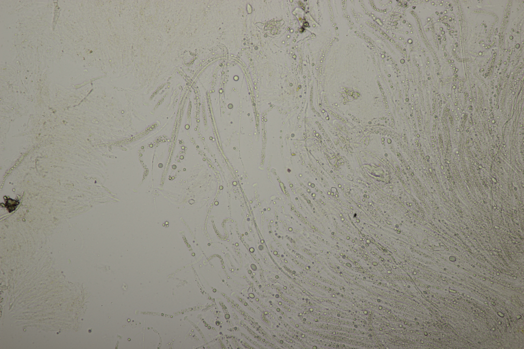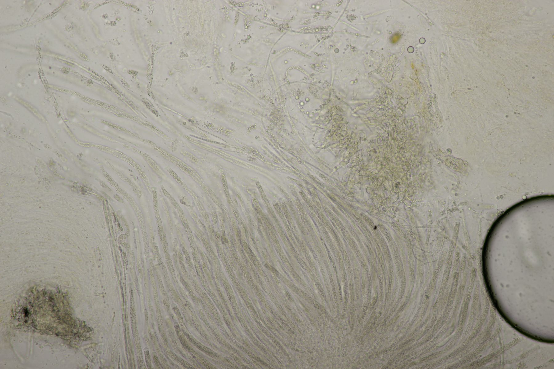 1. Simocybe sp. Leider unterwegs vertrocknet, so daß da im Mikroskop nicht mehr viel zu holen war. Außerdem stellt sich die Frage, womit schlüsseln. Gröger hat Simocybe nicht drin und verweist auf den Ludwig. Funga Nordica hat auf Holz nur 2 Arten...