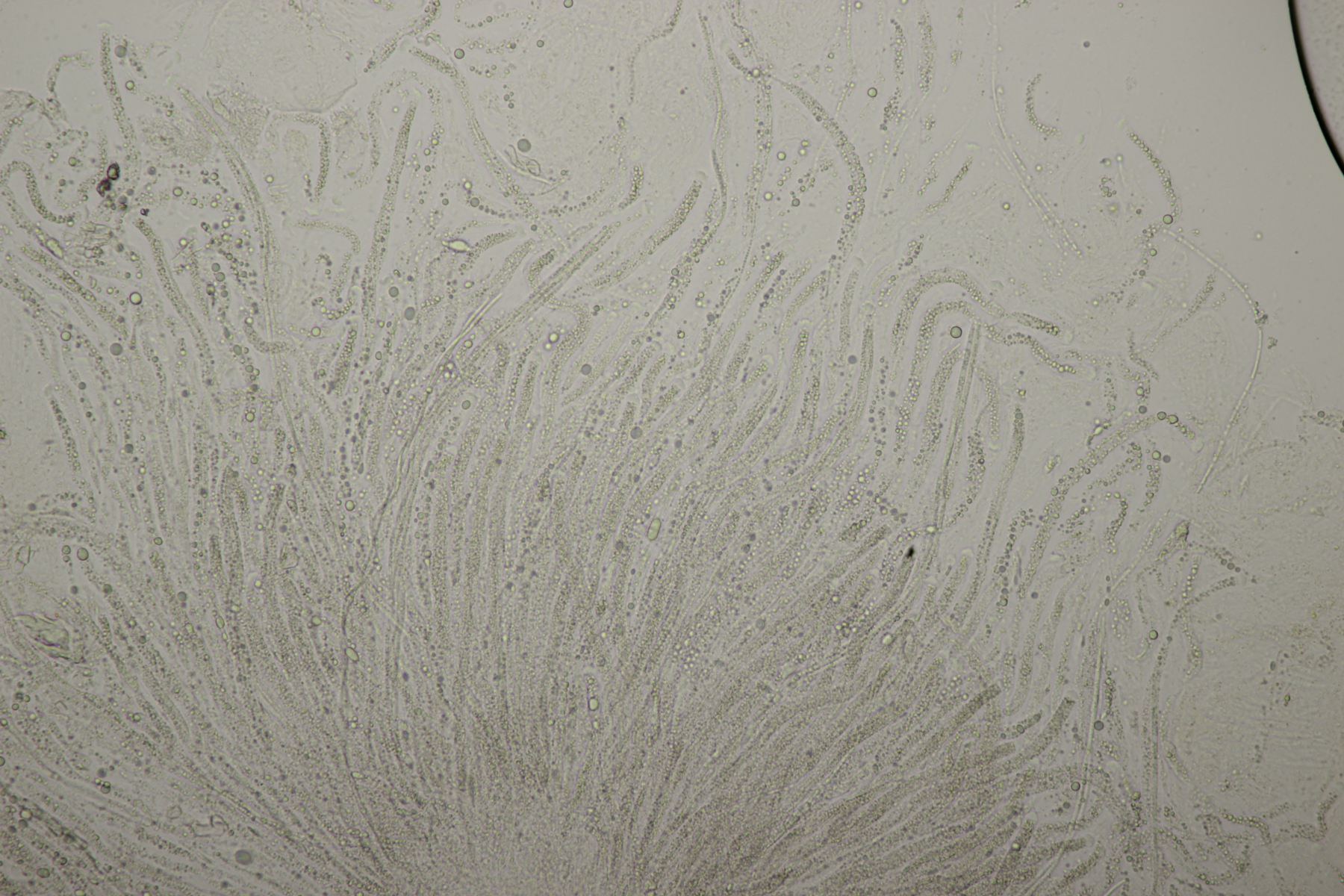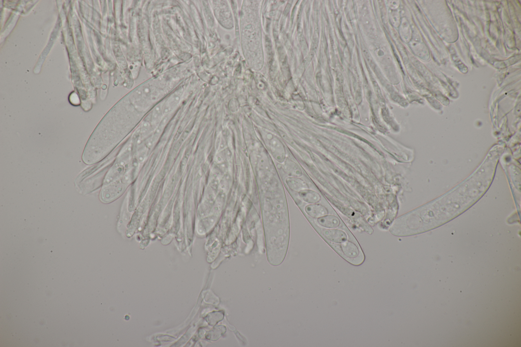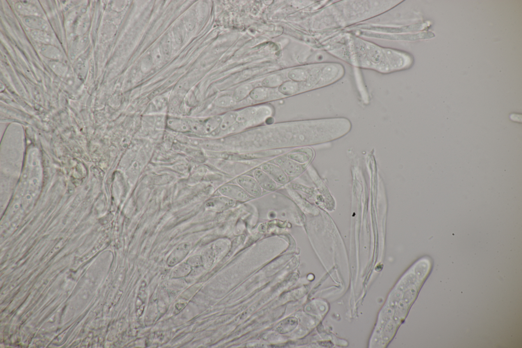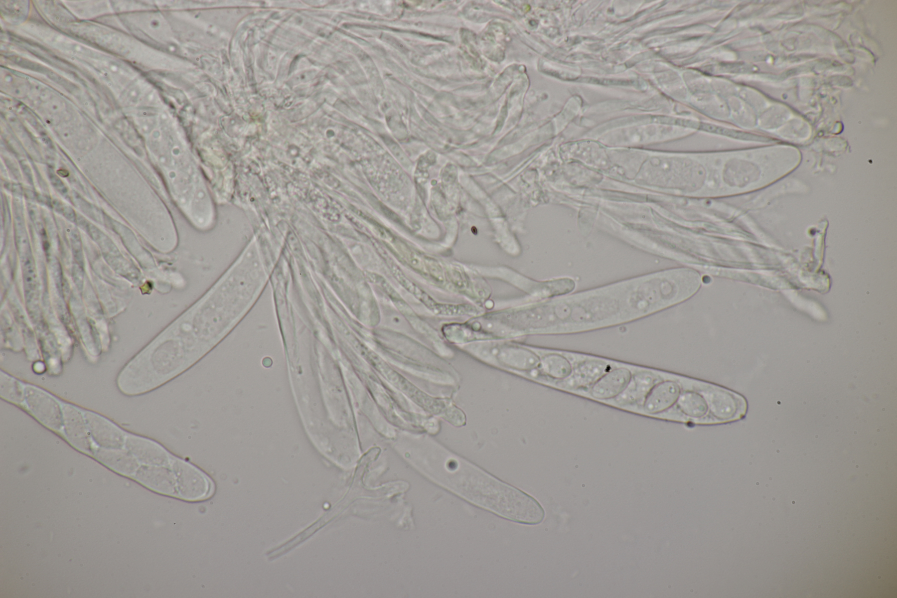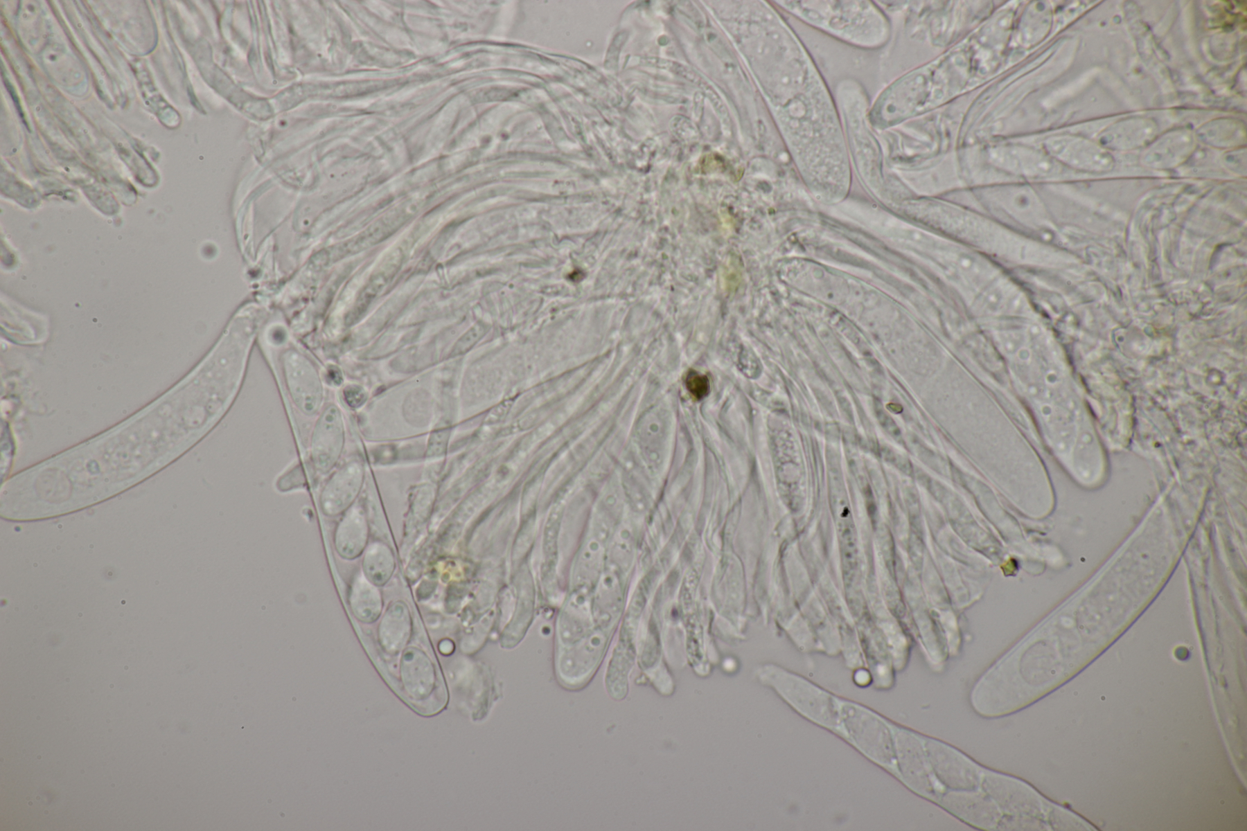 1. Simocybe sp. Leider unterwegs vertrocknet, so daß da im Mikroskop nicht mehr viel zu holen war. Außerdem stellt sich die Frage, womit schlüsseln. Gröger hat Simocybe nicht drin und verweist auf den Ludwig. Funga Nordica hat auf Holz nur 2 Arten...