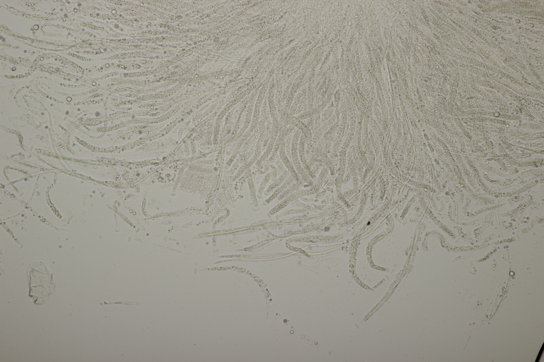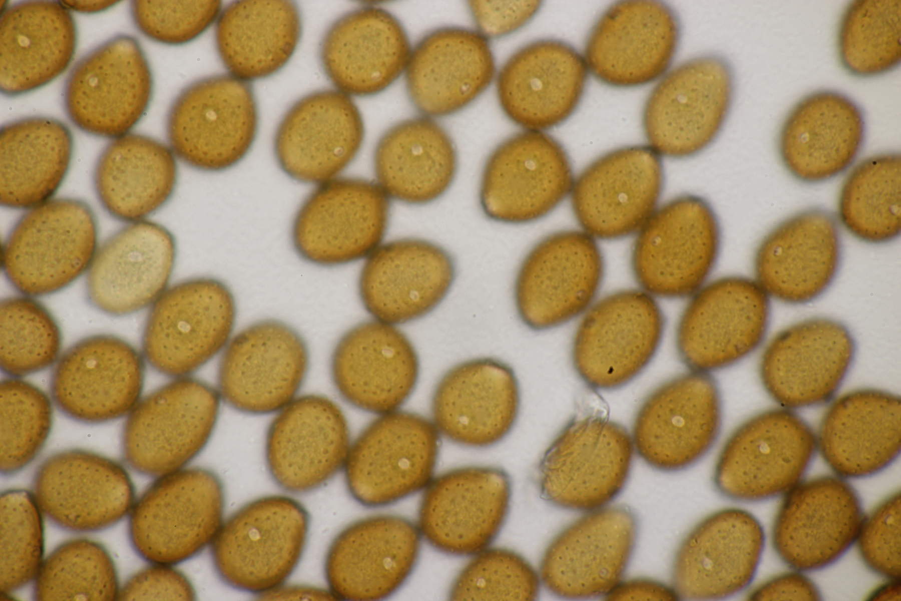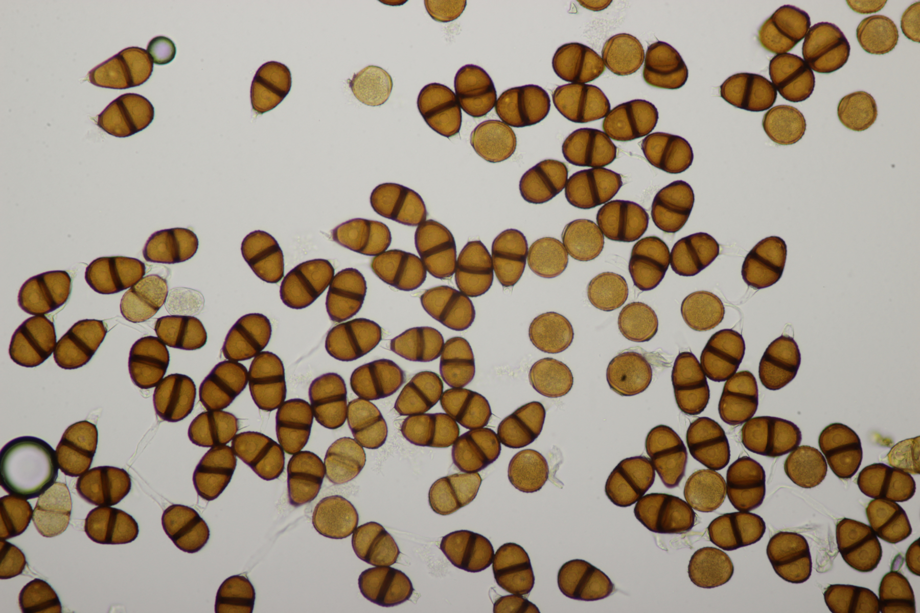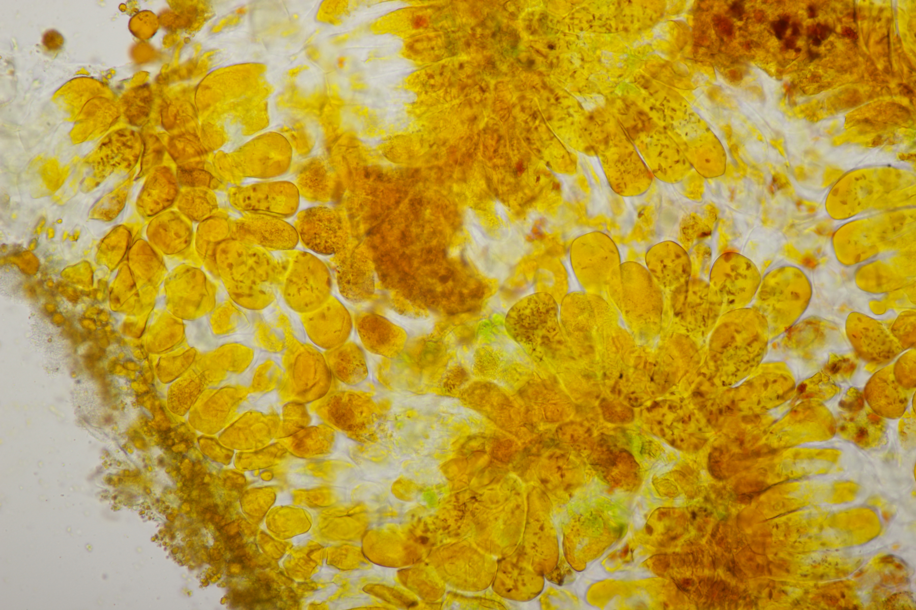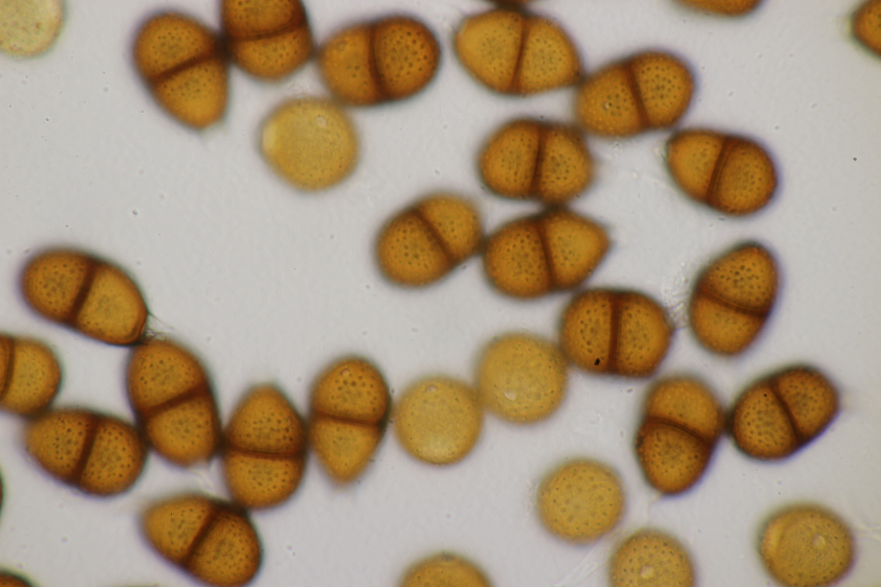 1. Simocybe sp. Leider unterwegs vertrocknet, so daß da im Mikroskop nicht mehr viel zu holen war. Außerdem stellt sich die Frage, womit schlüsseln. Gröger hat Simocybe nicht drin und verweist auf den Ludwig. Funga Nordica hat auf Holz nur 2 Arten...