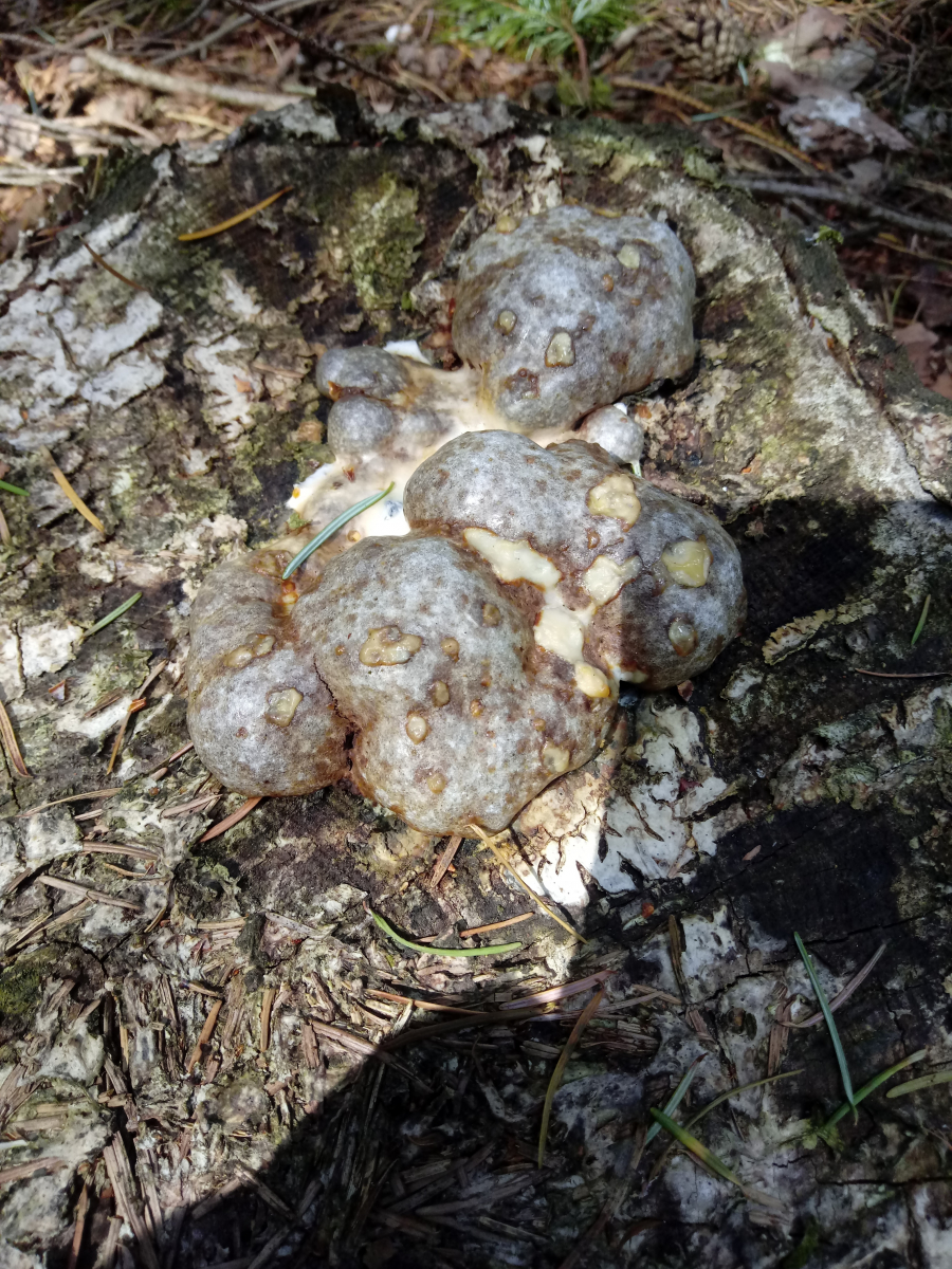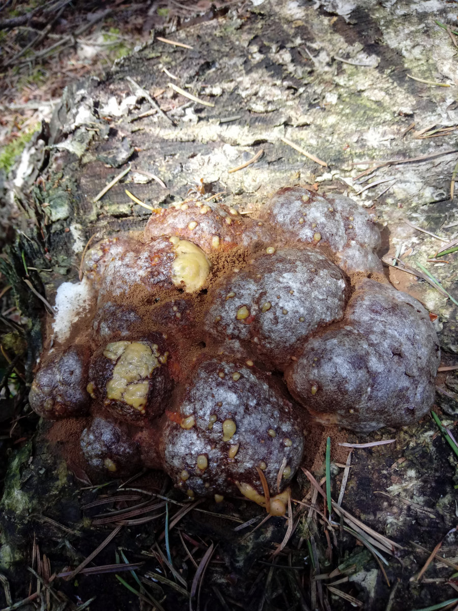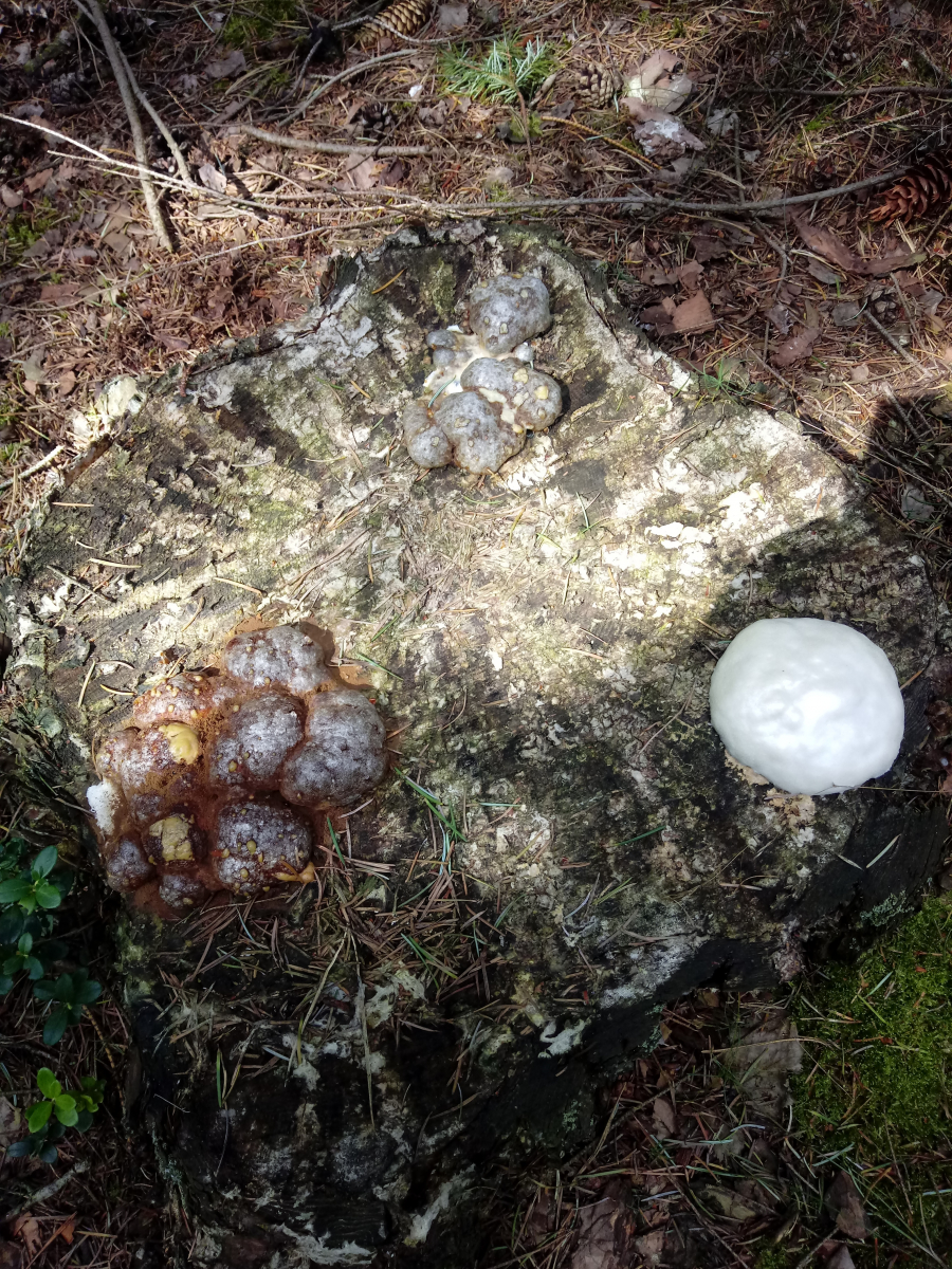 Eigentlich wollte ich Heidelbeeren sammeln,hab dann aber dieses ominöse Gepilz entdeckt. Wie es aussieht,sind da 3 Alterungsstufen zu sehen.Der älteste ist nurnoch eine braune Trockenmasse von der Konsistenz alten Bauschaums...voller kleiner schwarzer Käfer.