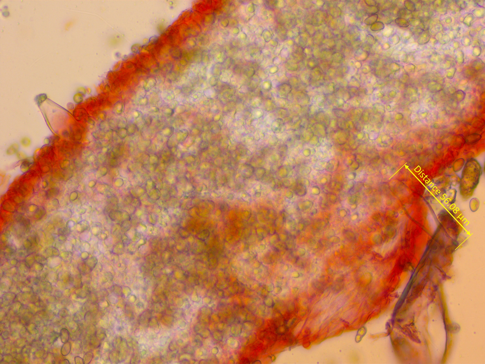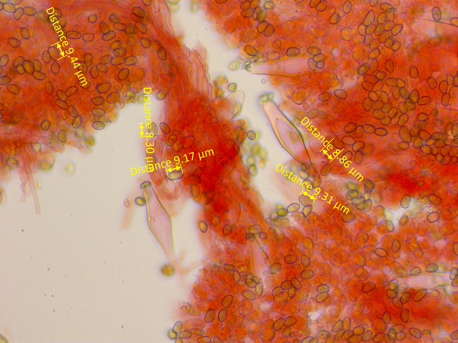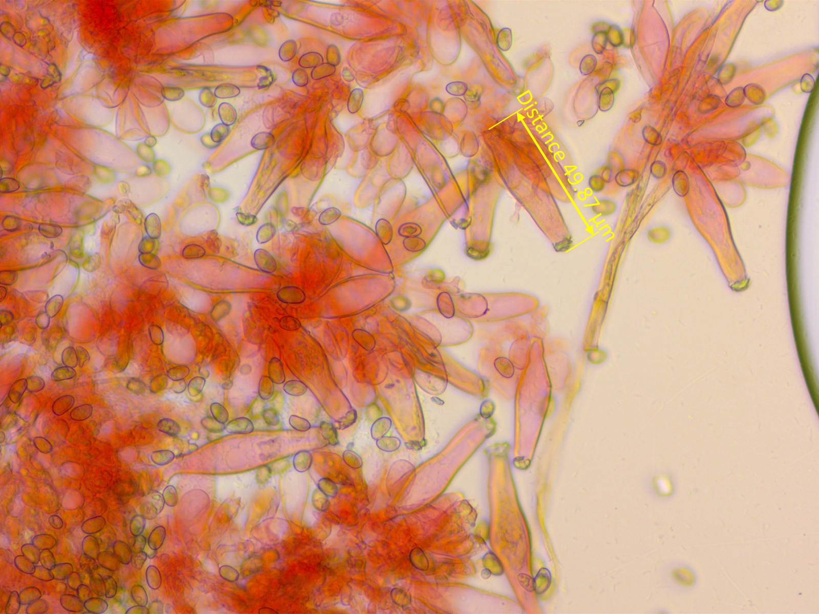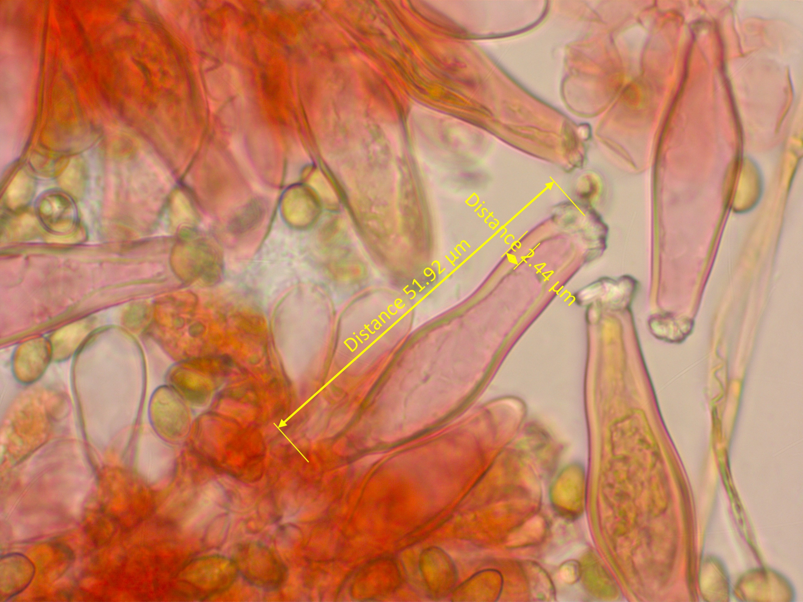 3. Stets ebenfalls etliche Zystiden messen (ich messe 15) und einen Mittelwert ausrechnen. Und schauen, was die charakteristische Form ist - also welche wiederholt sich am meisten. Das zu beurteilen ist, denke ich, für Anfänger in der Gattung mit das Schwierigste.