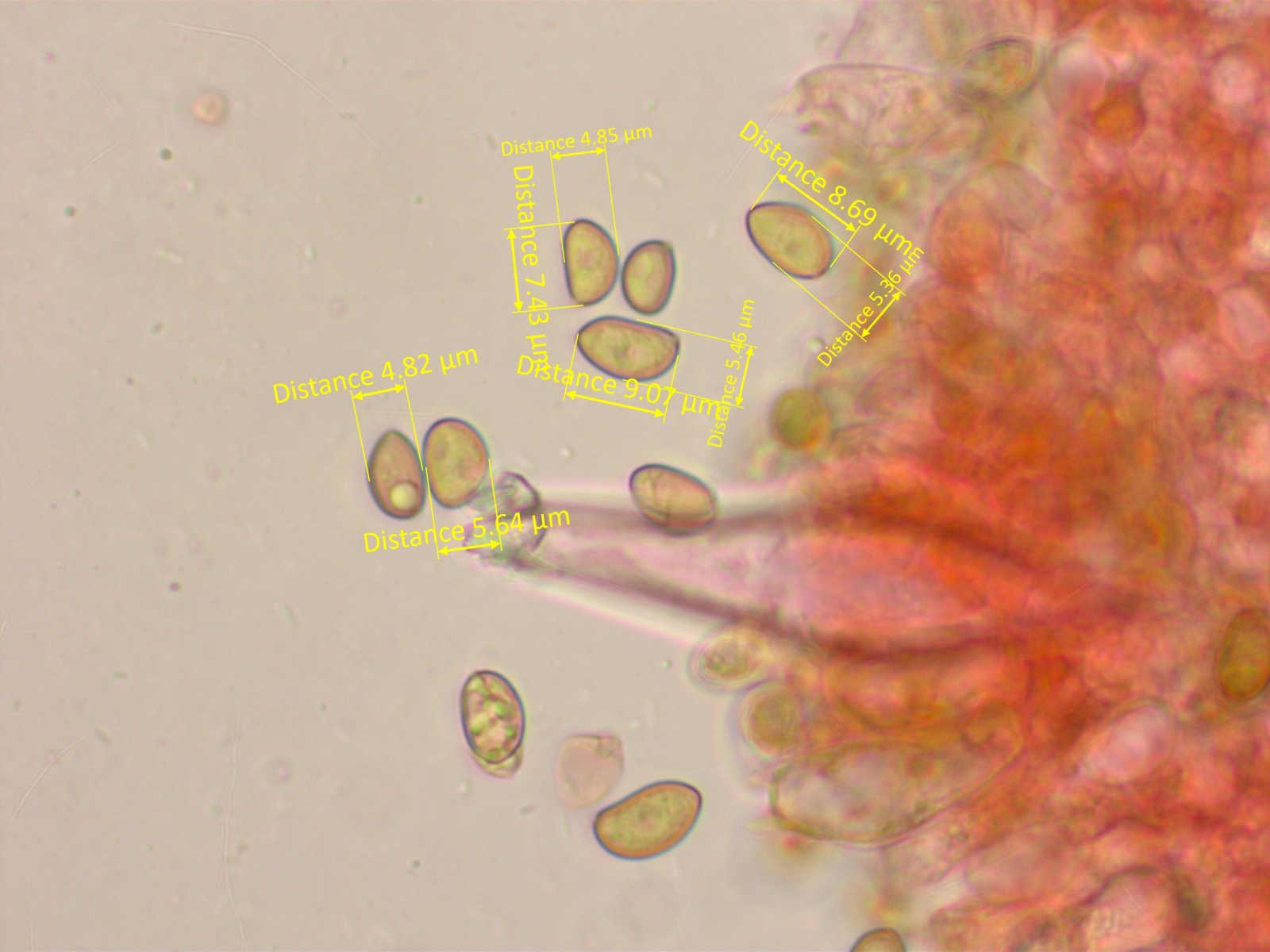 2. Stets mindestens 20 Sporen messen und einen Mittelwert ausrechnen (ich selbst messe immer 40 Sporen). Nur damit bekommt man einen guten Eindruck, was nun typisch für die Art ist. Ausreißer nicht mitmessen, sondern notieren, dass es eben auch 2-sporige Basidien gibt.