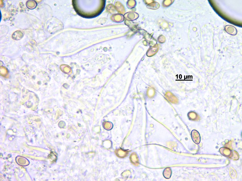 Sie sollte eigentlich auch unten zumindest vereinzelte dickwandige Caulozystiden haben, das könntest du nochmal überprüfen. Und: Die Sporen müssten im Durchschnitt kürzer als 9 µm sein und im Schnitt um 5.5 µm. Wenn es ein wenig mehr oder weniger ist, macht es nichts. Aber ungefähr muss es schon stimmen. Und schau doch mal, ob du nicht noch ein paar längere und wellige Caulozystiden findest - ganz oben am Stiel.