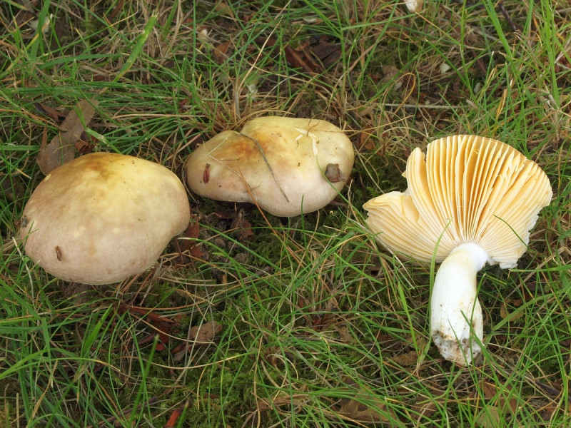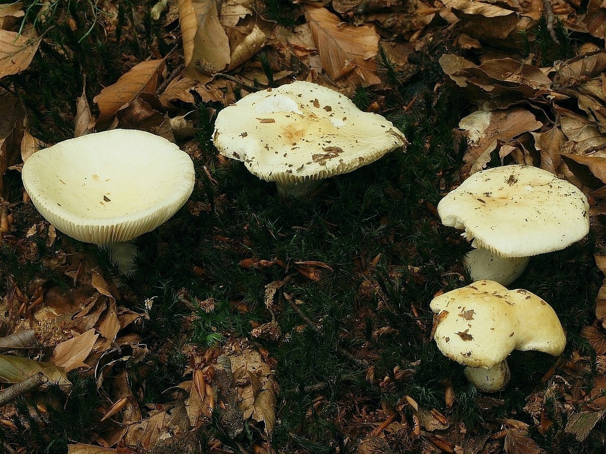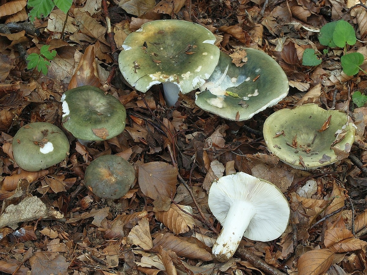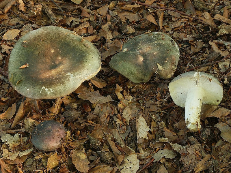 Selten habe ich so viele Frauentäublinge gesehen und man hätte mehrere Körbe füllen können was wir uns allerdings verkniffen haben. Das hätte angesichts diverser rothütiger und weitere Arten, die einige Bestimmungsarbeit erforderten, einfach zuviel Zeit gekostet. Auffallend war, dass nahezu ausschließlich Grüntöne dominierten und man musste immer wieder prüfen, ob die Lamellen wirklich speckig waren oder ob sich andere Arten wie der Grüne Speisetäubling (R. heterophylla) dazwischen befanden. Ich schreibe bewusst nicht elastisch, da es einige Arten ohne splitternde Lamellen gibt, die häufiger für Frauentäublinge gehalten werden. Beim Frauentäubling kann man die Lamellen unter dem Daumen zerquetschen und es fühlt sich fast an, als ob man über eine Speckschwarte reibt. Die grünen Formen wurden früher als Varietät pelteraui abgetrennt aber genetisch gibt es wohl keinen Unterschied zur Normalform.