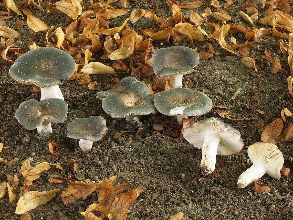 Dann gab es ein Massenvorkommen von ca. 150 Exemplaren des Blaugrünen Reiftäublings unter einigen Linden. In typischer Ausprägung mit vorhandenem Reif ist dieser milde Täubling mit blass cremefarbigem Sporenpulver oft gut anzusprechen. Ein wichtiges Merkmal ist das Fehlen jeglicher violettlicher Töne unter der Huthaut. Sicherheit bei der Bestimung geben oft erst die partiell netzigen Sporen. Beim Ausblassen von der Mitte her, aber manchmal auch von Beginn an, treten mehr Brauntöne in den Vordergrund Ähnlich ist R. plumbeobrunnea, jedoch in der ITS-Region identisch.