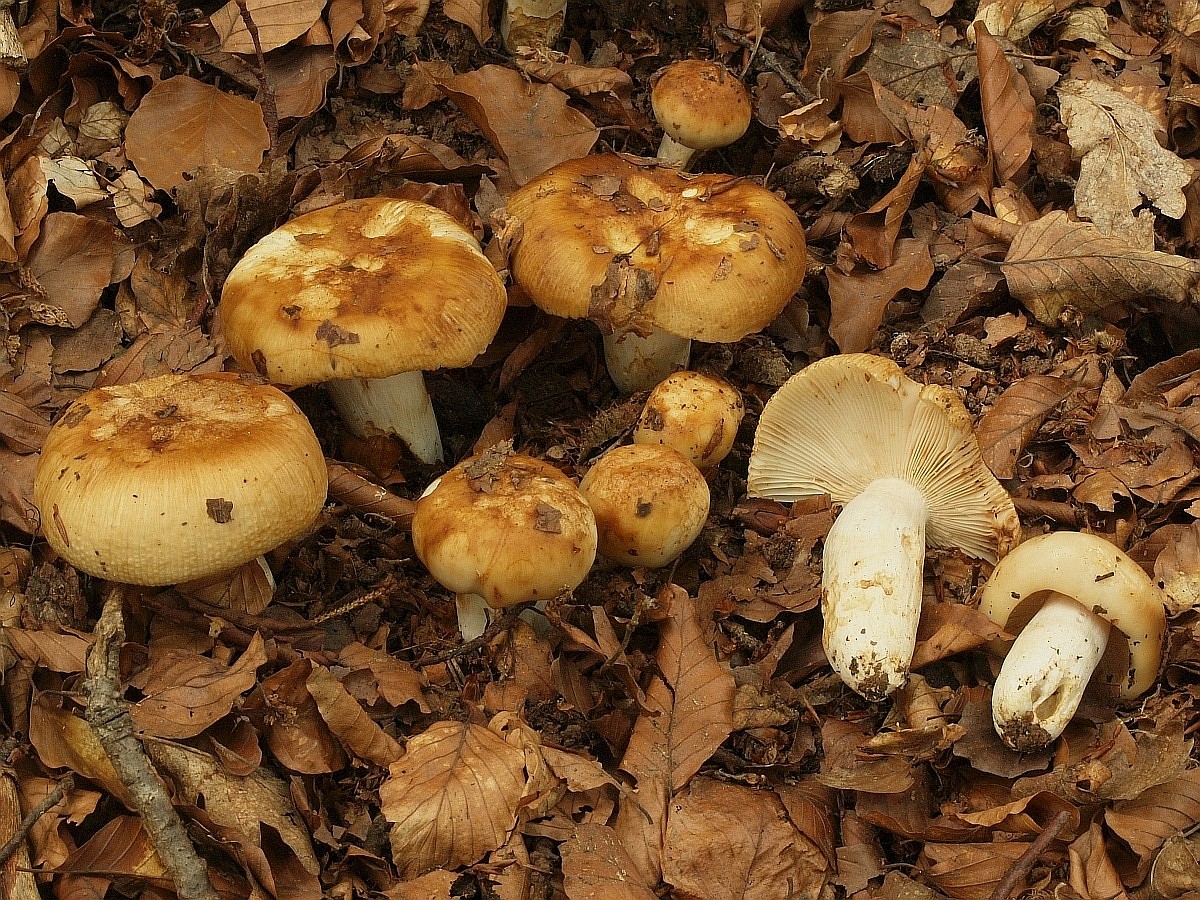 Weitere Arten an diesem Tag waren meist Einzelexemplare oder von Schnecken besuchte Fruchtörper und daher ohne Fotos. Frauentäubling (R. cyanoxantha), Papageientäubling (R. ionochlora). Wechselfarbige Dotter-Täubling (R. risigallina), Ockerblättriger Zinnobertäubling (R. pseudointegra) der bereits gezeigte Braune Camembert-Täubling (Russula amoenolens) und Russula cuprea agg.